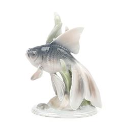 Красивая композиция изображающая золотую рыбку в водорослях. Прекрасный образец авторского немецкого фарфора стилистически ориентированного на продукцию Королевской фабрики в Копенгагене. Снизу на основании имеется подглазурная зеленая марка фарфоровой фабрики. Сверху две заглавные буквы HD, обозначающие инициалы автора данной скульптуры. Хорошая сохранность.