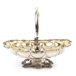 Замечательная старинная корзинка для хлеба и сладостей, созданная из царского серебра Г.А. Зольманом – русский мастер финского происхождения, обучавшийся в мастерского Эрнста Фока. Несмотря на то, что мастерская не являлась крупнейшей в Санкт-Петербурге, ее изделия пользовались популярностью, а ныне находятся в крупнейших музеях России, в том числе в Государственном Историческом музее. Изделие привлекает внимание необычным декоративным решением – комбинация старинного скандинавского плетеного и русского ложковидного орнамента, дополненная растительными мотивами на ручке и ножках изделия. Красивое породистое золочение, родная удобная ручка. Представленный предмет станет приятным и красивым дополнением праздничного стола, уместным подарком, интересным решением для сервировки и украшением вашей коллекции. Хорошая сохранность, следы бытования. Антиквариат.