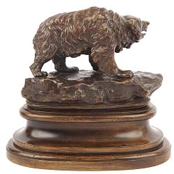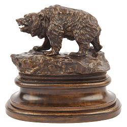 Замечательный образец камерной пластики изображает могучего медведя взошедшего на скалу. Автор скульптуры известный французский скульптор русского происхождения, Петр Николаевич Тургенев ( 1853 - 1912-г . г. ). Человек интересной судьбы, талантливый скульптор. Его отец Николай Иванович Тургенев ( 1789 - 1871 г. г. ) - известный государственный деятель, экономист, член декабристских организаций. В восстании 14 декабря 1825-го года участия не принимал, тем не менее был заочно судим и приговорен к пожизненной каторге. В 1857-м году был восстановлен в правах. Обращает на себя внимание, что рождение сына, будущего скульптора, состоялось в 1853-м году ( в Париже ), когда отцу шел 64-й год. Художественные таланты мальчика проявились рано, в 12-ть лет он становится учеником прославленного французского скульптора - анималиста Эммануэля Фремье. Петр Николаевич был частым экспонентом Парижского салона, получал престижные награды. Скульптор считался одним из ведущих мастеров по изображению конных групп. Так же создавал скульптурные образы деятелей русской культуры и искусства, в частности писателя И. С. Тургенева, с которым его связывали дружеские и родственные связи. В 1907-м году П. Н. Тургенев стал почетным членом Российской Академии Наук. Скульптура же медведя его работы встречается крайне редко. Один экземпляр хранится в музее «Собрание». Антиквариат. Хорошая сохранность.