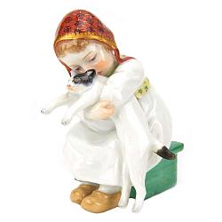Замечательная фигурка «Девочка с кошкой» из серии «Дети Хеншеля» включавшей в себя 14 статуэток. Изготовлена на знаменитой мануфактуре Мейссен в середине 20-го века, по модели скульптора Хеншеля 1905-го года. Хорошая, милая и добрая. Данный вариант росписи максимальный. Встречаются варианты со значительно более простой росписью, в том числе без золотого ободка с цировкой на шапочке. Хорошая сохранность.