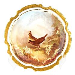 Симпатичная декоративная тарелка с изображением пары куликов на природе. Фарфор, роспись надглазурная полихромная. Роспись золотом. Имеется авторская подпись. Рубеж 19-20-х веков.