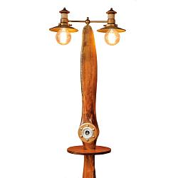 Перед нами большой и занятный торшер, который изготовили умельцы из самого настоящего самолетного деревянного винта. Самый настоящий «винтаж». В центре винта расположен работающий барометр. Электрика обновлена под современные стандарты.