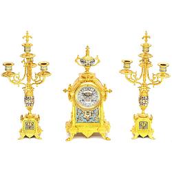 Красивый, старинный часовой гарнитур из трех предметов в классическом стиле. Прекрасно проработанная бронза с ярким золочением, служит превосходным фоном для орнаментов из многоцветных эмалей. Часовой гарнитур изготовлен французскими мастерами в третьей четверти 19-го века. Антиквариат. Хорошая сохранность. Механизм с получасовым боем ( можно отключить ) обслужен нашими специалистами, на маятниковом ходу. Работает. Прослужит еще не одну сотню лет. Очень качественная работа. При необходимости, наш специалист поможет установить правильный ход ( Москва и Московская область ). Первый выезд бесплатно. Антиквариат. Прекрасная сохранность.