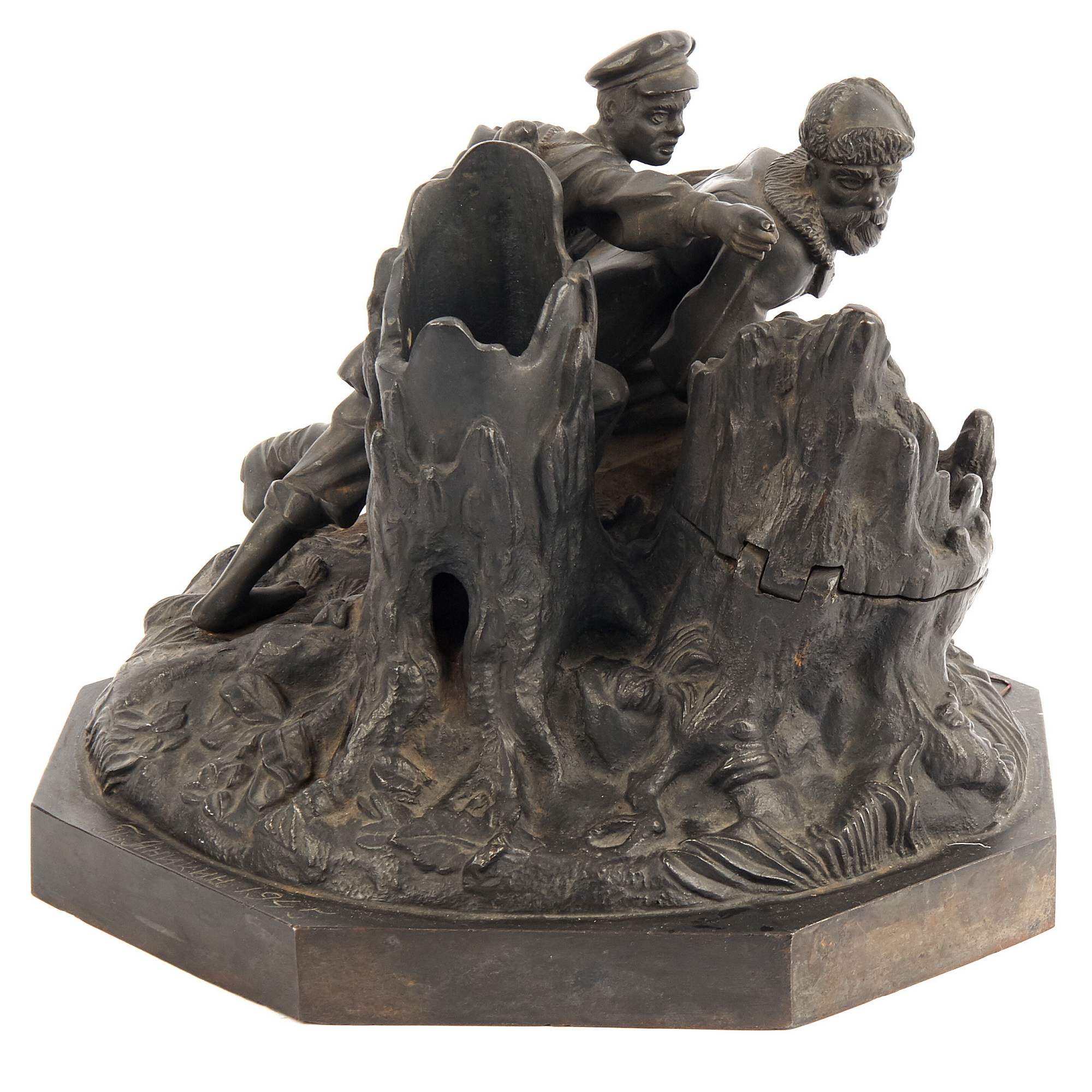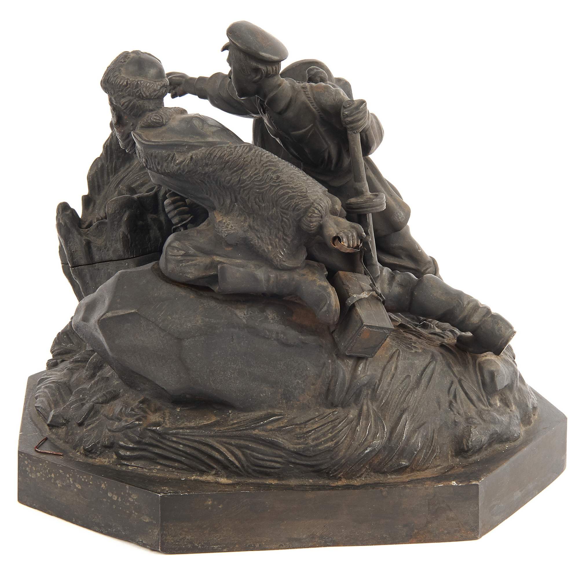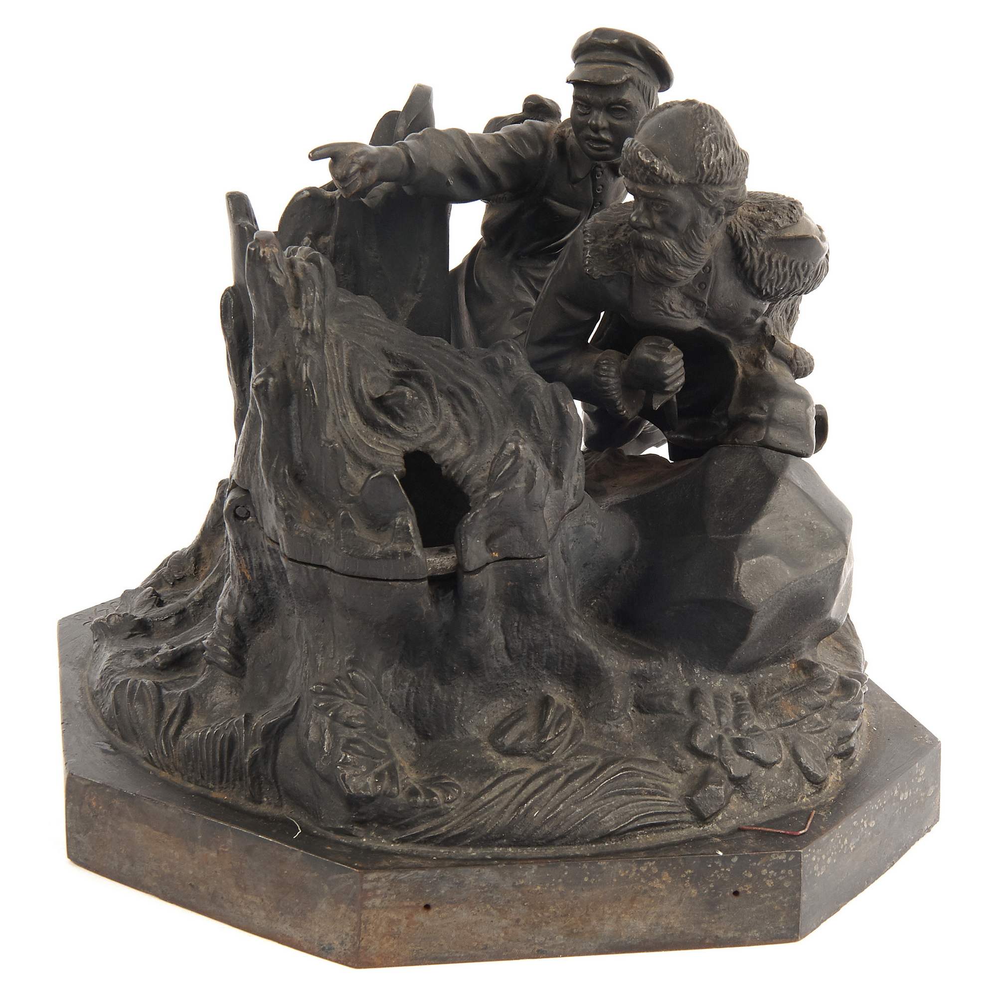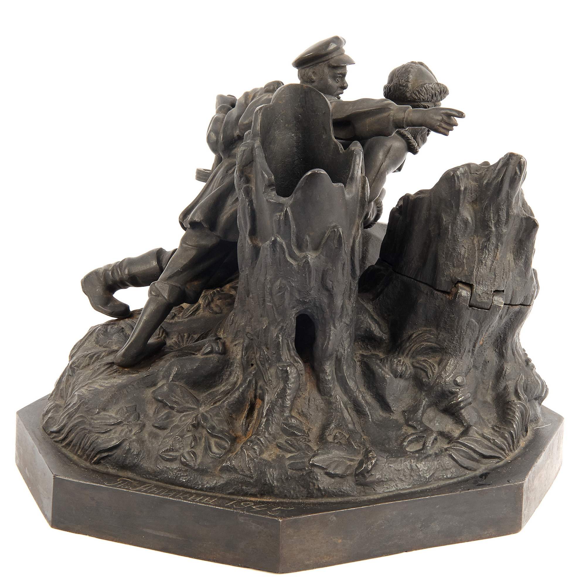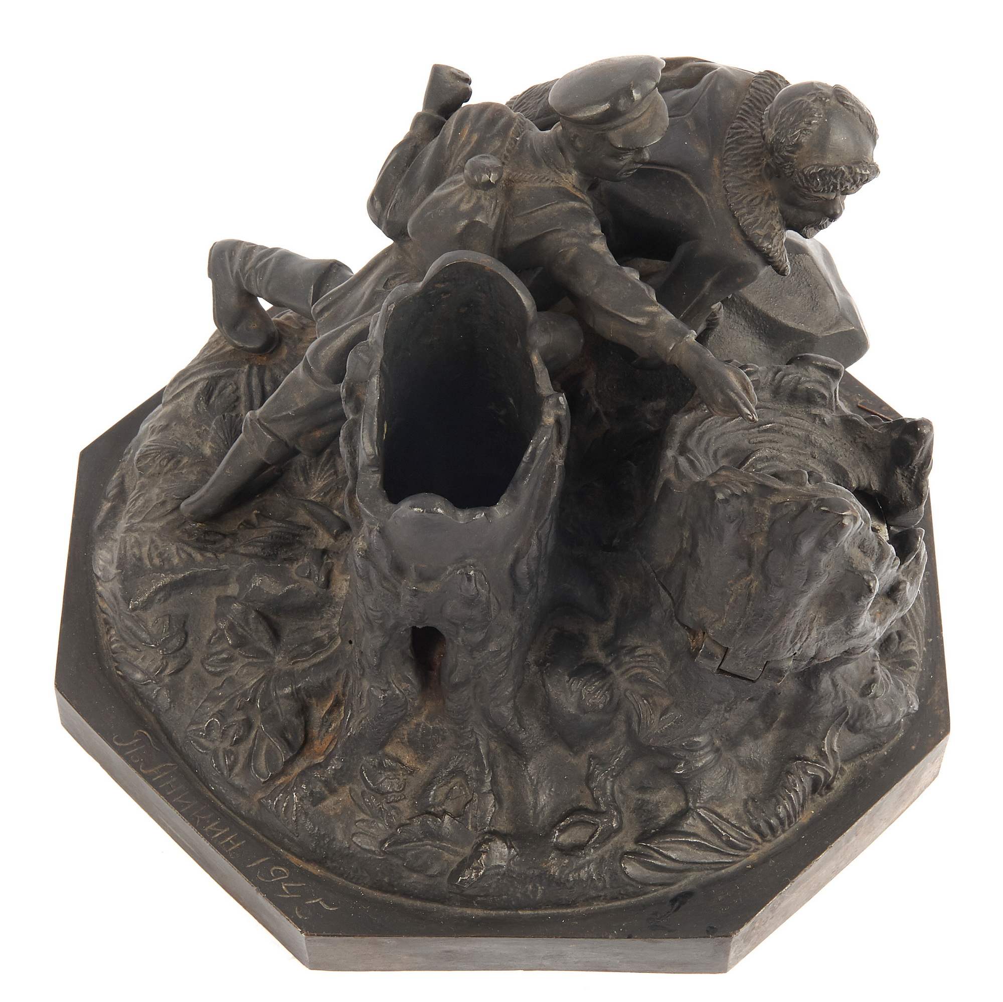 Редкий, коллекционный предмет чернильница «Партизаны». Отлита в 1947-м году на знаменитом Каслинском заводе, по модели П. Аникина 1945-го года. Размер - 27х27 см Высота - 23 см. Чугун.