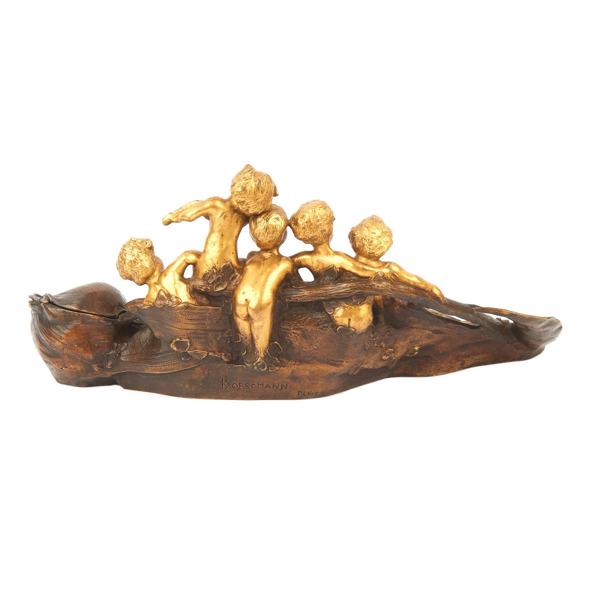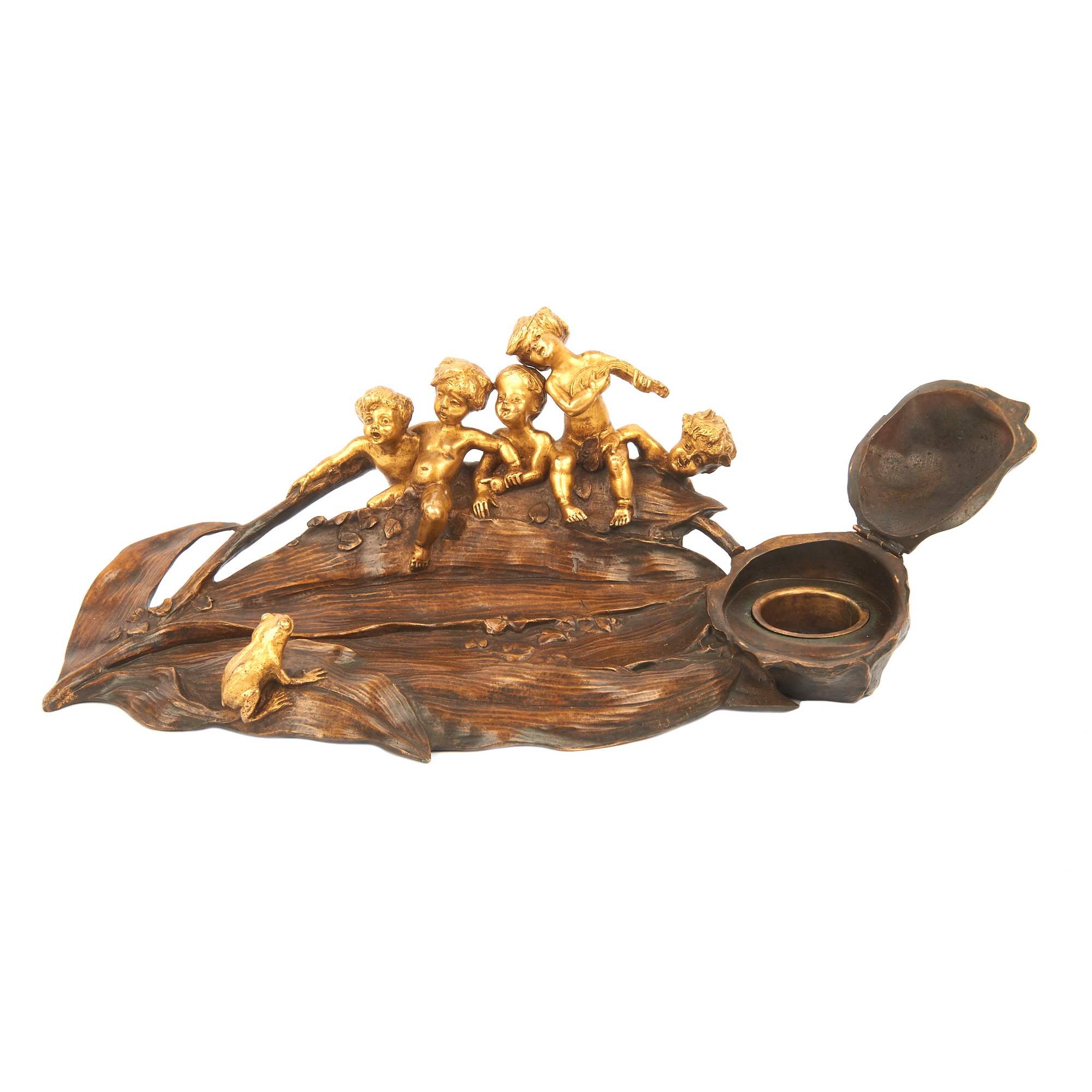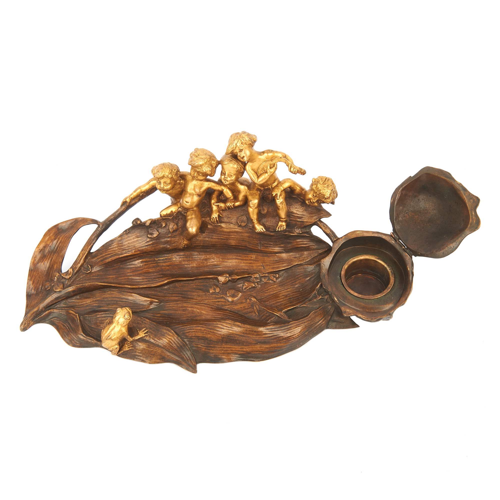 Потрясающей красоты, старинный чернильный прибор с фигурками путти. Яркий образец стиля «Модерн» ( Арт Нуво ). Изготовлен по модели замечательного скульптора, одного из ведущих мастеров модерна Шарля Коршана. Уроженец Моравии, без сомнения на его творчество оказал влияние выдающийся его земляк , художник и скульптор Альфонс Муха. Изделия мастера красивы, грациозны и хорошо продуманны. Прекрасно «играет» контраст золоченой и патинированной бронзы. Антиквариат. Хорошая сохранность.