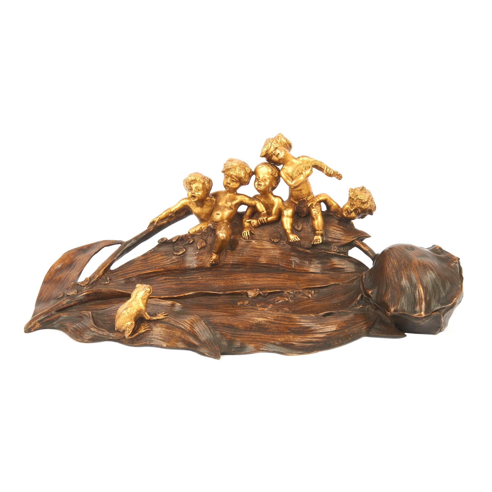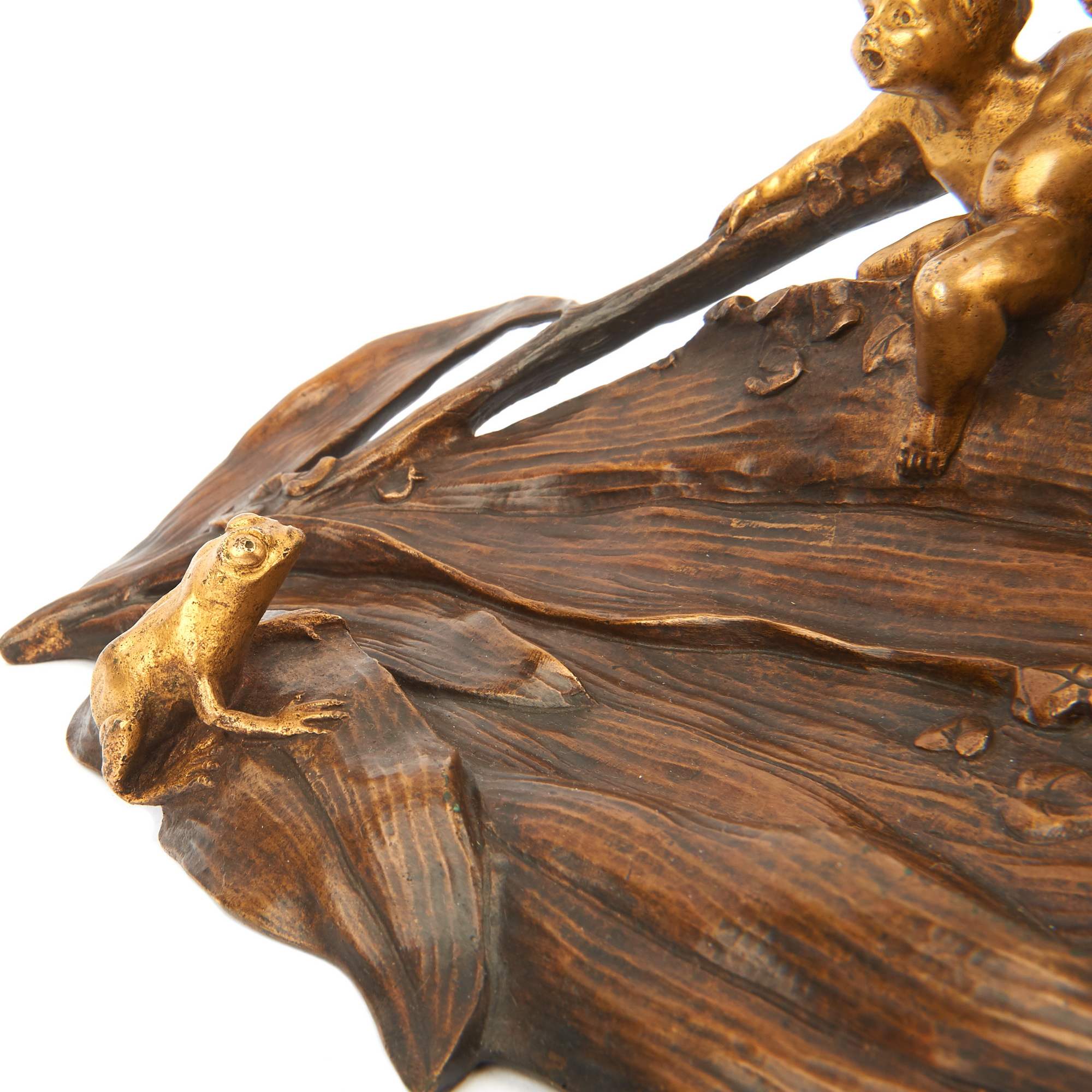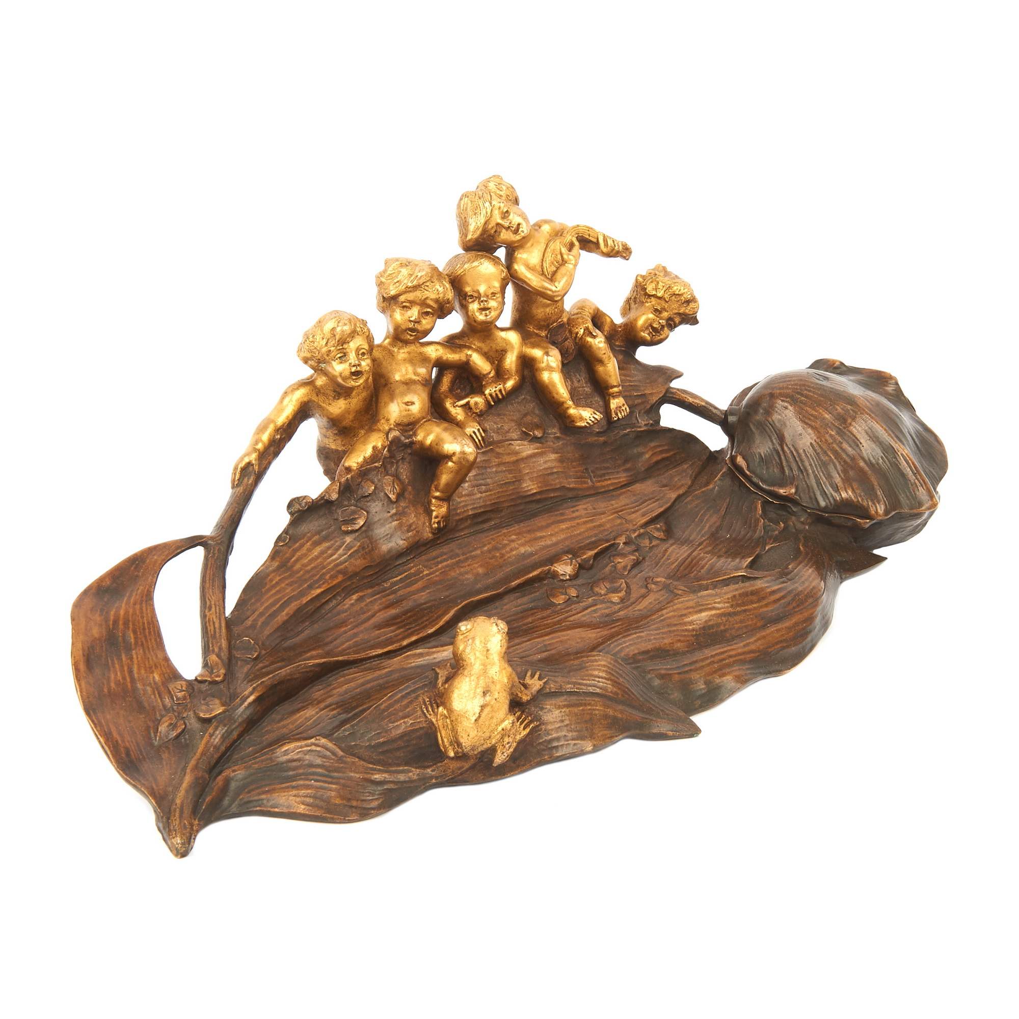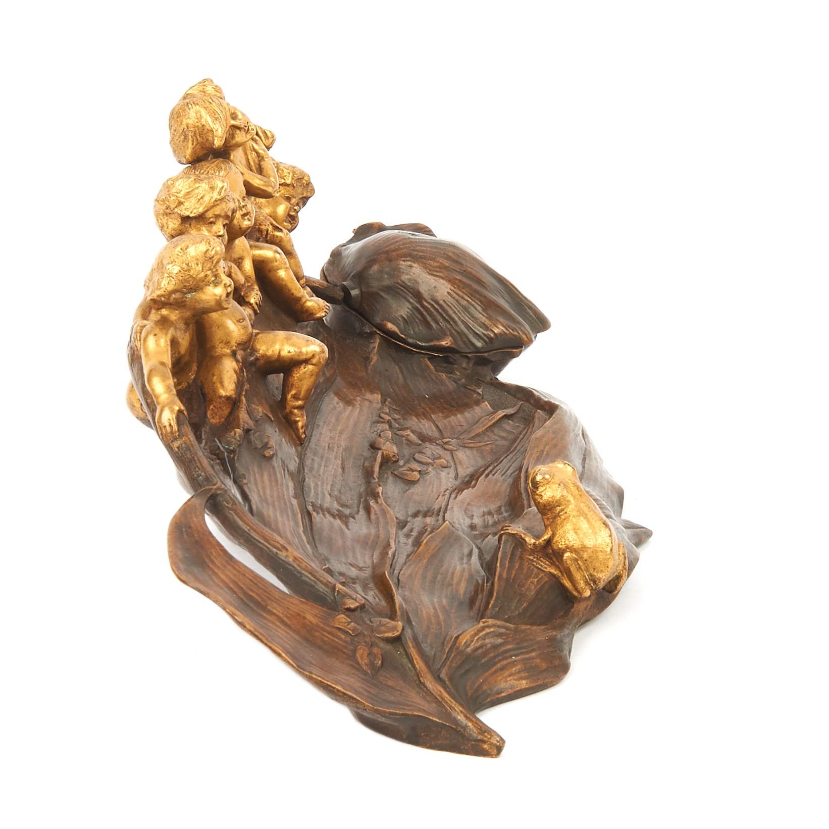 Потрясающей красоты, старинный чернильный прибор с фигурками путти. Яркий образец стиля «Модерн» ( Арт Нуво ). Изготовлен по модели замечательного скульптора, одного из ведущих мастеров модерна Шарля Коршана. Уроженец Моравии, без сомнения на его творчество оказал влияние выдающийся его земляк , художник и скульптор Альфонс Муха. Изделия мастера красивы, грациозны и хорошо продуманны. Прекрасно «играет» контраст золоченой и патинированной бронзы. Антиквариат. Хорошая сохранность.