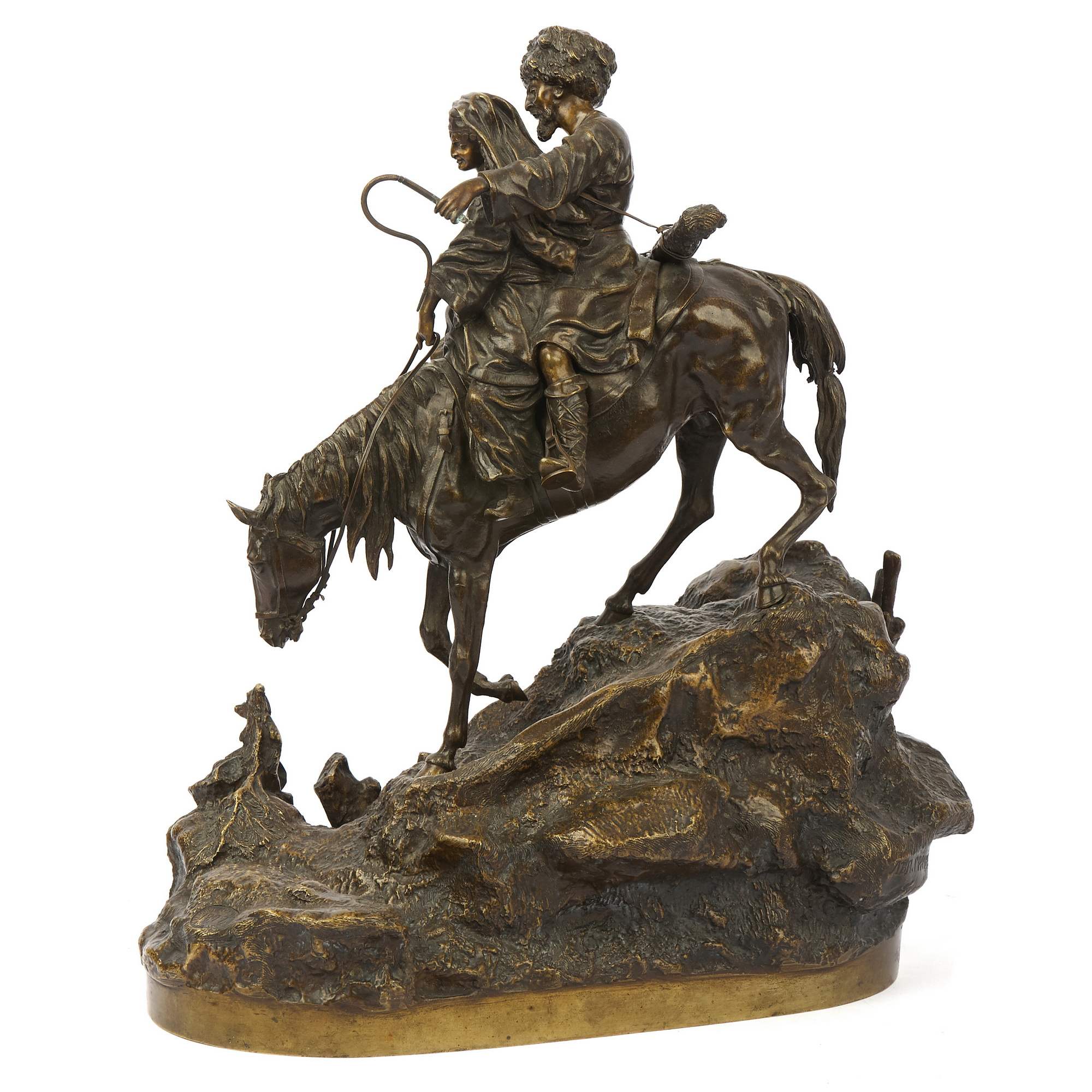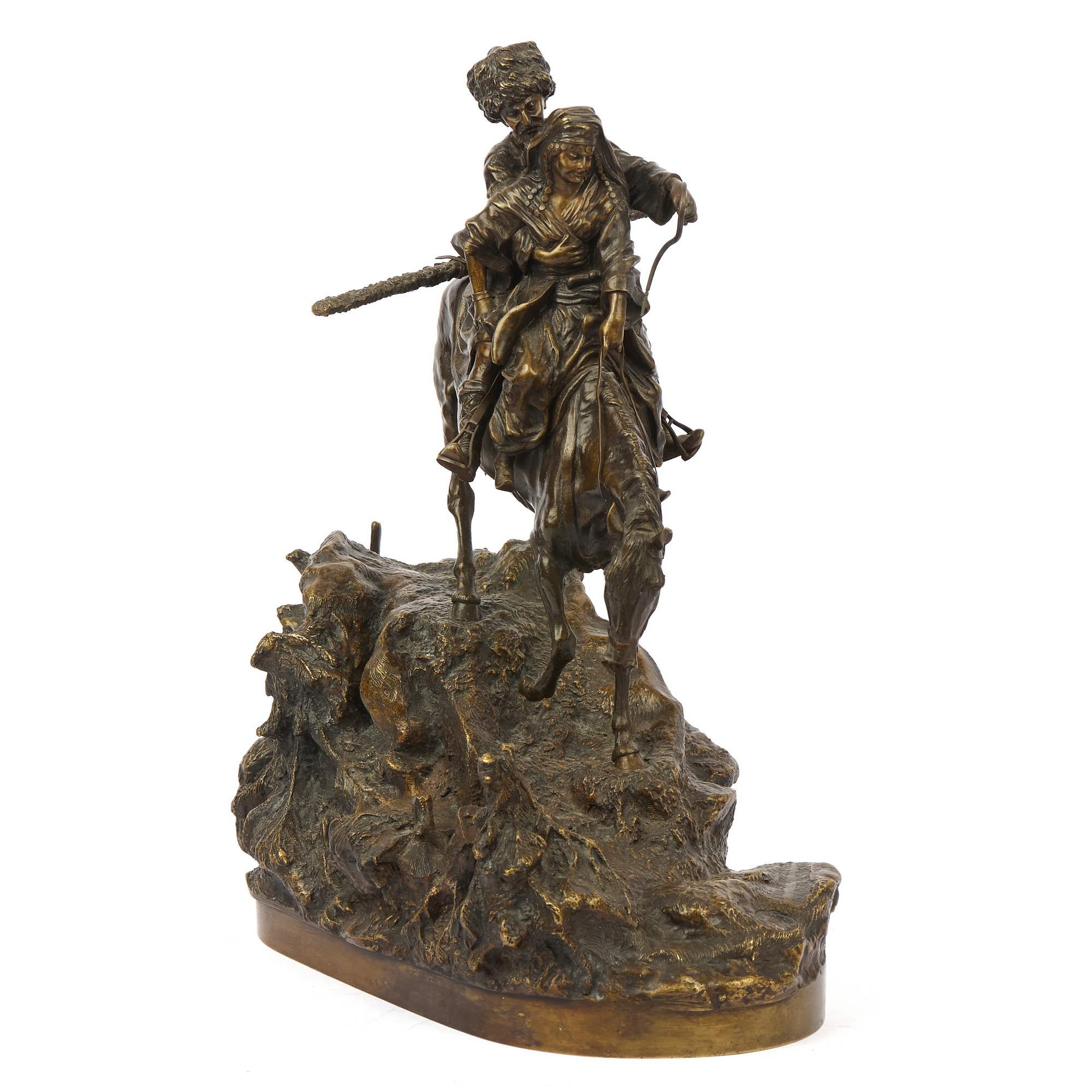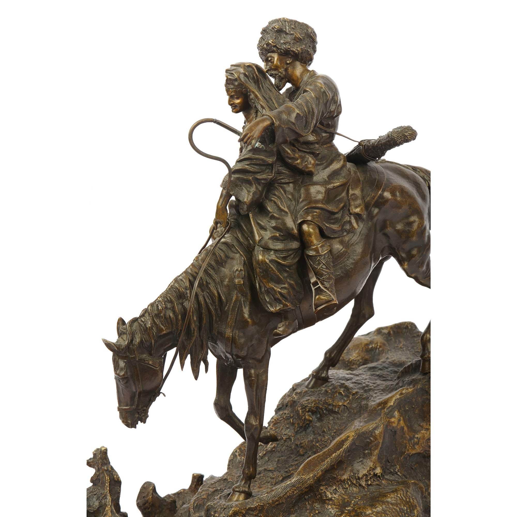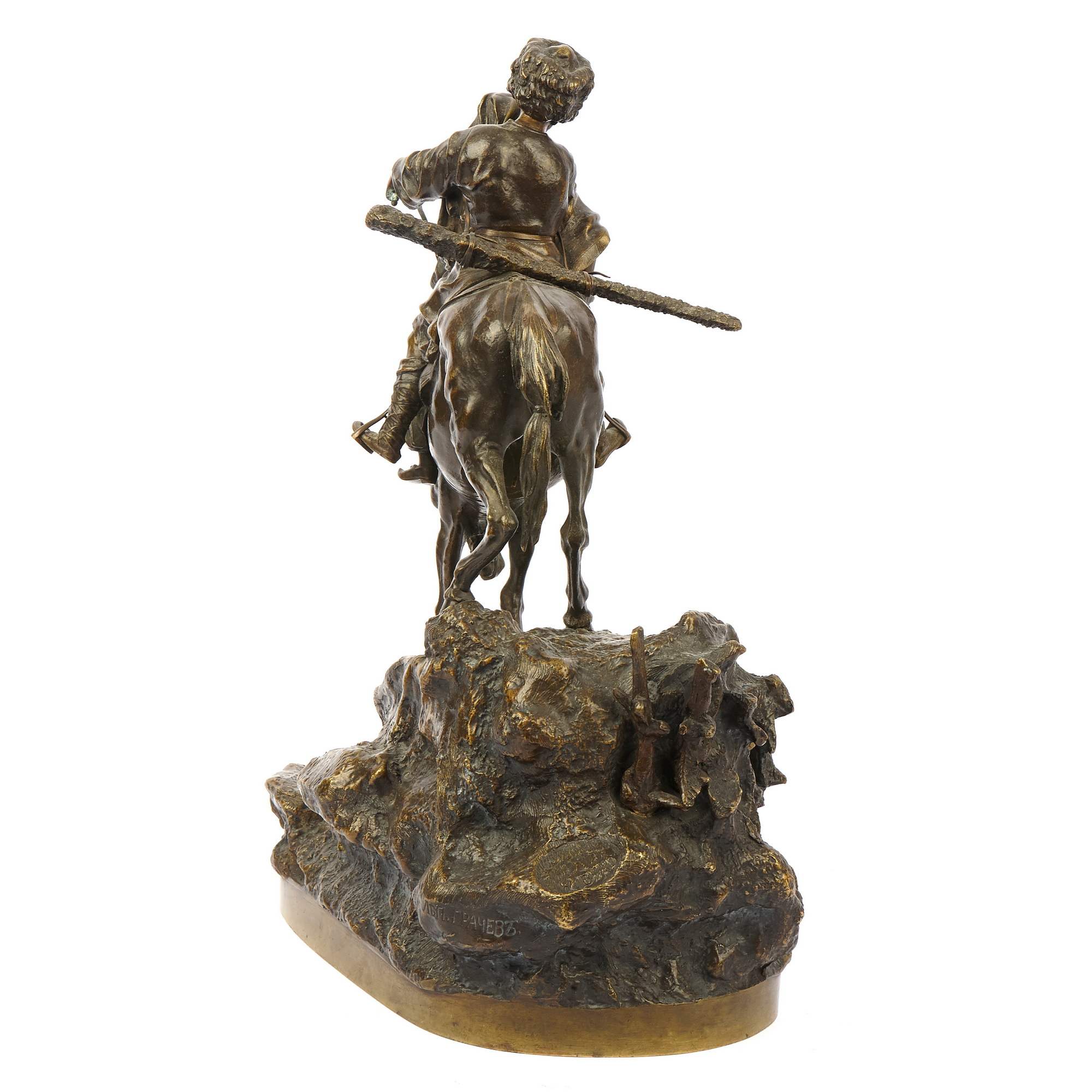 Замечательный образец старинной, русской камерной пластики посвященный теме кавказских народов. Автором модели является талантливый петербургский скульптор Василий Яковлевич Грачев. Прошел все этапы становления : от мальчика - подмастерья до признанного мастера камерной скульптуры. Изделия по его моделям изготавливали многие известные фирмы. Из серебра по его моделям делали вещи известные ювелирные фирмы Хлебникова и Овчинникова, из бронзы - фабрика К. Верфеля. Все они имели звания Придворных Поставщиков. Изделия по моделям В Я Грачева украшают многие коллекции и музейные собрания. В том числе крупнейшие. Прекрасное качество отливки и чеканки. Красивая патина. Хорошая сохранность. Антиквариат.