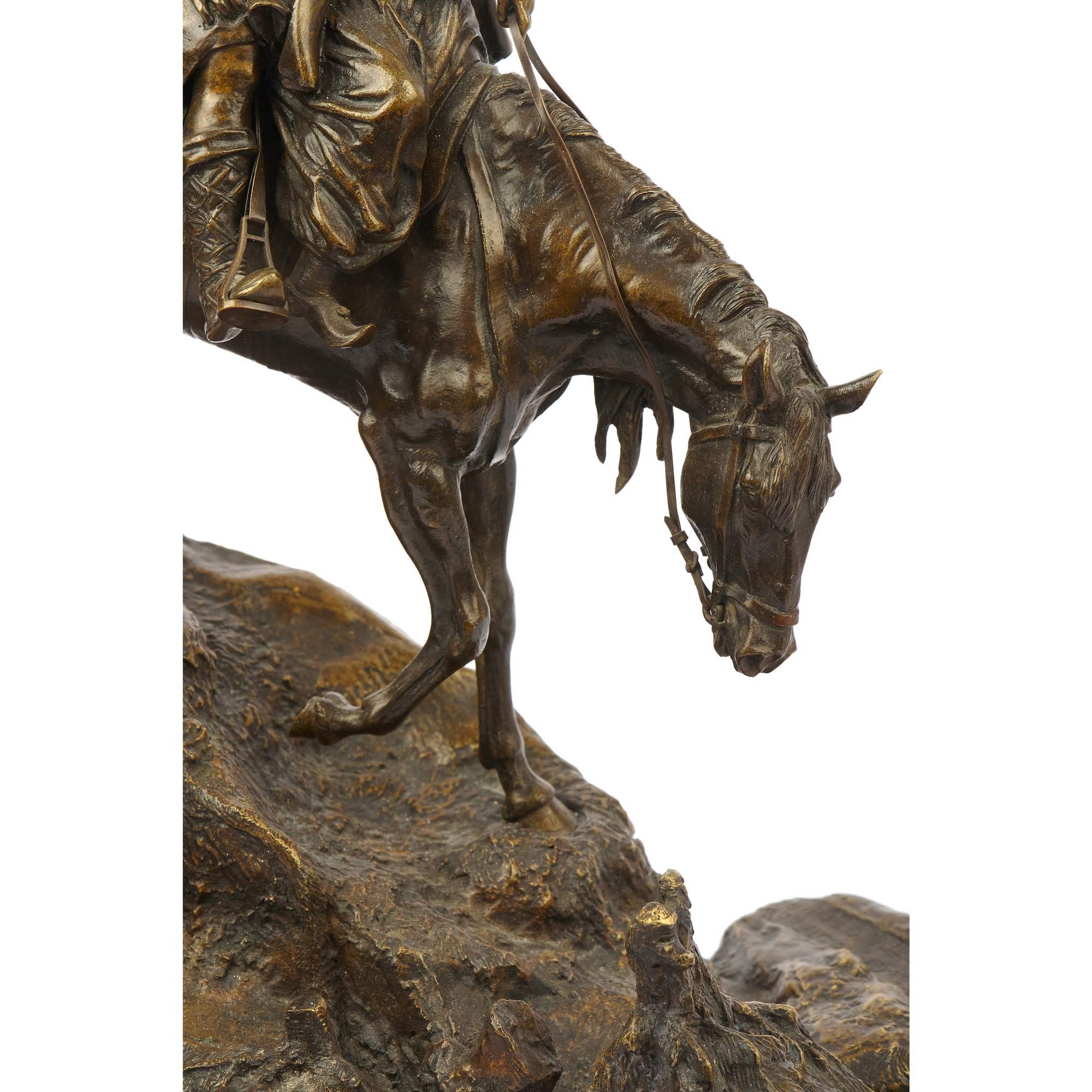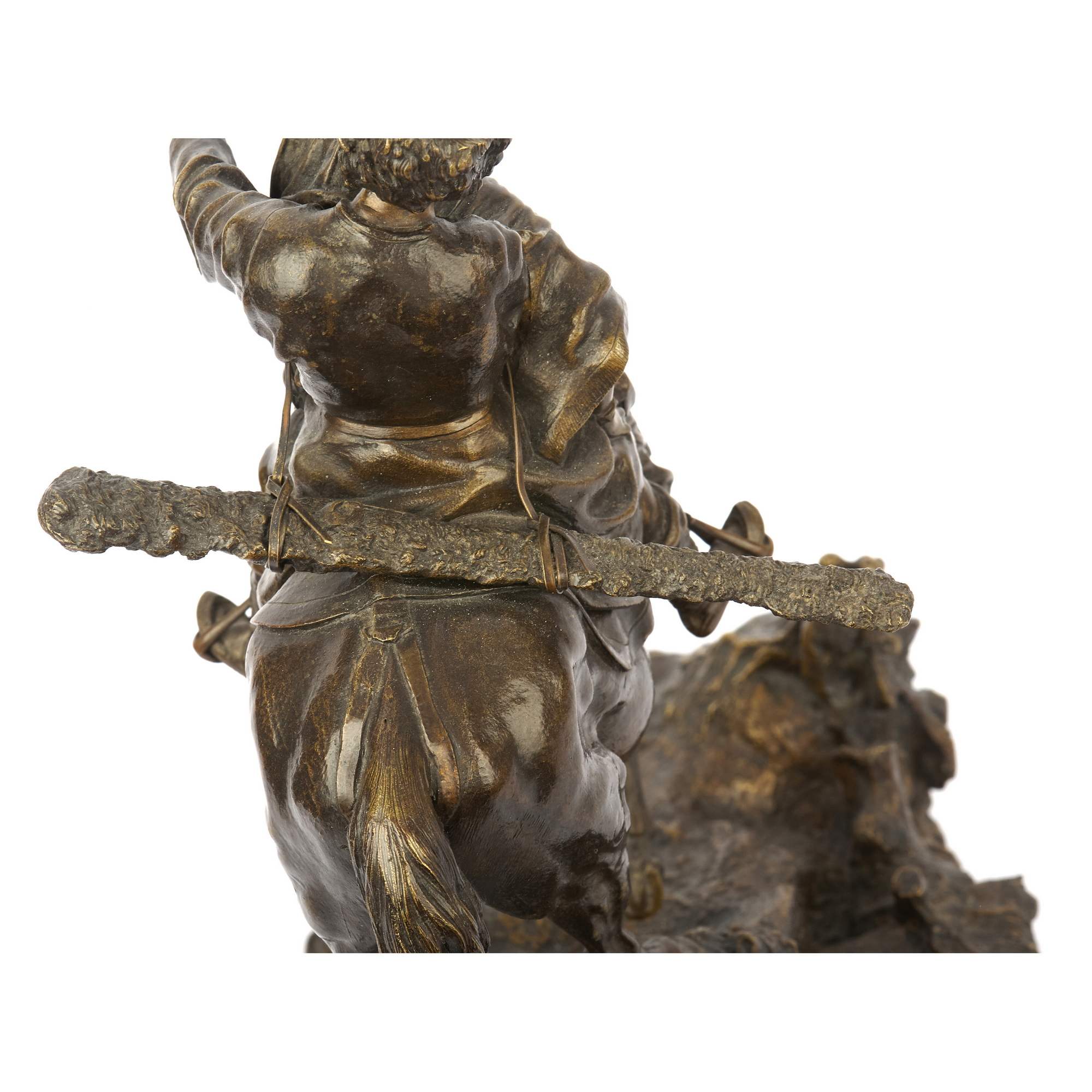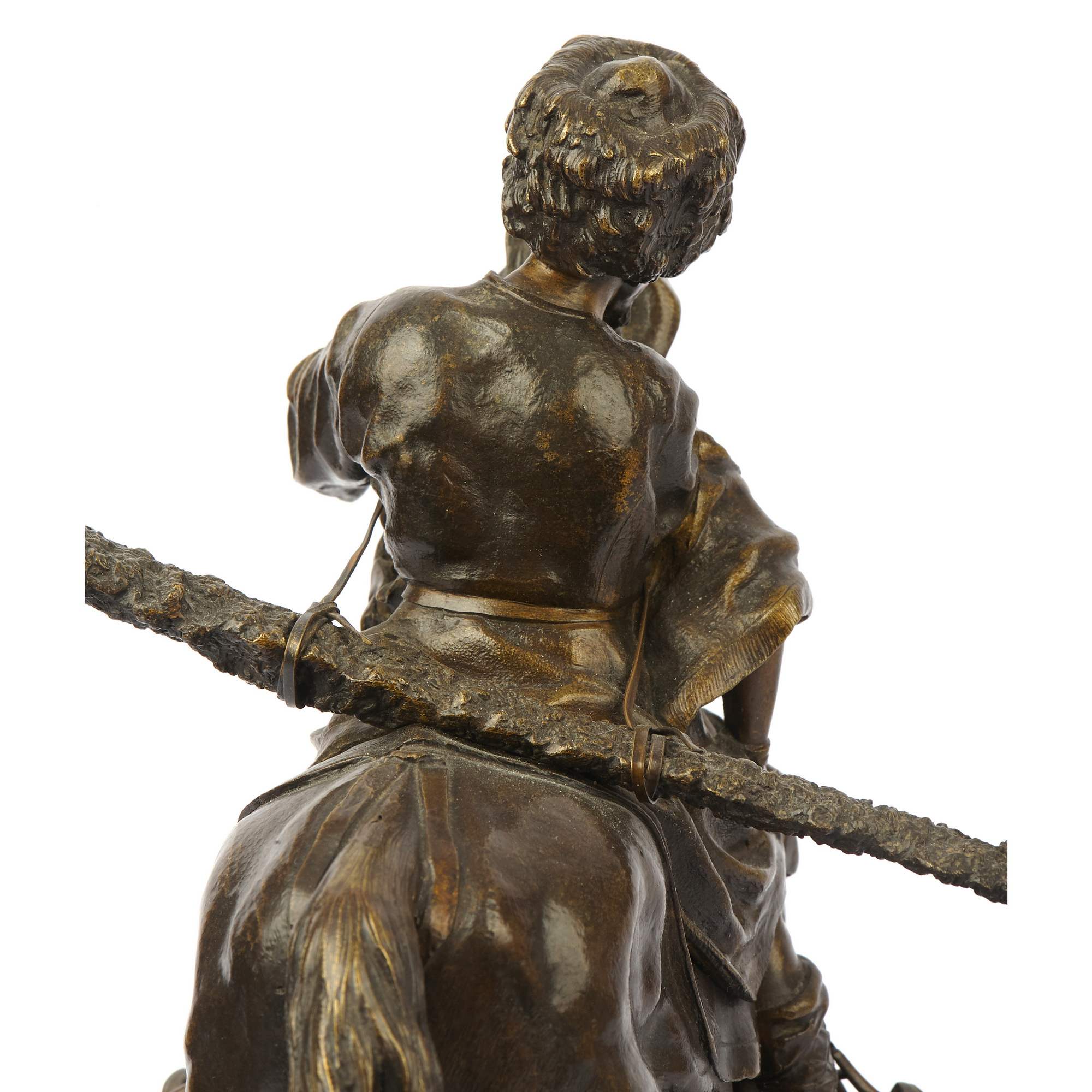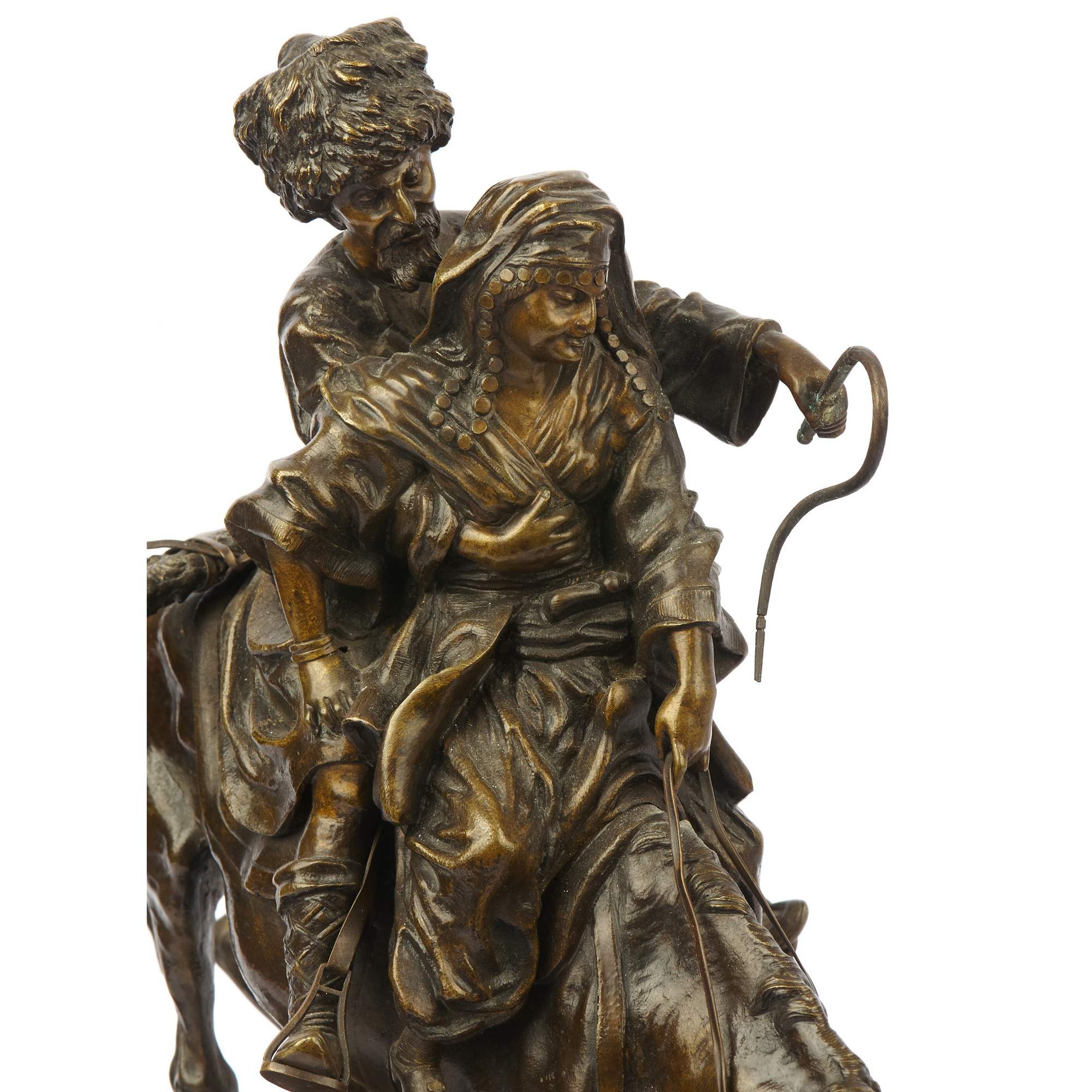 Замечательный образец старинной, русской камерной пластики посвященный теме кавказских народов. Автором модели является талантливый петербургский скульптор Василий Яковлевич Грачев. Прошел все этапы становления : от мальчика - подмастерья до признанного мастера камерной скульптуры. Изделия по его моделям изготавливали многие известные фирмы. Из серебра по его моделям делали вещи известные ювелирные фирмы Хлебникова и Овчинникова, из бронзы - фабрика К. Верфеля. Все они имели звания Придворных Поставщиков. Изделия по моделям В Я Грачева украшают многие коллекции и музейные собрания. В том числе крупнейшие. Прекрасное качество отливки и чеканки. Красивая патина. Хорошая сохранность. Антиквариат.