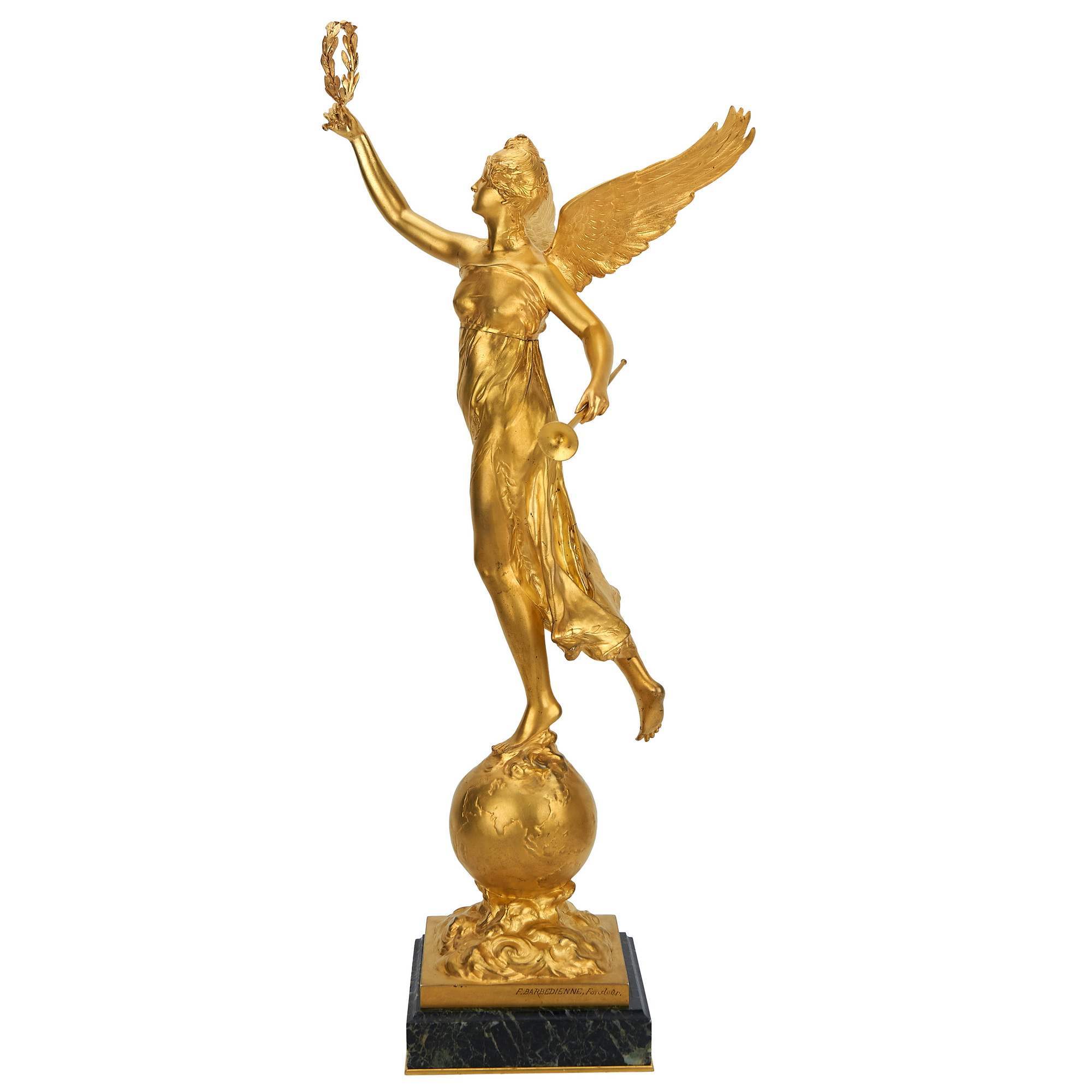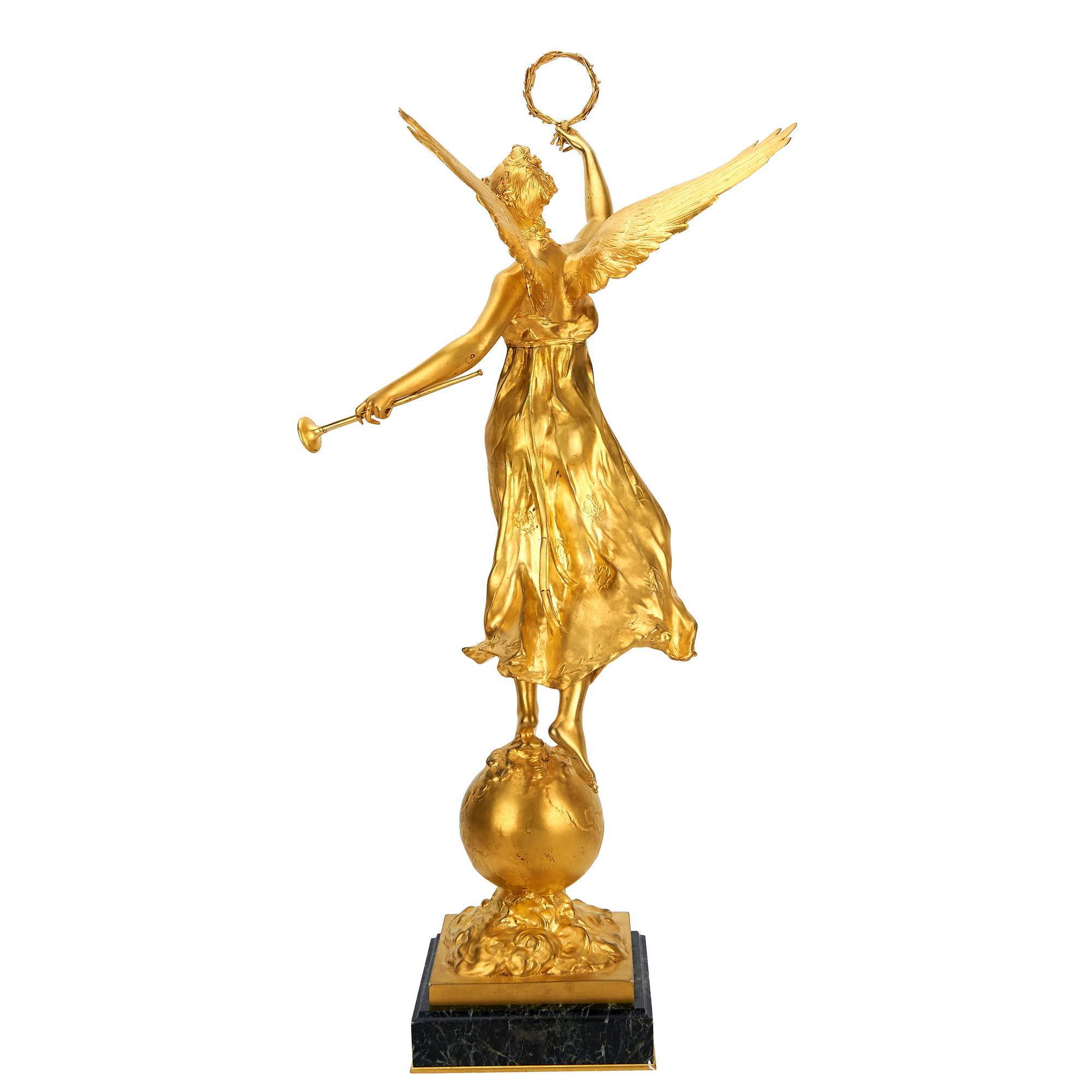 Великолепная, парадная скульптура с изображением музы «Победы – Виктории». Автору модели удалось создать невероятно выразительную композицию. Высокое основание на мраморном постаменте, символизирующее землю, поднятые вверх изящные крылья, торжественная золотистая тональность – все это подчеркивает возвышенную устремленность образа и придает ему черты монументального величия. Согласно античной традиции, Виктория, дочь титана Палласа и богини подземной реки Стикс – черноволосая девушка с большими крыльями за плечами. Она неизменно присутствовала во время битв и соревнований, летела над землей возвещая всему миру о победе. В руках ее традиционно изображались лавровый венок, пальмовая ветвь или рог, в который трубила Виктория, провозглашая триумф героев. Автор модели, по которой отлита скульптура – известный мастер Пауль Дюкюинг. Регулярно экспонировал свои работы на Парижском Салоне, был трижды был удостоен престижных медалей, а в 1919 году занял должность профессора скульптуры знаменитой Севрской мануфактуры, исполняя модели для изготовления их в фарфоре. За свою многогранную творческую деятельность, которая распространялась не только на кабинетную пластику, но и на монументальные памятники, мастер Пауль Дюкюинг был удостоен ордена Почетного легиона. Не менее примечательным является и предприятие, на котором отлили представленную скульптуру. Фирма Фердинанда Барбедьена обрела известность в 1830-х годах, заняла одно из лидирующих мест в бронзолитейном производстве. На ней отливались как античные образы, и скульптуры минувших лет, так и работы современных выдающихся мастеров. При Наполеоне III фирма достигла наибольшего расцвета, насчитывала более 300 рабочих, а на Всемирной выставке в Париже в 1855 году предприятие обрело мировую известность после присуждения «Гран При». Представленную скульптуру выделяет высочайший художественный и технический уровень исполнения. Следует отметить, что согласно прейскуранту предприятия, отливки подобных размеров отличались очень высокой стоимостью. Антиквариат. Отличная сохранность. Следы бытования.