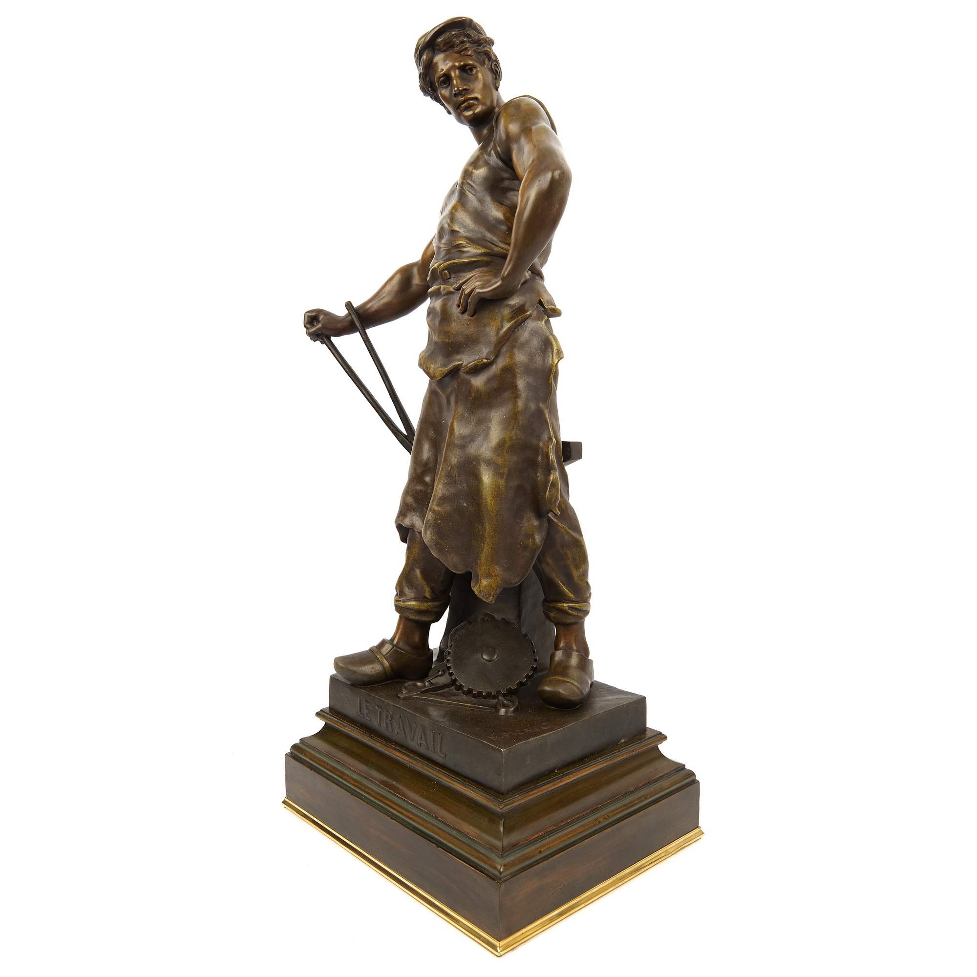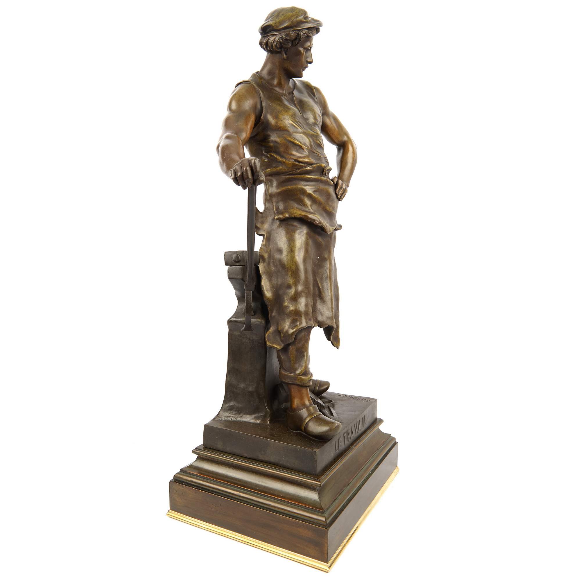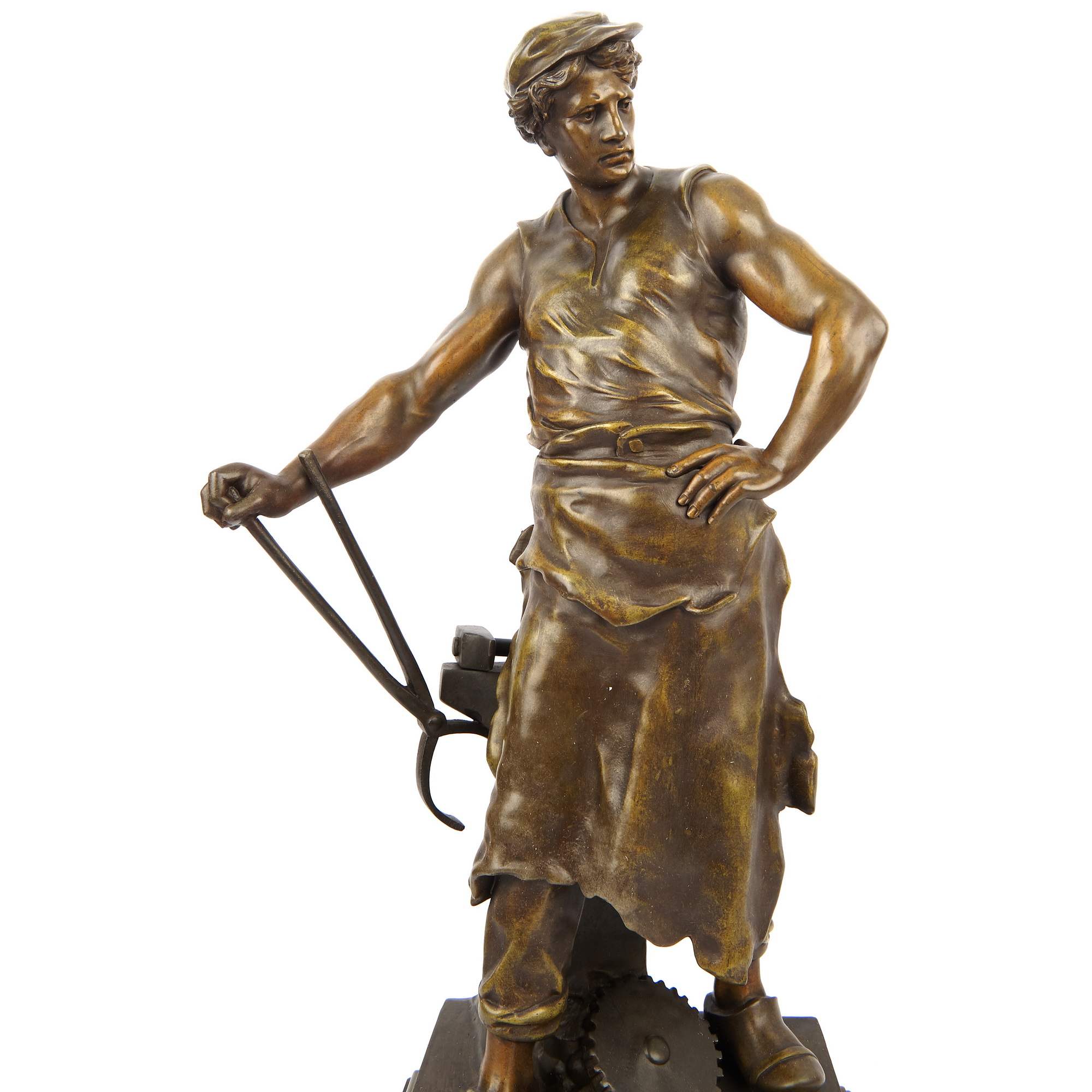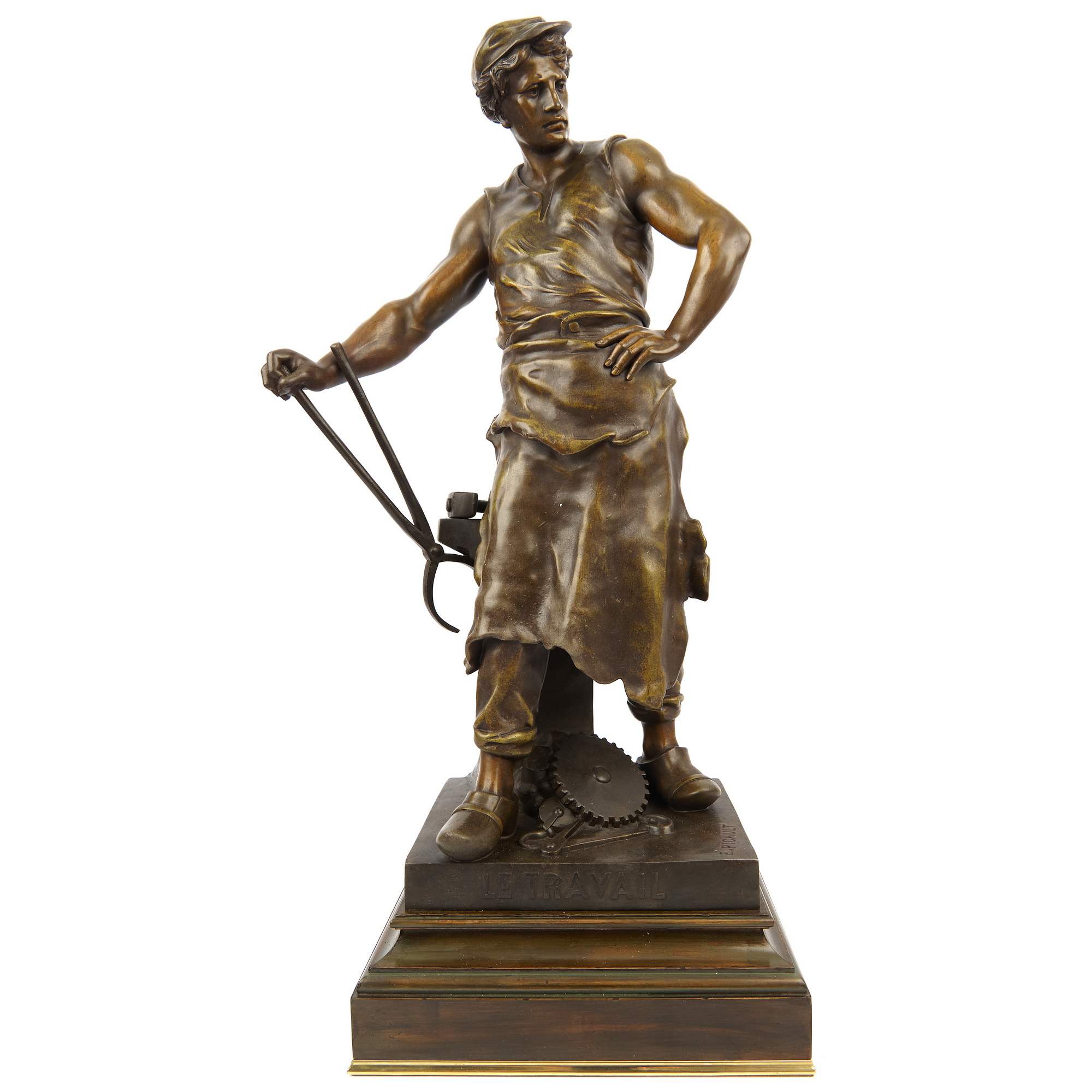 Красивая старинная, большая скульптура «аллегория труда» по модели известнейшего французского скульптора Эмиля Пико. Изображен могучий мужчина в рабочей одежде со множеством символических деталей: наковальня - как символ созидания и множество иных инструментов - как символ труда. Конечно - это собирательный, идеализированный образ человека - созидателя, труженика. Прекрасное литье и патина, замечательная компоновка скульптуры. Антиквариат. Хорошая сохранность.