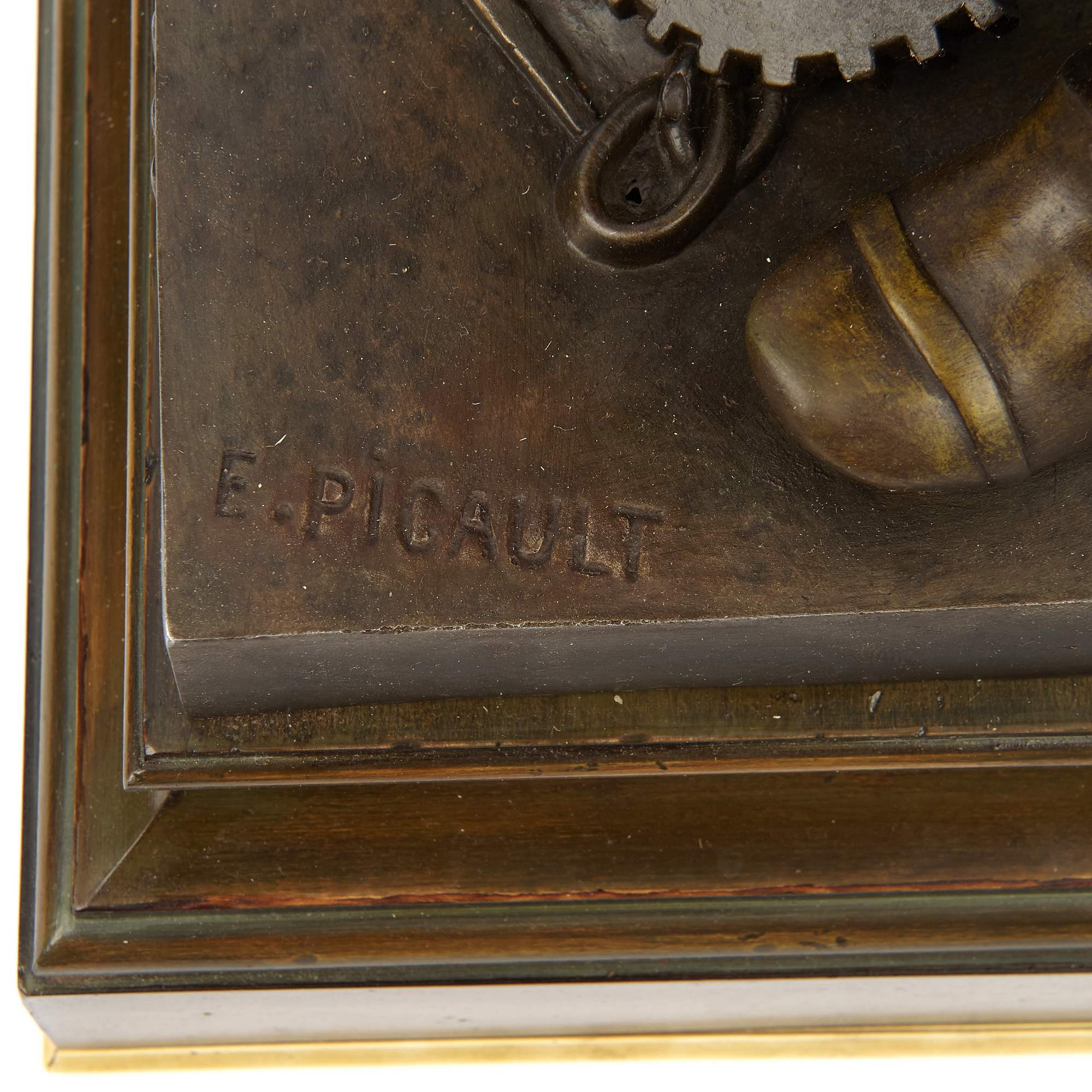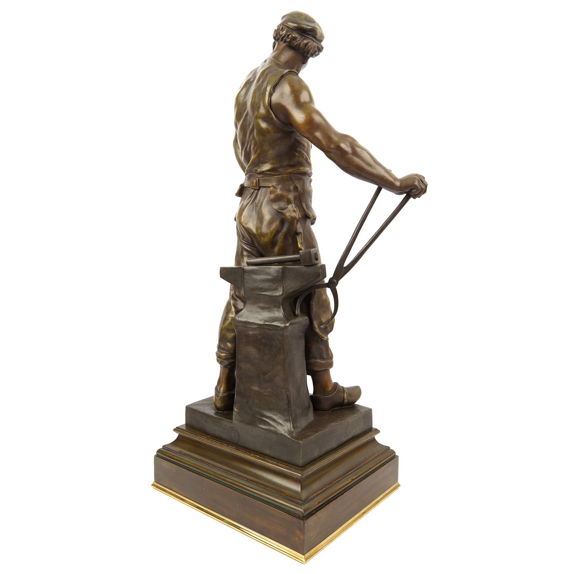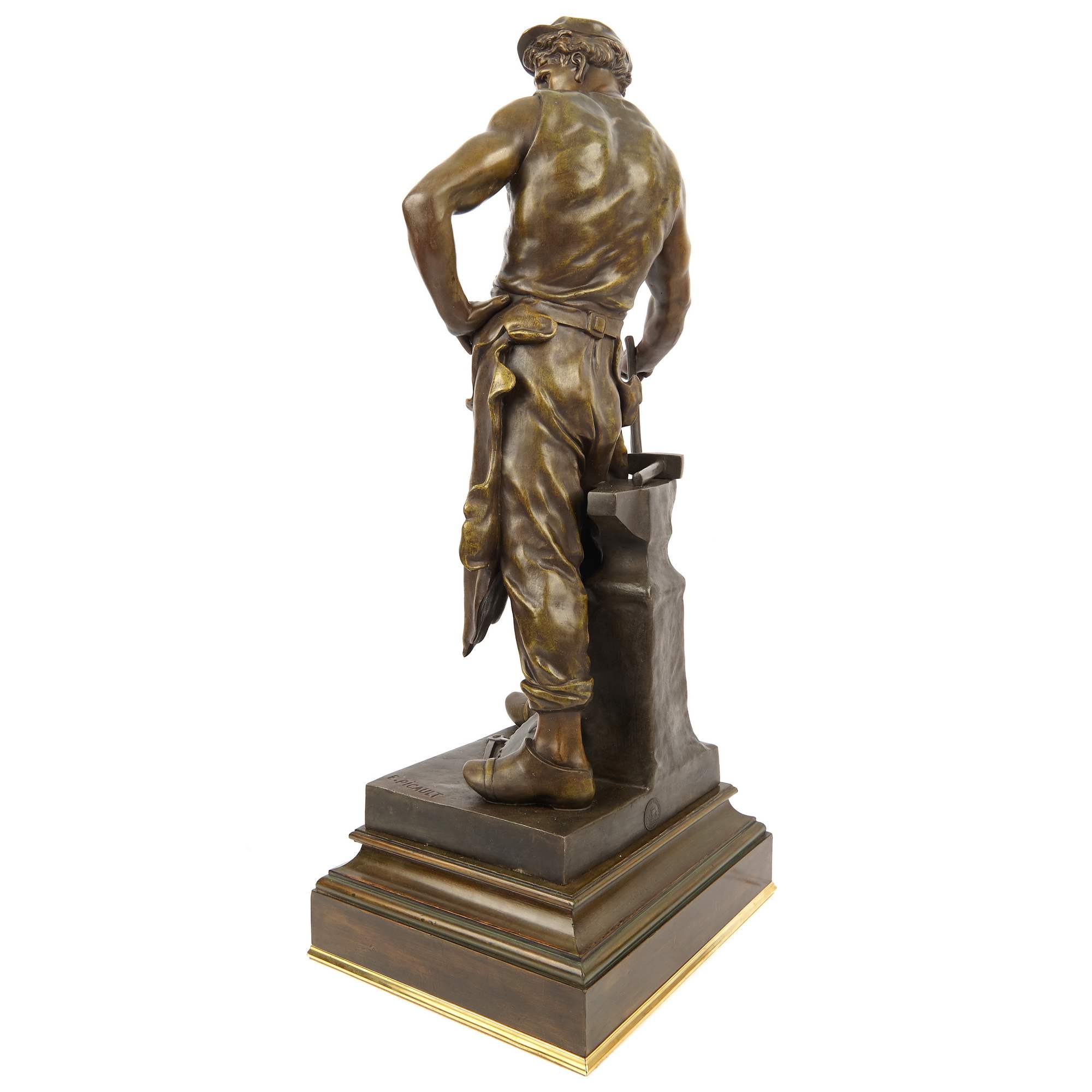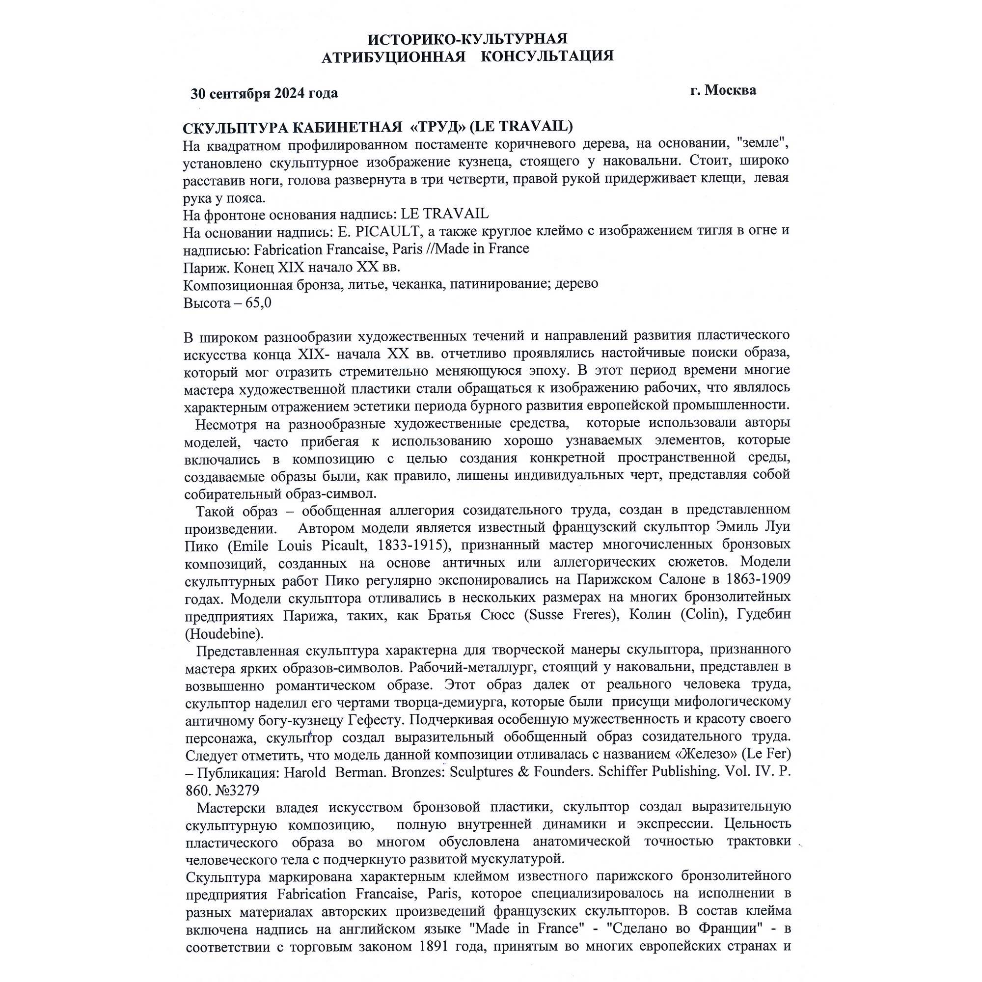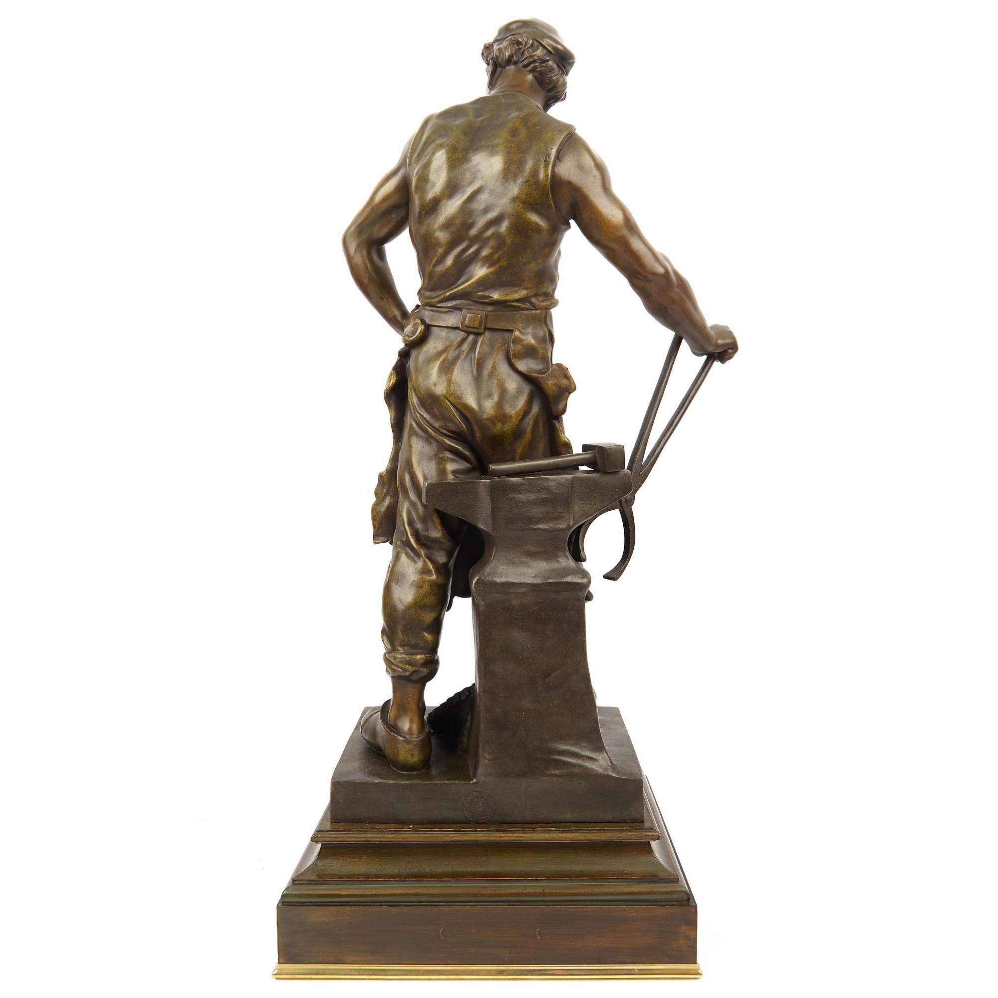 Красивая старинная, большая скульптура «аллегория труда» по модели известнейшего французского скульптора Эмиля Пико. Изображен могучий мужчина в рабочей одежде со множеством символических деталей: наковальня - как символ созидания и множество иных инструментов - как символ труда. Конечно - это собирательный, идеализированный образ человека - созидателя, труженика. Прекрасное литье и патина, замечательная компоновка скульптуры. Антиквариат. Хорошая сохранность.