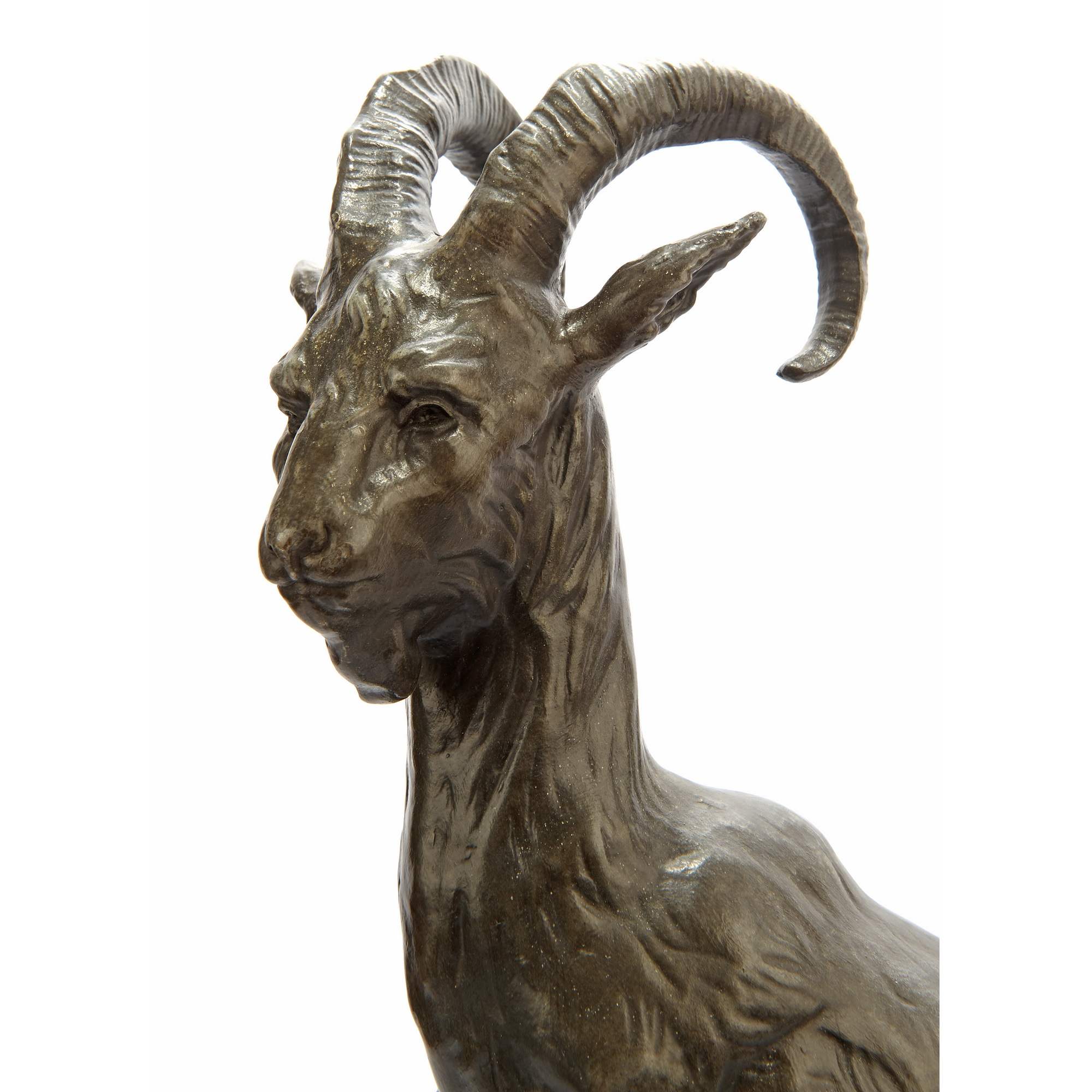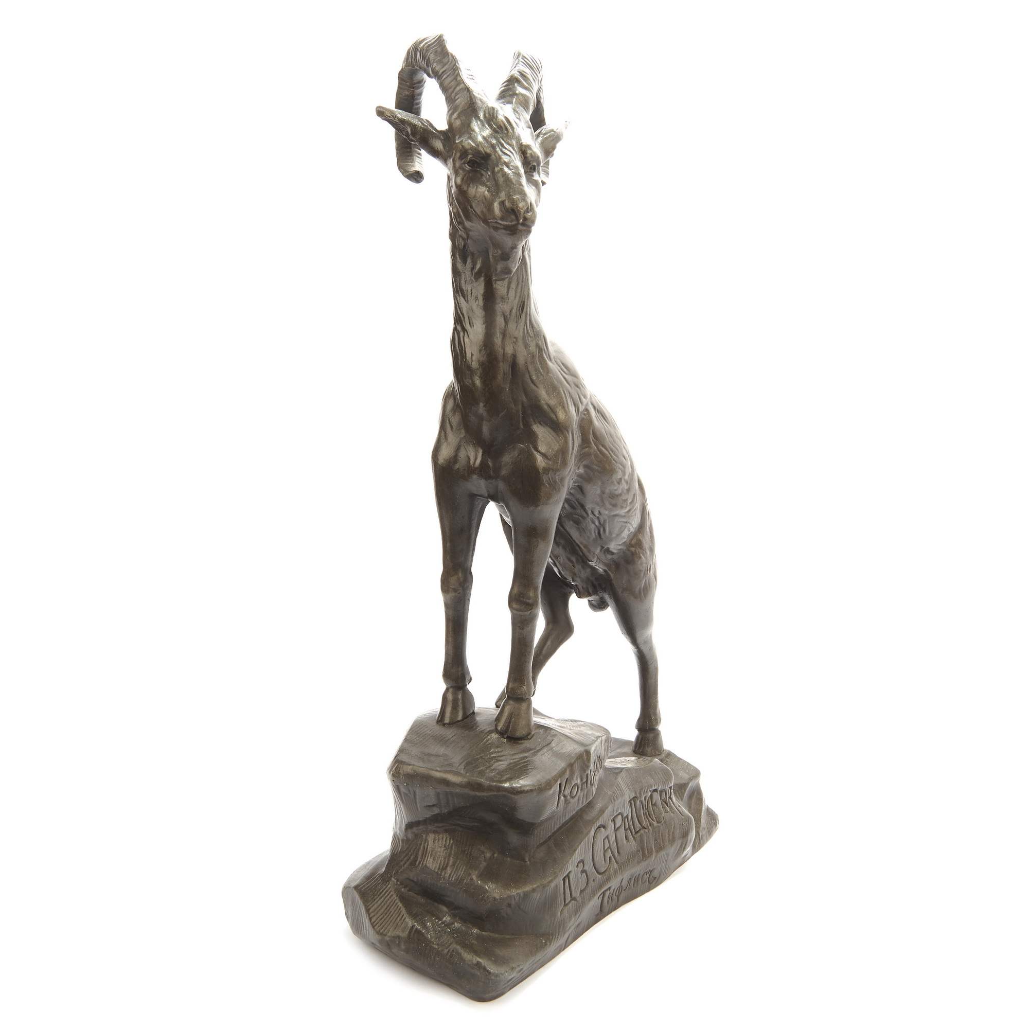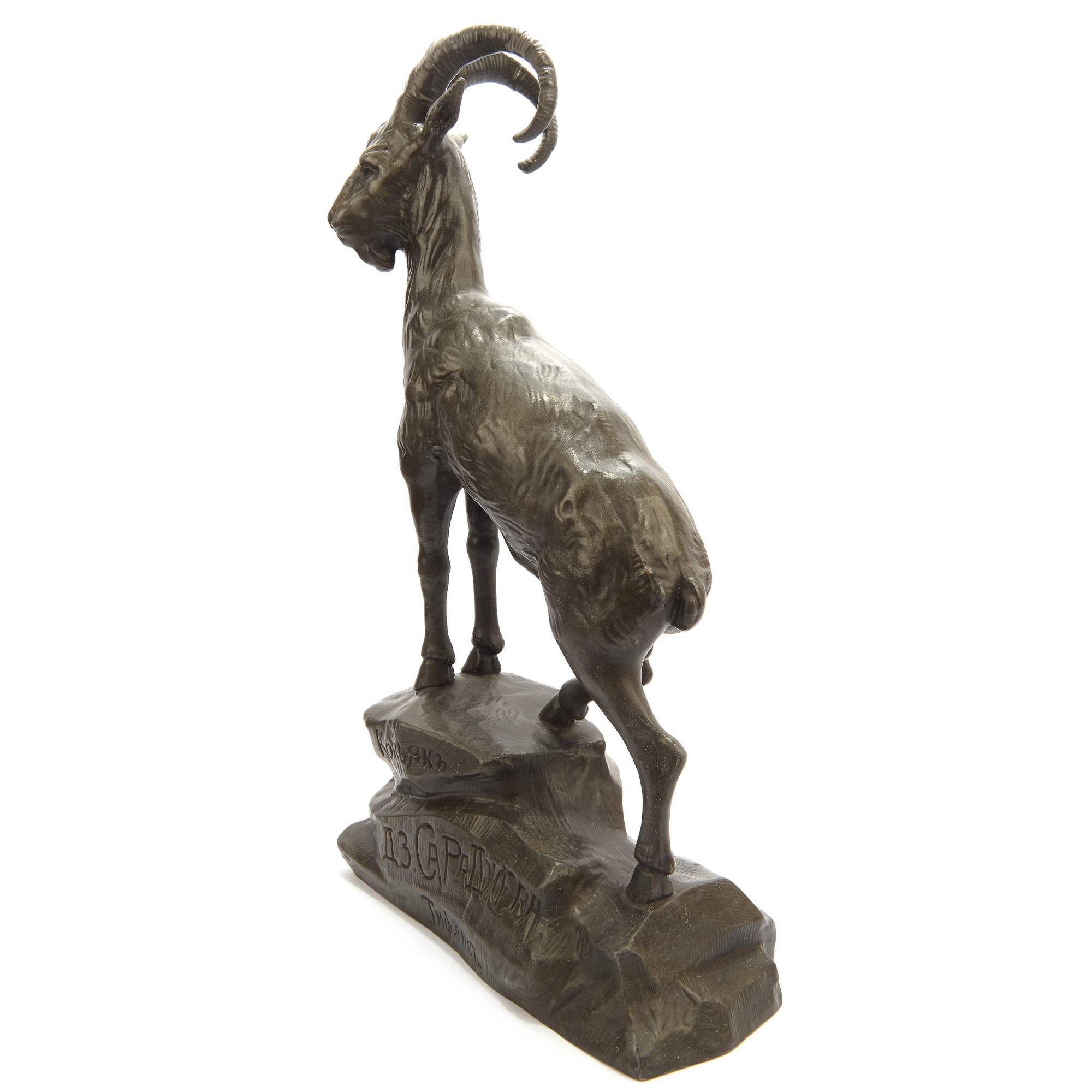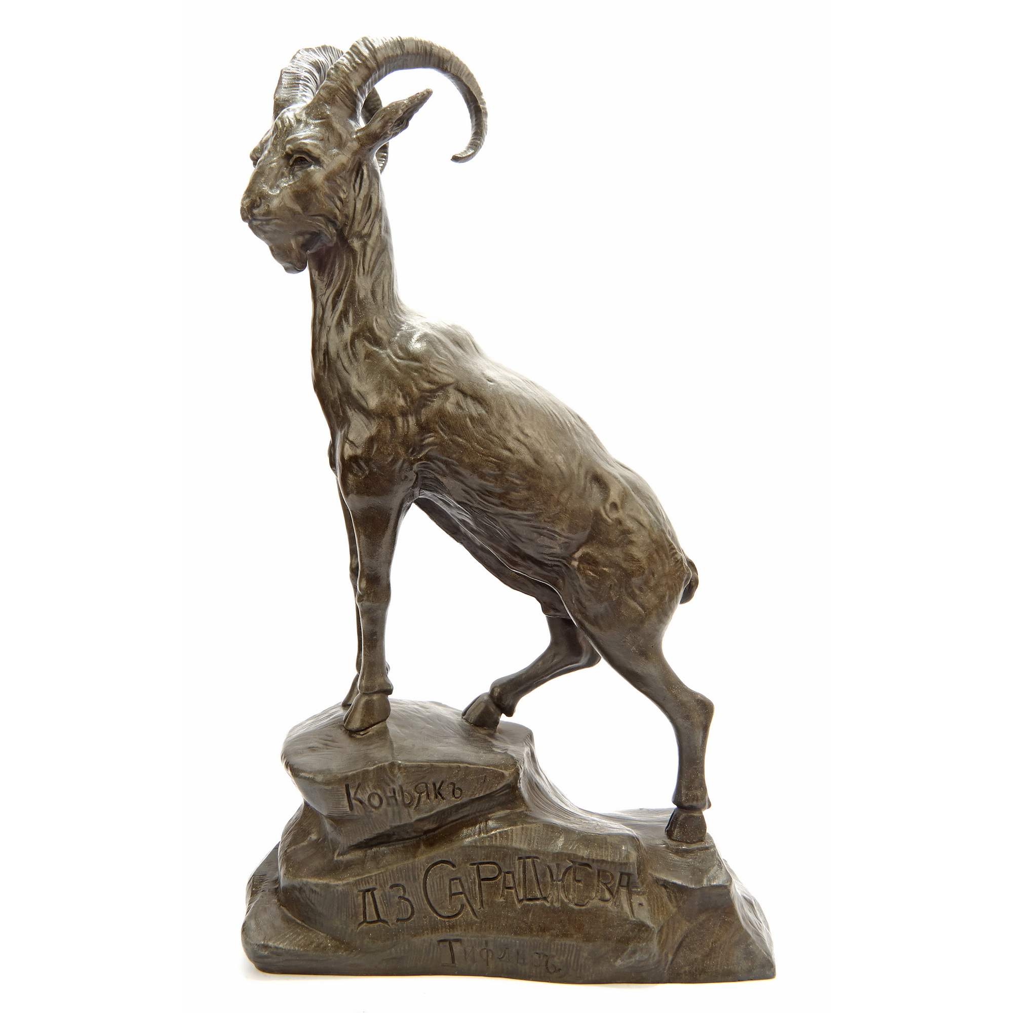 Перед нами очень красивый, старинный, коллекционный предмет. Изображение горного «Архара» является крайне редким образцом торгово-промышленной рекламы начала 20-го века. Скульптура воспроизводит «фирменный» знак знаменитейшего российского ( грузинского ) коньячного производства - КОНЬЯКЬ Д. З. САРАДЖЕВА. Вероятно данная скульптура была заказана под открытие фирменного магазина в Москве. Фигуру Давида Захарьевича Сараджишвили ( Сараджева ) трудно переоценить. Это национальное достояние и России и Грузии. Во Франции он подружился с Жаном Батистом Камю ( основатель коньячного Дома Камю ), который посвятил своего друга в тайны производства коньяка и помог в дальнейшем с оснащением производства. Заводы Сараджева стали крупнейшими в Российской Империи, получили звание Придворного Поставщика. И сегодня радуют потребителя своей продукцией. Именно Сараджеву обязаны своим появлением и развитием: Тбилисский, Ереванский, Кизлярский коньячные заводы. Повторимся, скульптура очень редкая. Представляет музейное значение. Антиквариат.