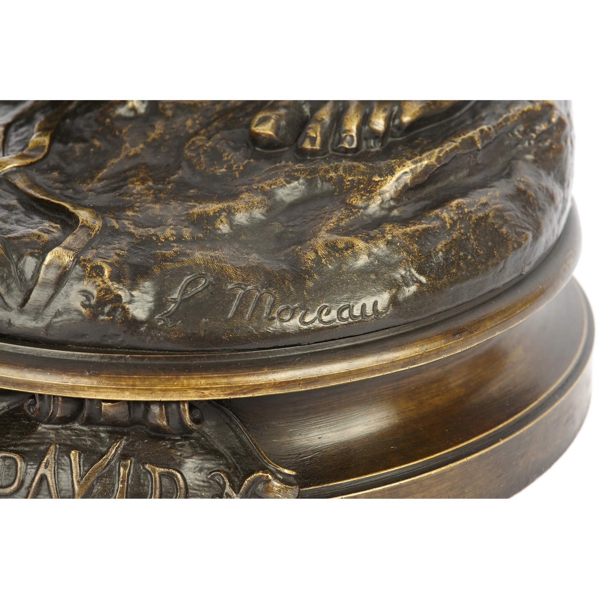 Замечательная старинная скульптура очень высокого художественного и технического уровня исполнения изображает юного Давида, победителя Голиафа, будущего царя Израиля. По модели ( 1890-го года ) известного скульптора, представителя известной творческой династии Луи Огюста Моро. Творческое наследие автора очень богато. Его произведения украшают многие коллекции и собрания. Антиквариат. Хорошая сохранность.