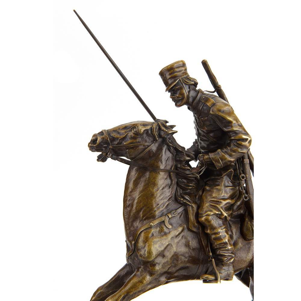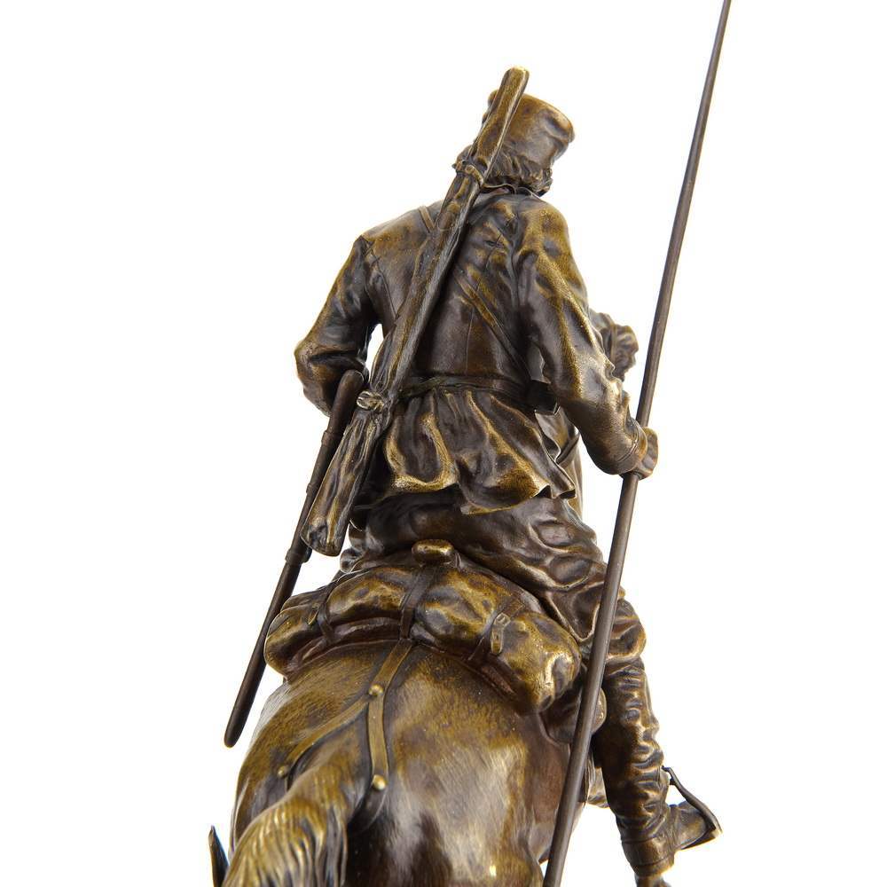Замечательный образец старинной, русской камерной пластики посвященный военному делу. Автором модели является талантливый петербургский скульптор Василий Яковлевич Грачев. Прошел все этапы становления : от мальчика - подмастерья до признанного мастера камерной скульптуры. Изделия по его моделям изготавливали многие известные фирмы. Из серебра по его моделям делали вещи известные ювелирные фирмы Хлебникова и Овчинникова, из бронзы - фабрика К. Верфеля. Все они имели звания Придворных Поставщиков. Изделия по моделям В Я Грачева украшают многие коллекции и музейные собрания. В том числе крупнейшие. Прекрасное качество отливки и чеканки. Красивая патина. Антиквариат. Хорошая сохранность.