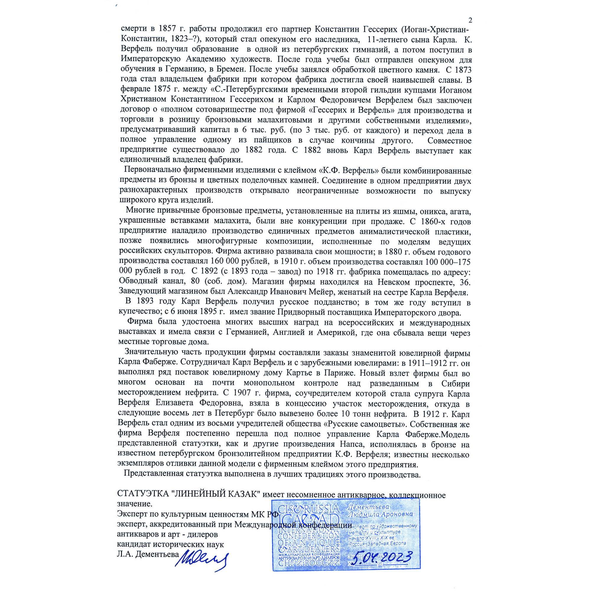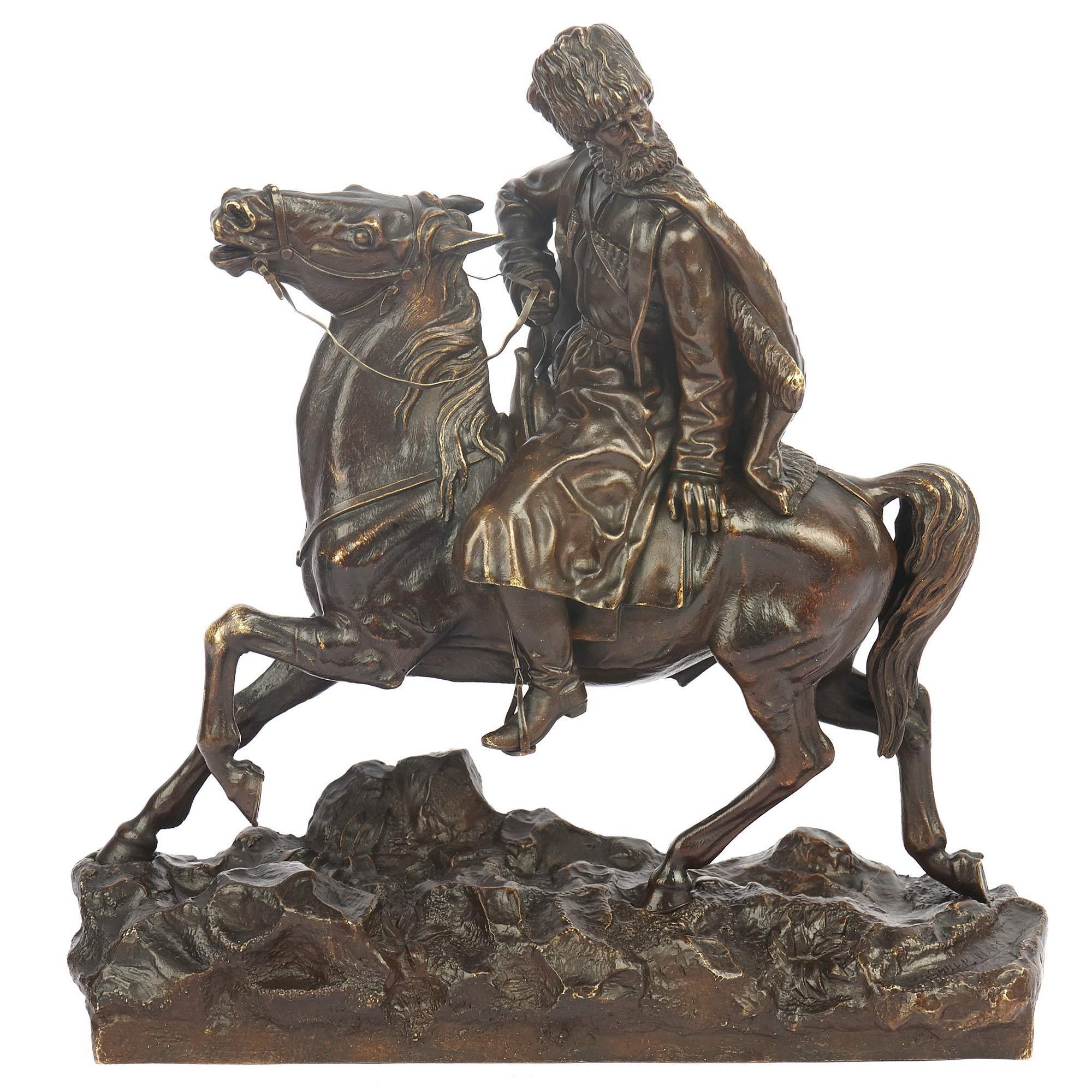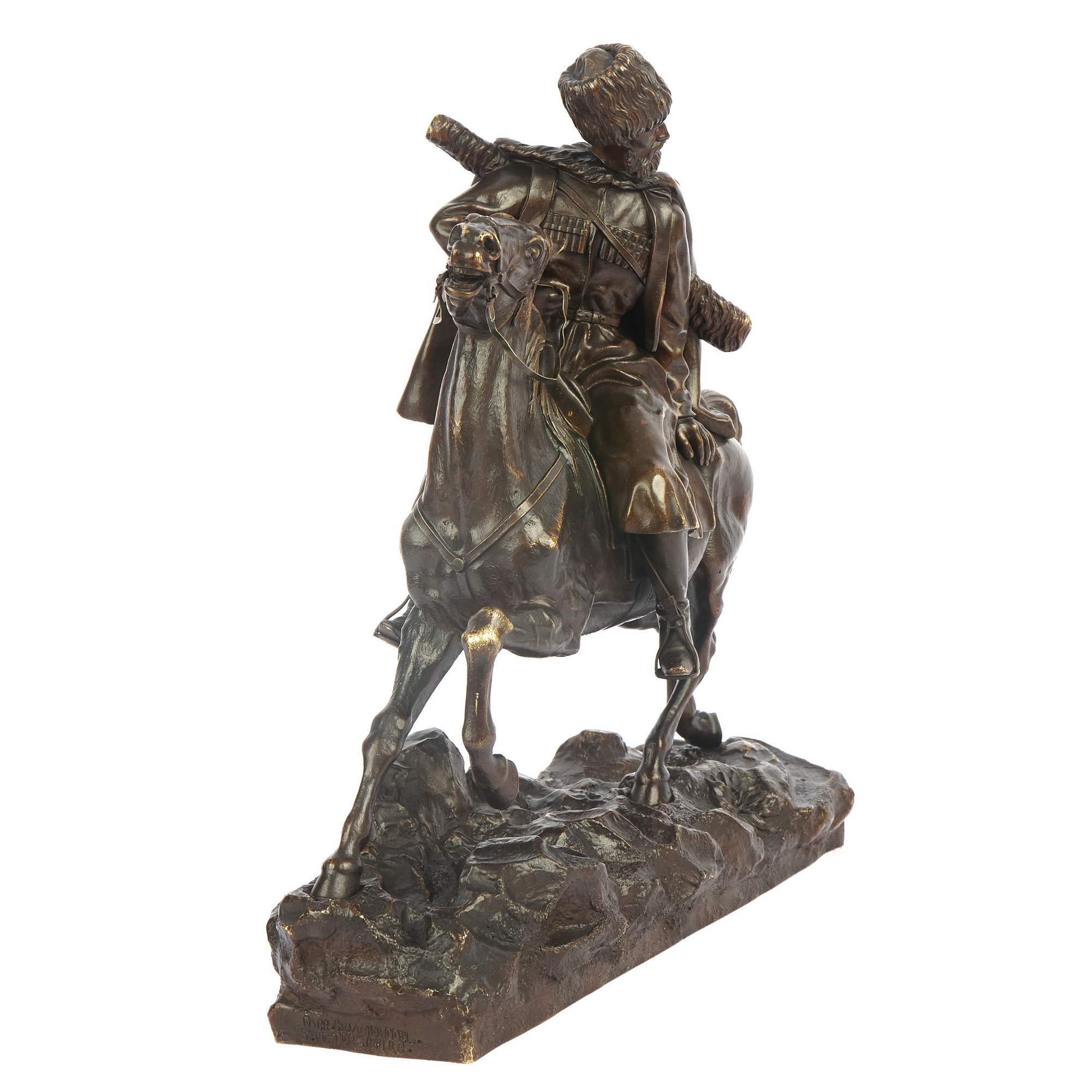 Редкий образец русской камерной бронзы с изображением всадника в одежде линейного казачьего войска второй половины 19-го века. Автор этой модели ( 1879-го года ) известный русский скульптор , реставратор, художник Евгений Напс. Родом из прибалтийских немцев , учился и работал в Петербурге. Несомненно на творчества Напса оказало сильное влияние творчество Е А Лансере. Линейные казаки - представители русского казачества жившие и несшие службу на так называемой кавказской линии, системе пограничных войск на кавказе в 18-19-х веках. Скульптор уделил большое внимание даже мелким деталям композиции, одежды и амуниции. Все эти творческие задумки автора смогла воплотить в металле известная бронзолитейная фабрика Карла Верфеля в Санкт Петербурге, основанной в 1842-м году. Фабрика имела звание Придворного Поставщика. Изделия фабрики , в том числе по моделям Е. Напса украшают многие коллекции и крупнейшие музейные собрания. Антиквариат. Хорошая сохранность . Весьма редкая модель.