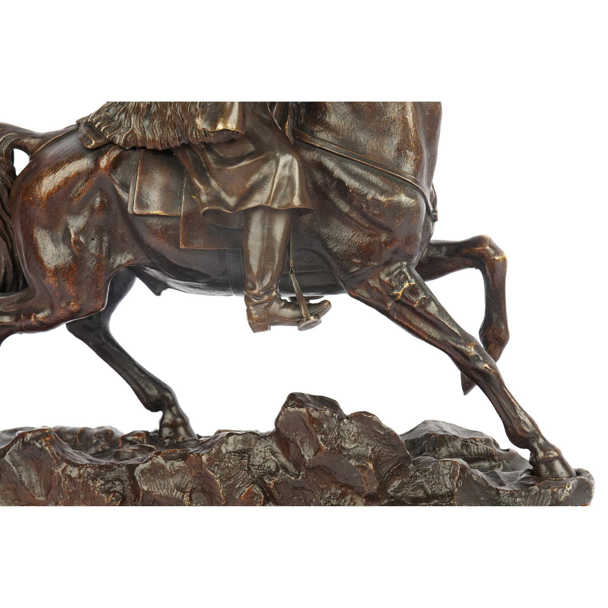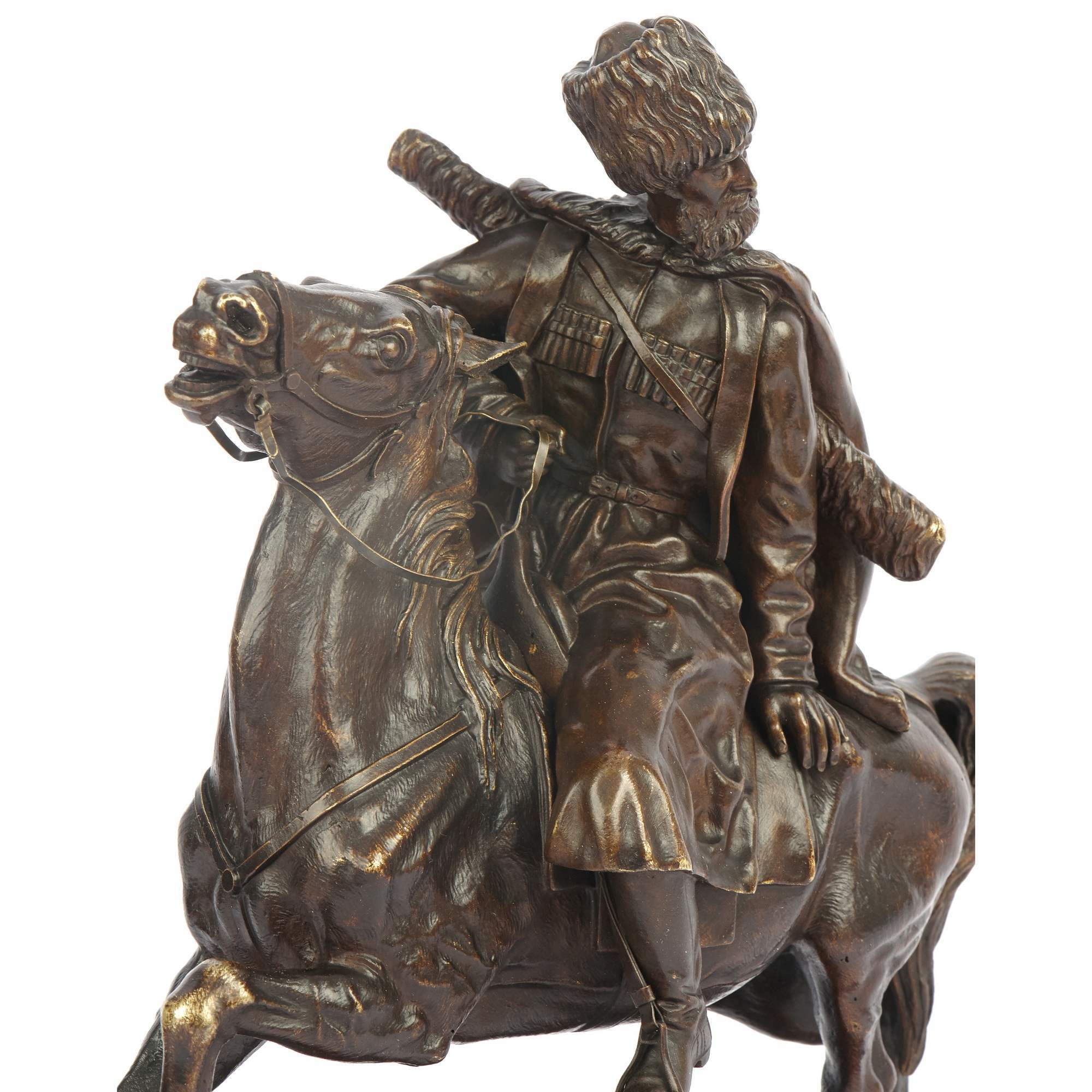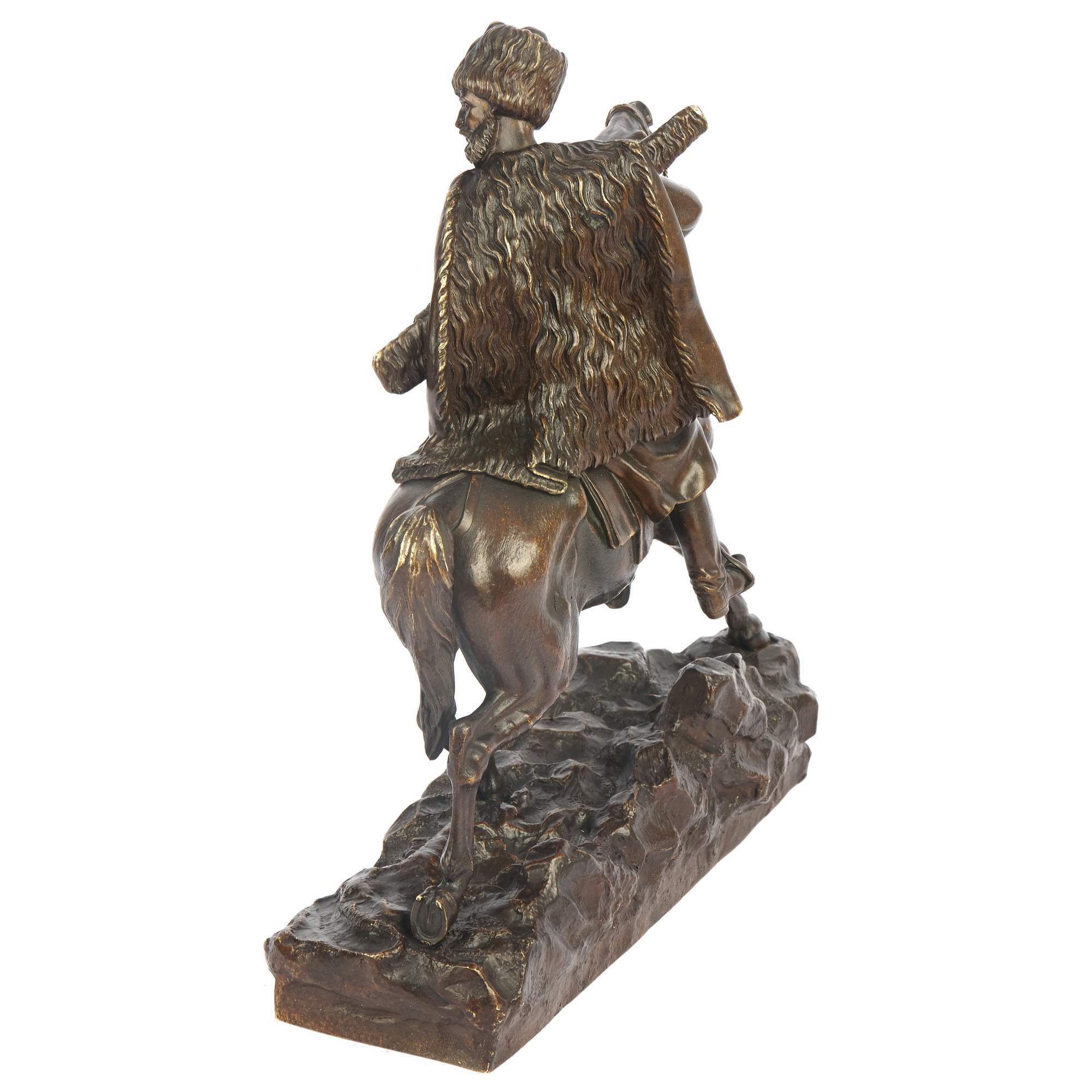 Редкий образец русской камерной бронзы с изображением всадника в одежде линейного казачьего войска второй половины 19-го века. Автор этой модели ( 1879-го года ) известный русский скульптор , реставратор, художник Евгений Напс. Родом из прибалтийских немцев , учился и работал в Петербурге. Несомненно на творчества Напса оказало сильное влияние творчество Е А Лансере. Линейные казаки - представители русского казачества жившие и несшие службу на так называемой кавказской линии, системе пограничных войск на кавказе в 18-19-х веках. Скульптор уделил большое внимание даже мелким деталям композиции, одежды и амуниции. Все эти творческие задумки автора смогла воплотить в металле известная бронзолитейная фабрика Карла Верфеля в Санкт Петербурге, основанной в 1842-м году. Фабрика имела звание Придворного Поставщика. Изделия фабрики , в том числе по моделям Е. Напса украшают многие коллекции и крупнейшие музейные собрания. Антиквариат. Хорошая сохранность . Весьма редкая модель.