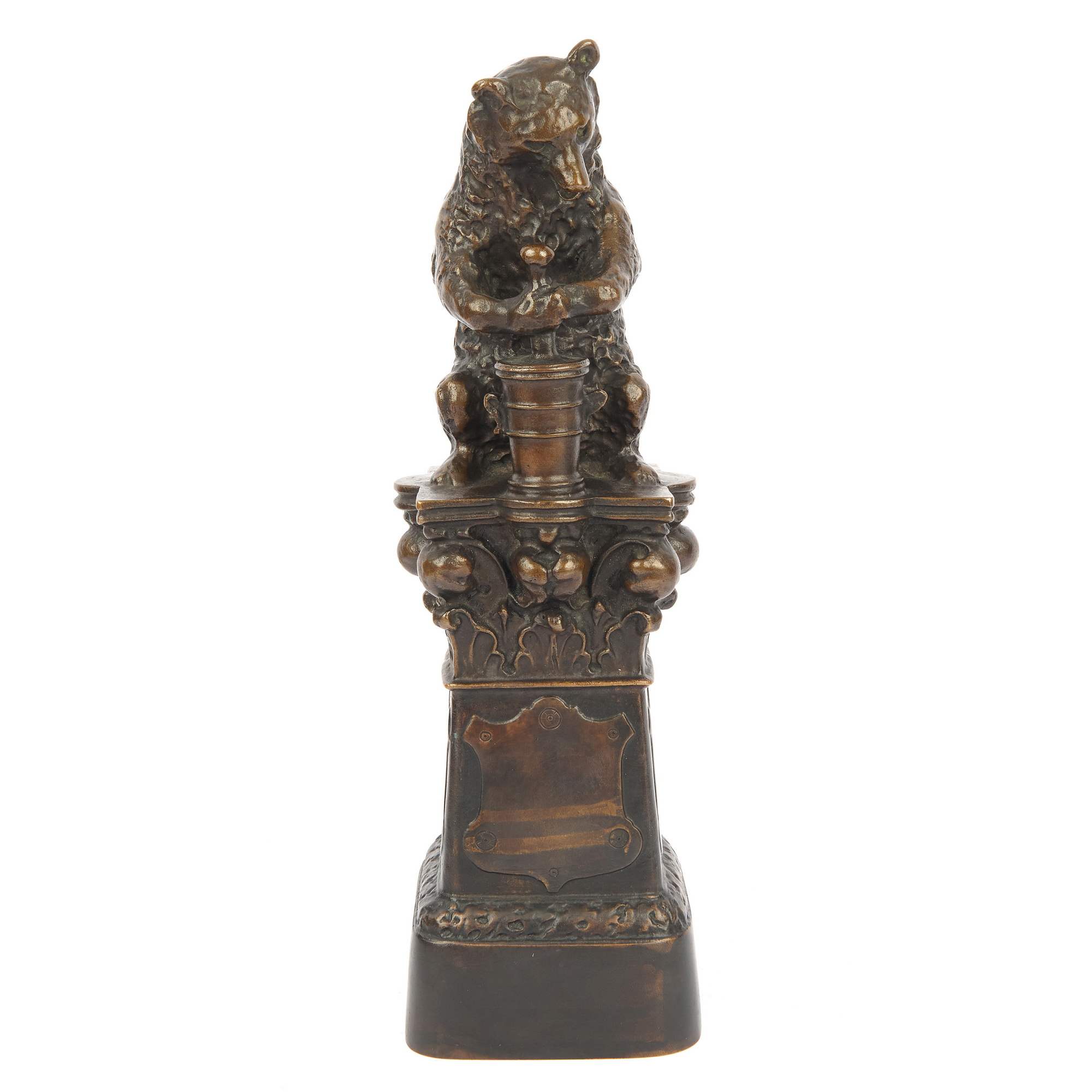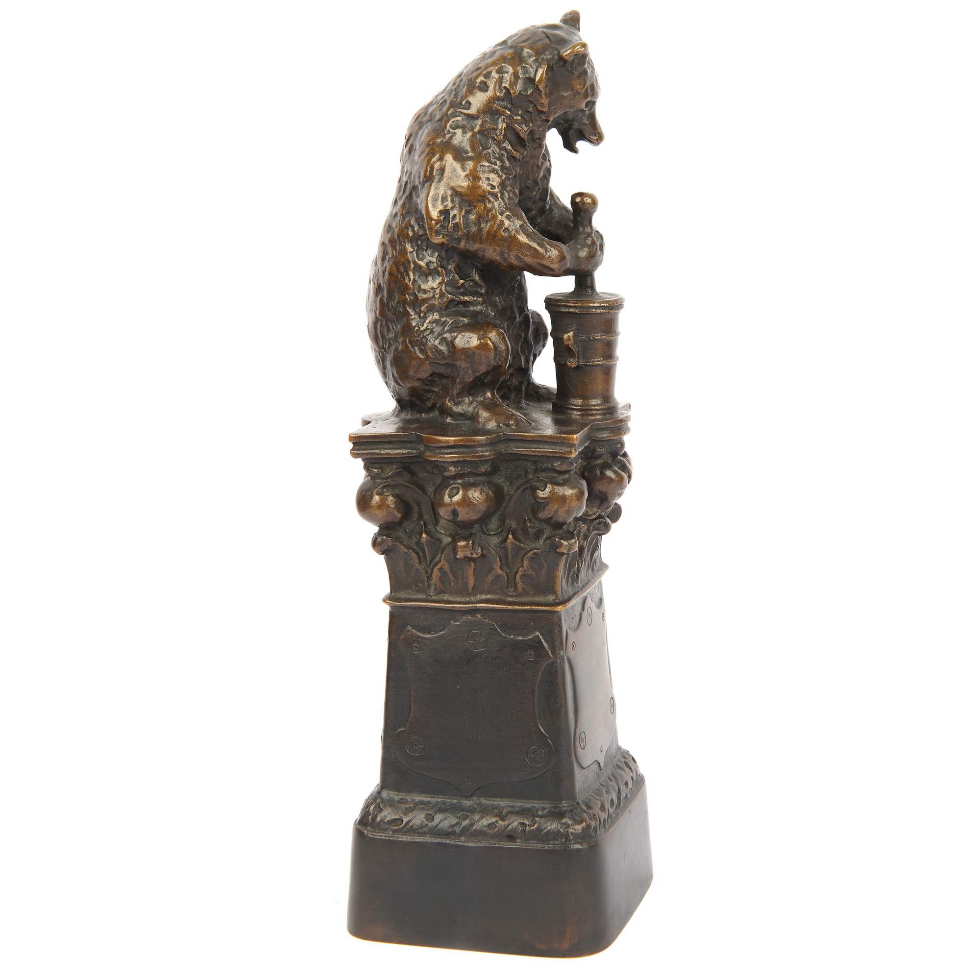 Занятная старинная скульптура с очень славным сюжетом, мишка пасечник. Редкий образец раннего творчества известного шведского литейного предприятия основанного Германом Бергманом в 1895-м году в Стокгольме. Предприятие, благодаря высокому художественному уровню и отличному качеству литья быстро стало лидером рынка. Предприятие существует и поныне.