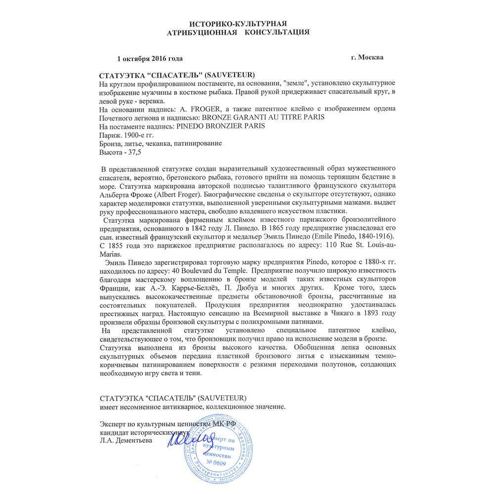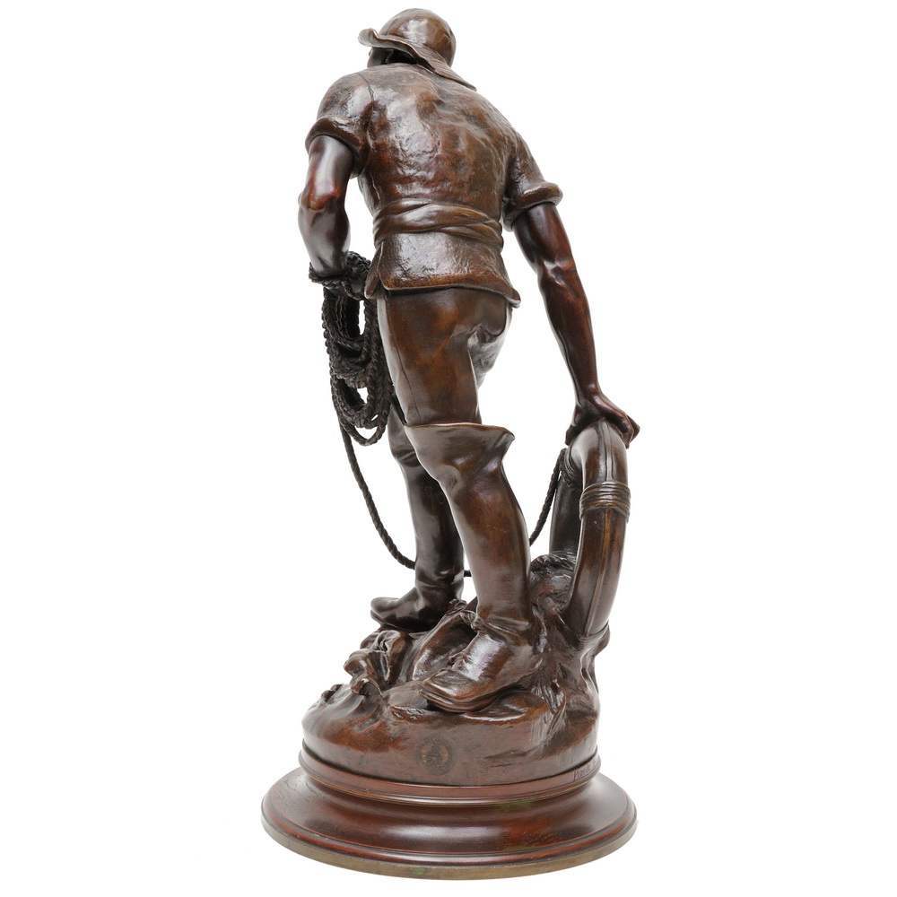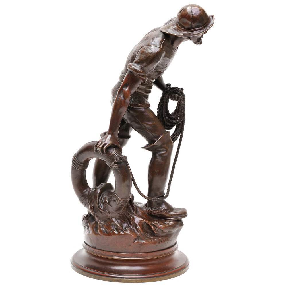 Превосходная скульптура «Спасатель». Замечательно проработанный сюжет, отлично воплощен в бронзе одной из лучших бронзолитейных фабрик Франции - Пинедо. Антиквариат.
