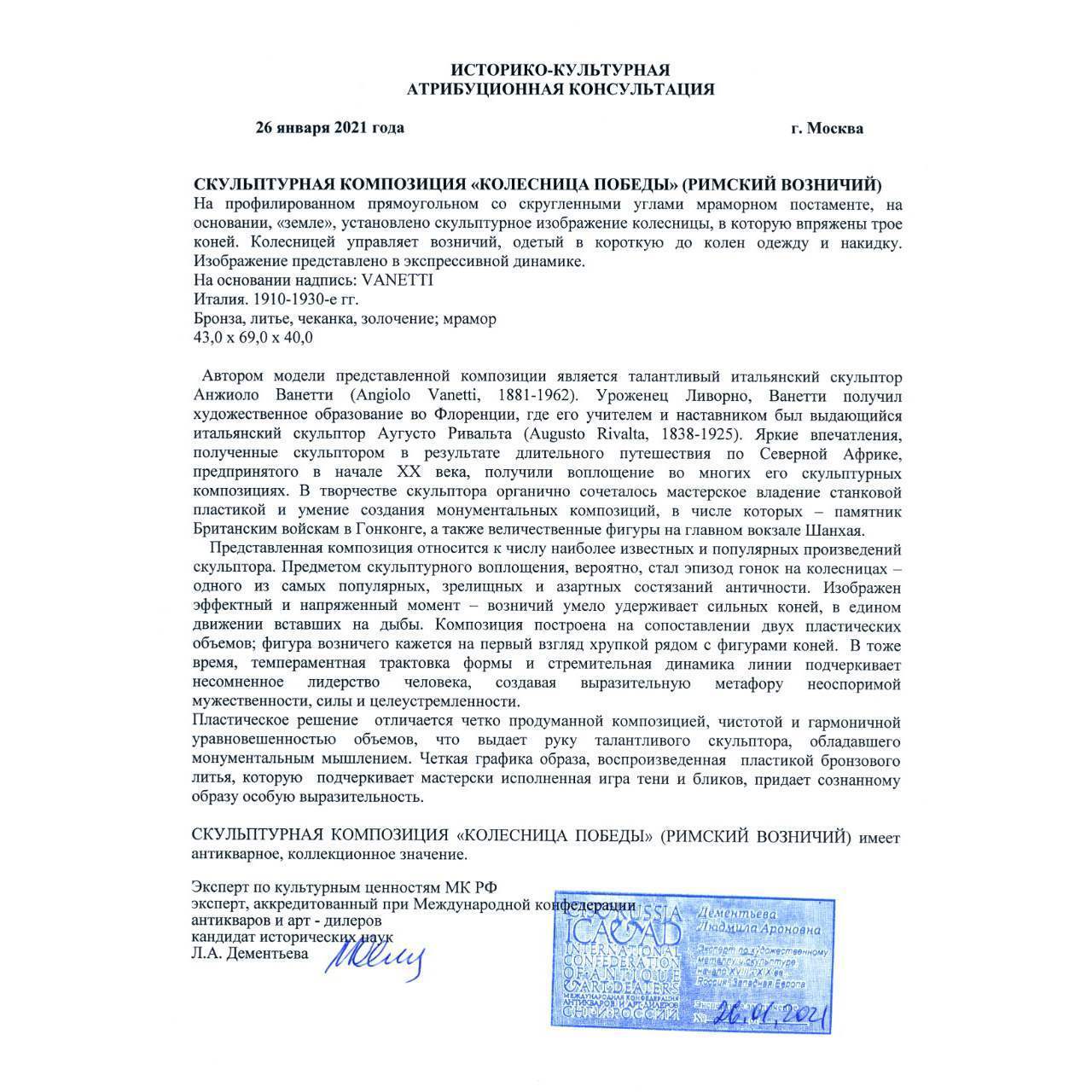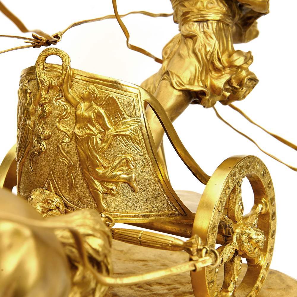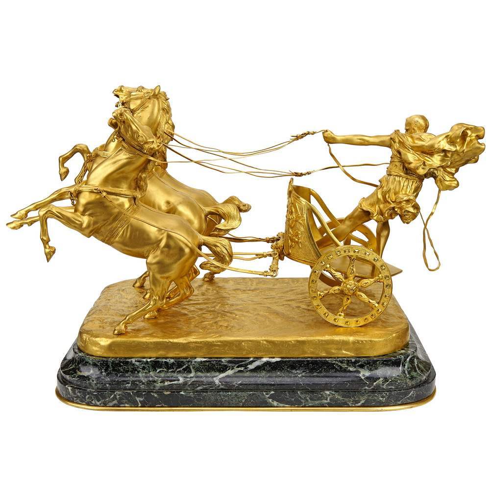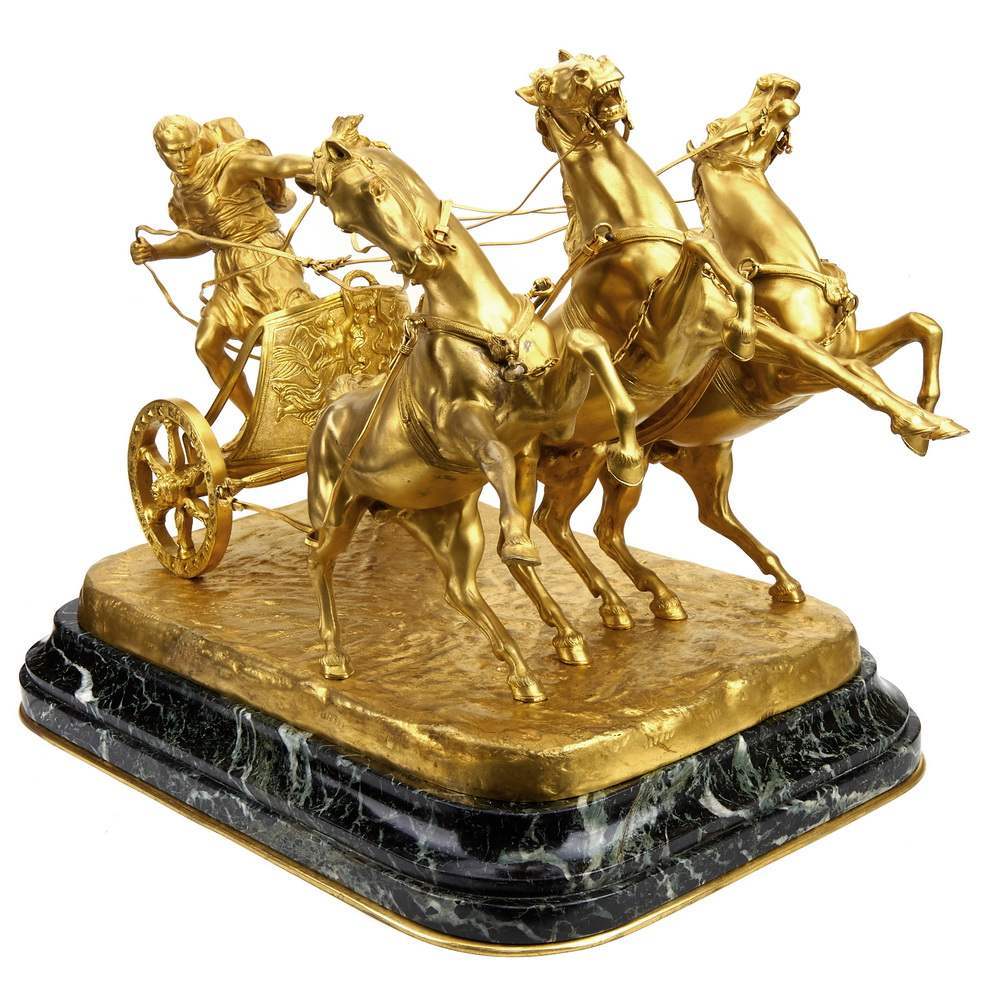 Великолепная, большая парадная колесница с возничим, как олицетворение Победы. Известный скульптор. Прекрасное сочетание крытой золотом бронзы и зеленого мрамора. Антиквариат.