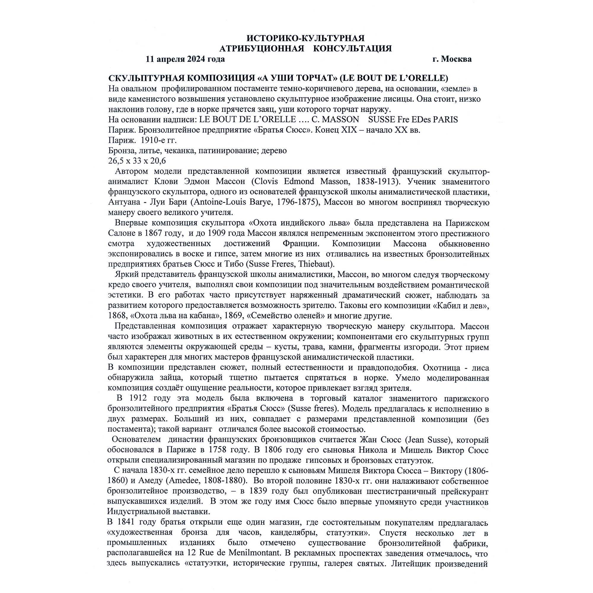 Редкая, старинная скульптурная композиция изображающая охотящегося лиса, замершего над норой зайца, исполненная по модели известного французского скульптора анималиста Клови Эдмон Массона (1838-1913), ученика основателя французской школы анималистической пластики великого Антуана-Луи Бари. Как и его учитель, он был ярким представителем романтического направления, создавая свои произведения таким образом, чтобы вызвать у зрителя эмоции, впечатление. Мастер запечатлел хищника в период кульминации охоты, в момент максимального напряжения, сохранив при этом легкость и даже некоторую игривость. Изображения лисиц популярны у коллекционеров и любителей искусства, однако встречаются достаточно редко. Данная скульптурная композиция особенно выразительна благодаря великолепному уровню литья, что является заслугой знаменитого французского бронзолитейного предприятия «Братья Сюсс» - одного из лучших в Европе. Хорошая сохранность. Антиквариат.