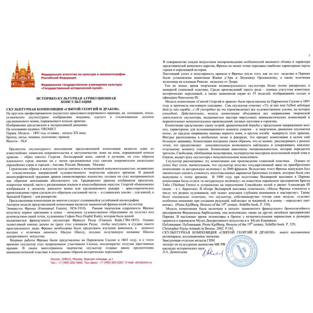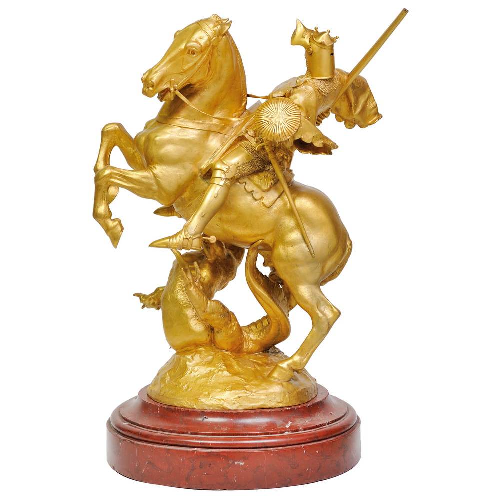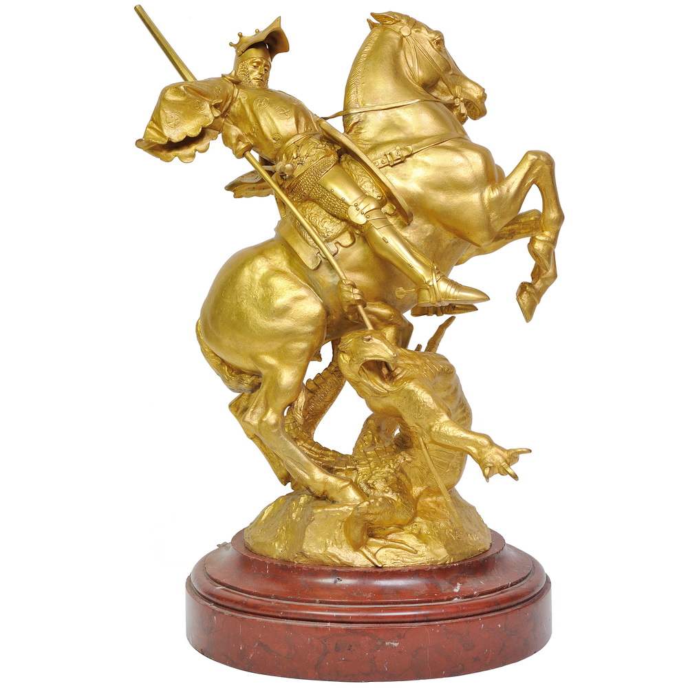 Перед нами великолепная скульптурная композиция изображающая битву Святого Георгия с драконом. Она превосходно отлита по модели одного из самых талантливых и известных скульпторов Франции 19-го столетия Эммануэля Фремье. Его работы находятся во многих коллекциях и музейных собраниях. Украшают площади и улицы городов, например памятник Жанне Д’ Арк в Париже. Скульптура отличного качества с шикарным «родным» золочением. Антиквариат