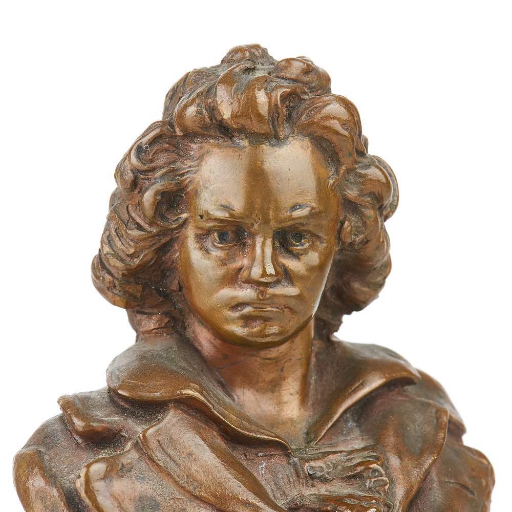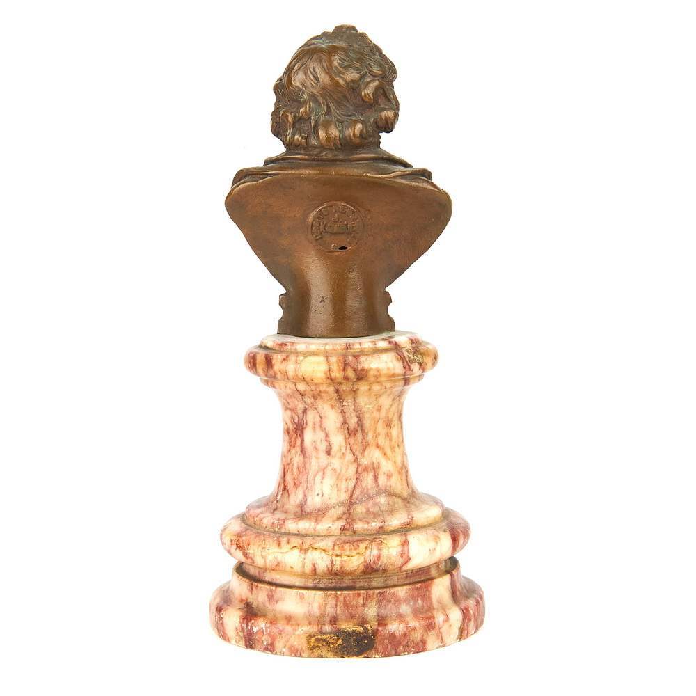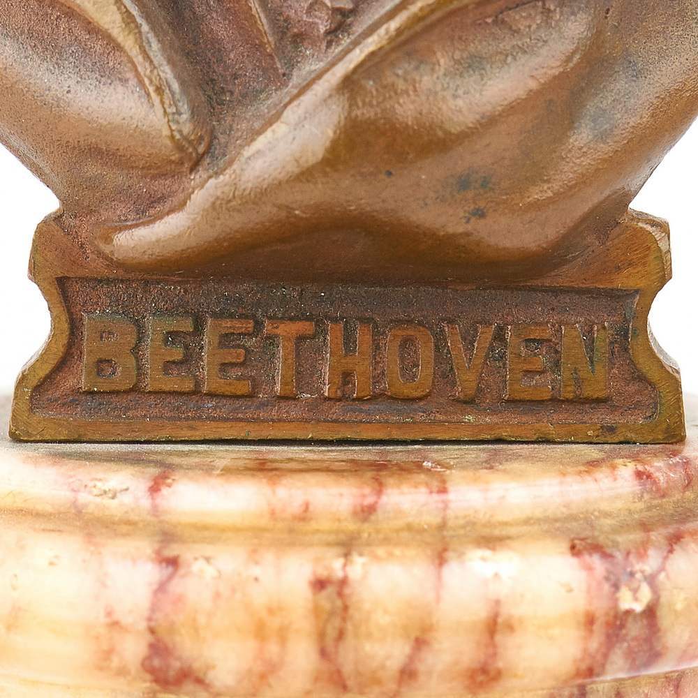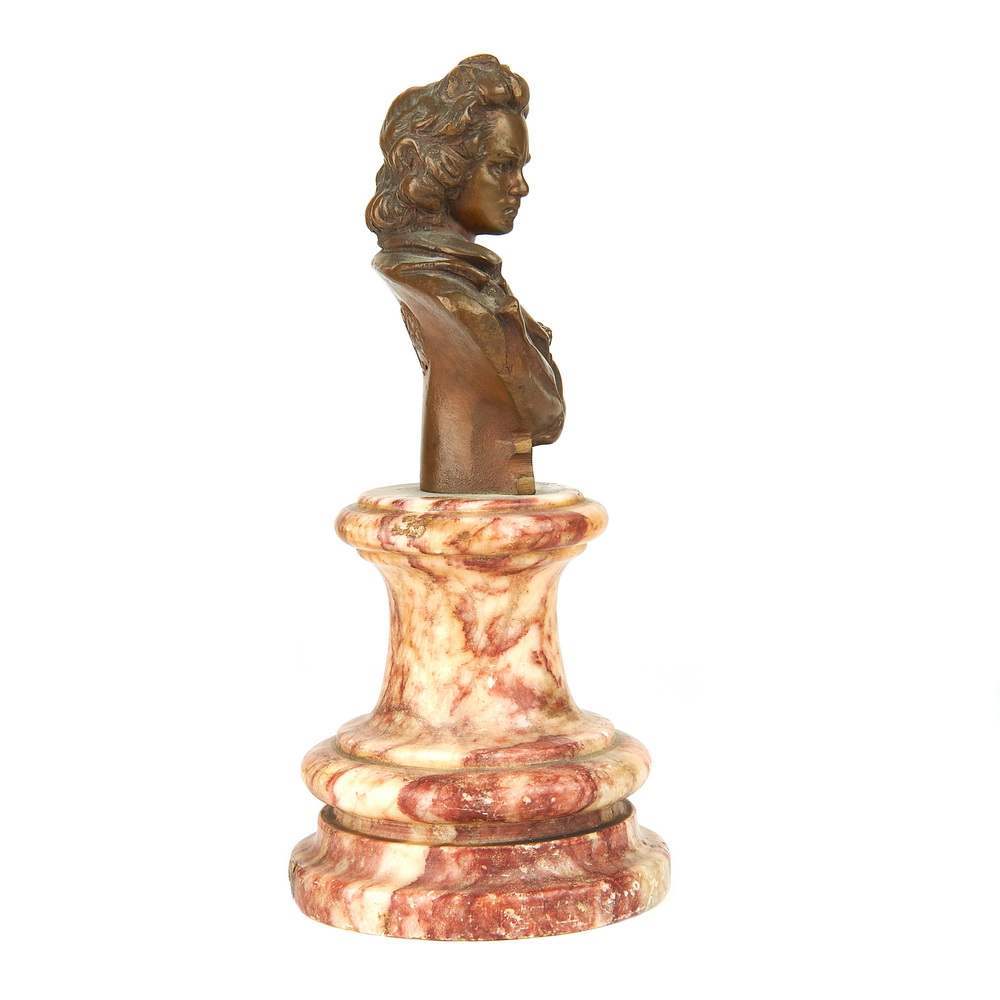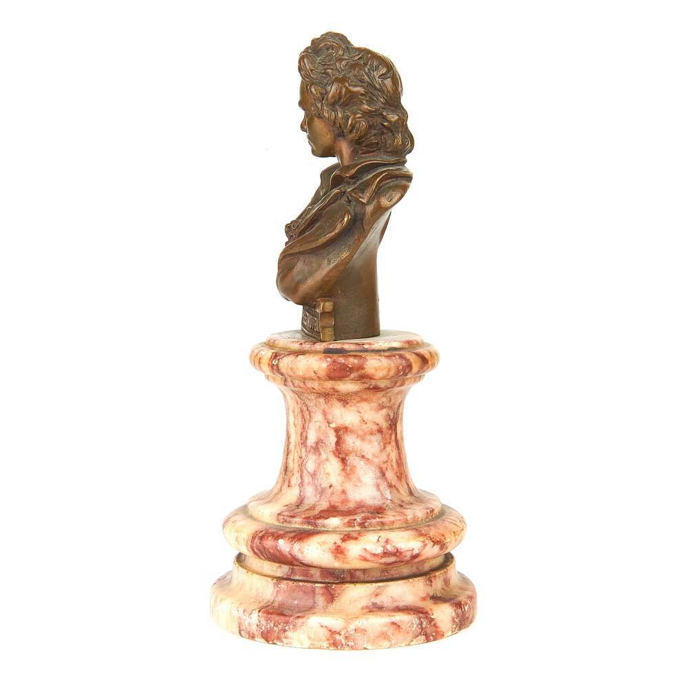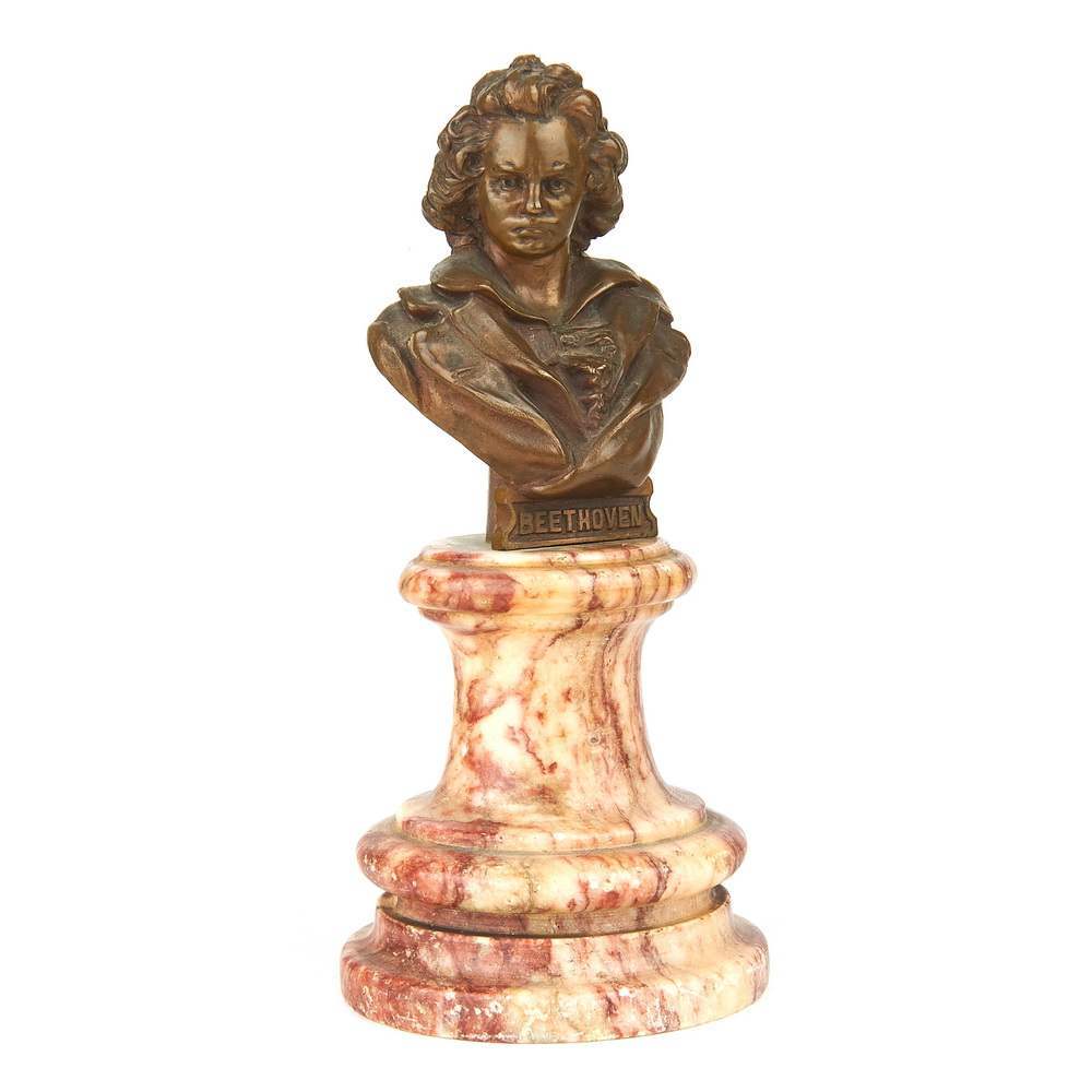 Небольшой старинный бюстик композитора Бетховена, на мраморном основании. Антиквариат. Западная Европа. Начало XX века. Бронза, литье, патинирование, камень. Высота - 17,0 см.
