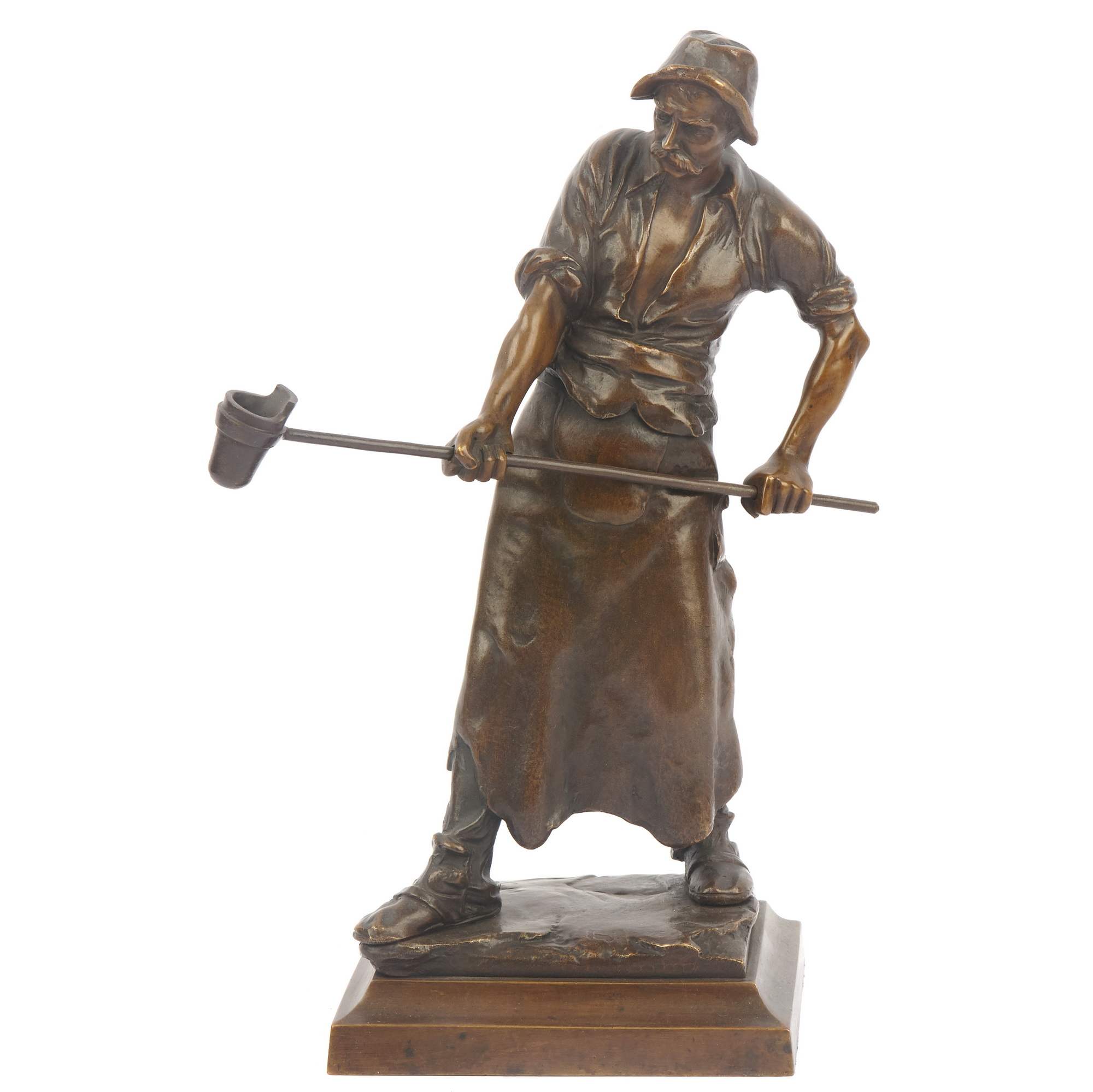 Замечательная статуэтка литейщика, отлитая по модели известного немецкого скульптора Константина Холанда. Умело передана красота тяжелого труда, представленного как возвышенный творческий процесс. Неспешное движение рабочего, горделивая посадка его головы, уверенный разворот плеч, особенная мужественность и красота - образ созидательного труда показан выразительно, создает впечатление монументального величия. Энергичная моделировка отчетливо выявлена пластикой бронзового литья с тщательной прочеканкой поверхности. Также немало способствует красоте предмета высококачественная патинировка эффектной тональности с резкими сочетаниями полутонов, создающими игру света и бликов. Отлита эта великолепная статуэтка по модели известного немецкого скульптора Константина Холанда. Его произведения часто экспонировались на художественных выставках, привлекая внимание и заслуживая похвалы публики. Некоторые модели скульптора исполнялись даже на знаменитом бронзолитейном предприятии Берлина «Гладенбек и сын». Стоит отметить, что высокое качество литья и обработки бронзовой поверхности позволяет сделать вывод о том, что представленная скульптура была отлита на одном из крупных бронзолитейных предприятий Берлина, обладавших всеми необходимыми художественными и техническими возможностями для создания произведений подобного уровня. Подобные композиции пользовались заслуженной популярностью, были особенно востребованы в среде крупных европейских промышленников и предпринимателей, их часто приобретали для украшения деловых кабинетов или в качестве представительских подарков.