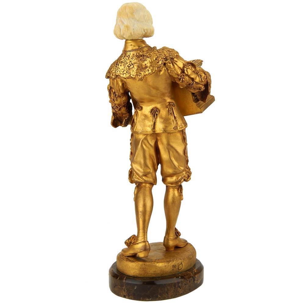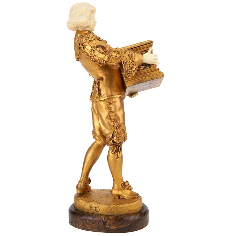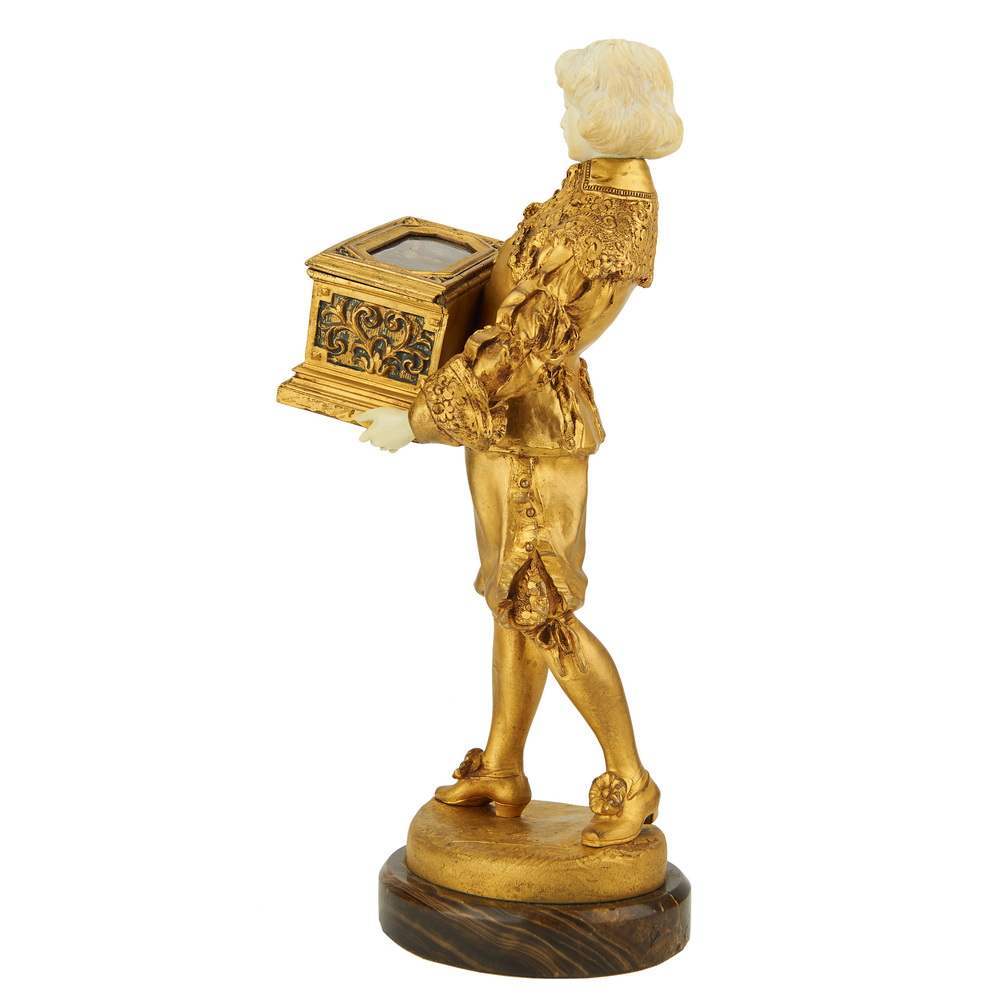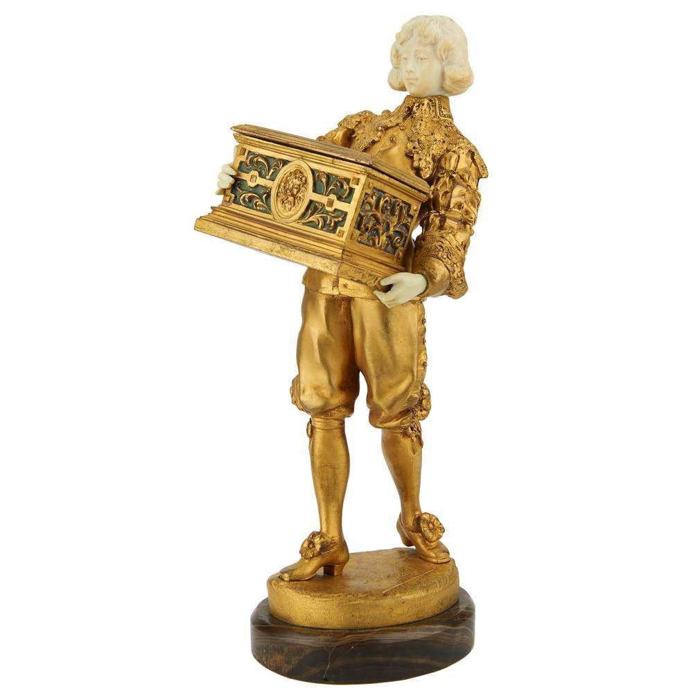 Перед нами весьма редкая, необычная скульптура «Паж с ларцом для драгоценностей». Статуэтка - эффектный образец исторической стилизации, метода, к которому иногда прибегали мастера Арт - Деко.