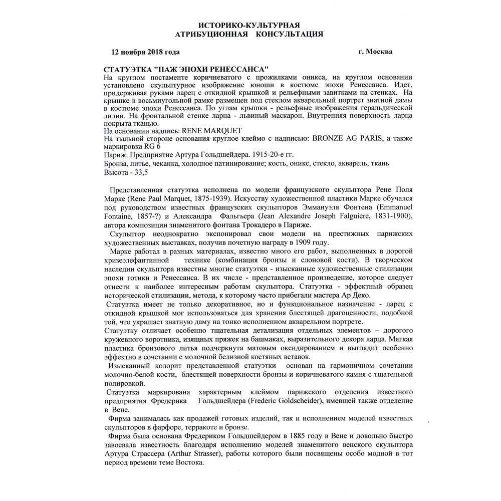 Фигуру отличает высокое качество исполнения, что и немудрено, ведь изготовлена она в мастерской Артура Гольдшейдера. Эта замечательная мастерская выпускала очень высокохудожественную, качественную продукцию. Например именно у них предпочитал изготавливать свои шедевры Деметр Чипарус. Ларец в руках пажа просто замечательный. Он самый настоящий, в нем можно хранить драгоценности ( внутри обклеен дорогим, современным, натуральным бархатом, бархат заменен для удобства пользования ). Картинка на крышке ларца, настоящая акварель того времени. Антиквариат. Хорошая сохранность.