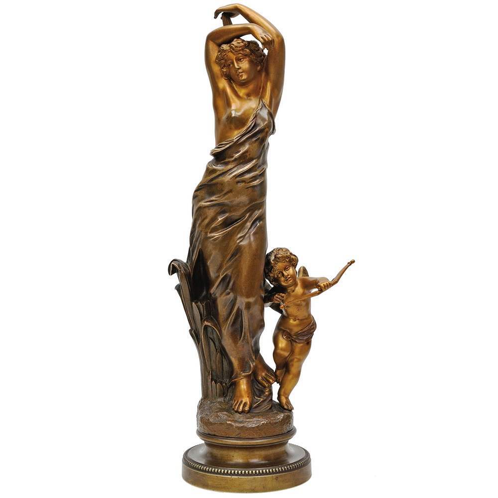 Грациозным, почти танцевальным движением подняла руки молодая девушка композиции «Предчувствие любви» французского скульптора Эмиля Лапорте. Чуть придерживая тонкую драпировку, обвивающую стройную фигуру, она словно готова в следующее мгновение опустить руки и предстать обнажённой, открываясь любовному чувству во всём блеске цветущей женской красоты. Прильнувший к девушке крылатый Амур с луком в руке не оставляет сомнений, ведь его стрела уже пущена.