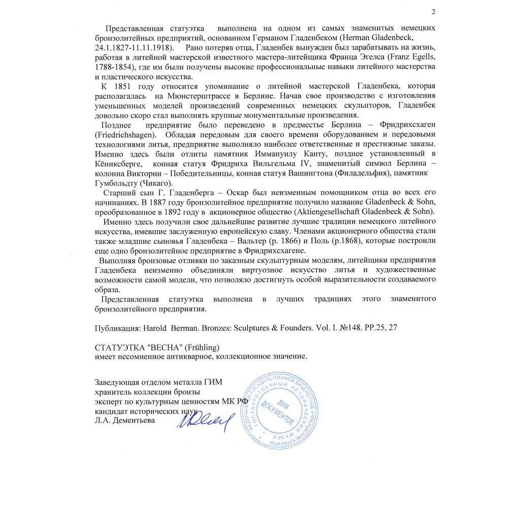 Берлин. Модель - 1890 года. Отливка - Бронзолитейное предприятие H.Giadenbeck конец 1890-х гг. Автор модели Питер Бройер 1856 - 1930. Бронза, литье, чеканка, патинирование, мрамор. Размер - 17,0х20,5х14,0 см. Экспертное заключение ГИМ.