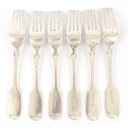 Набор красивых старинных фруктовых ножиков, выполненных самой известной ювелирной фирмой России: Фаберже. Фирма поставляла изделия ко многим императорским дворам Европы, в том числе русскому – самого Карла Фаберже называли «Ювелир Его Величества». Его фамилия до сих пор остается синонимом слов роскошь и мастерство, поскольку ему удавалось создавать произведения, тонкость исполнения которых и гармоничная красота граничили с невозможным. Очень редко сохраняются оригинальные лезвия ножей, однако представленный набор относится к числу подобных исключений – подлинные лезвия с клеймами. Хорошая сохранность. Антиквариат.