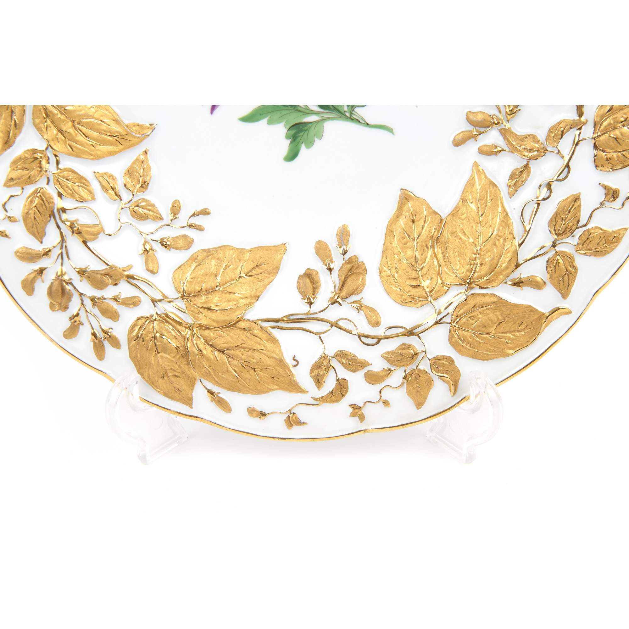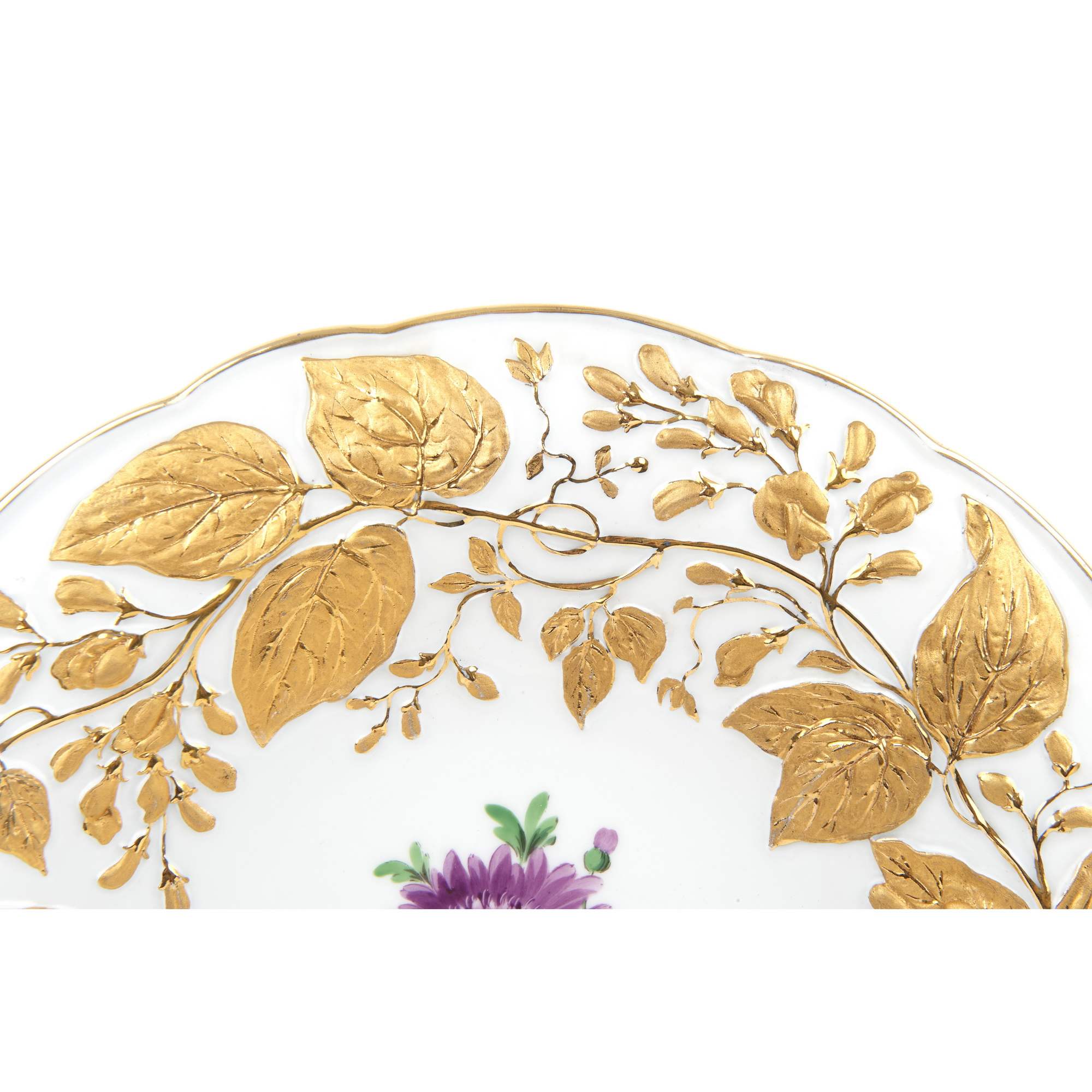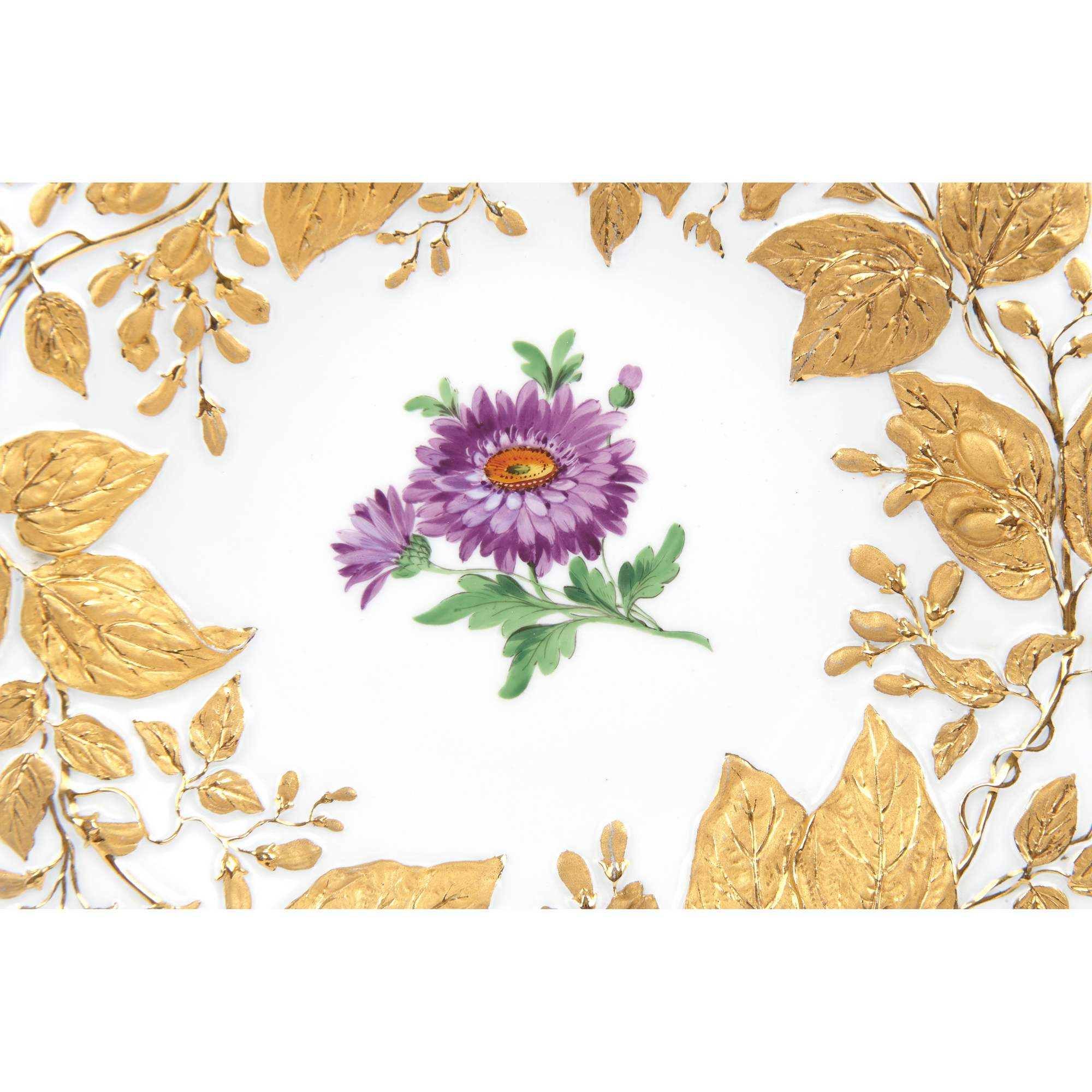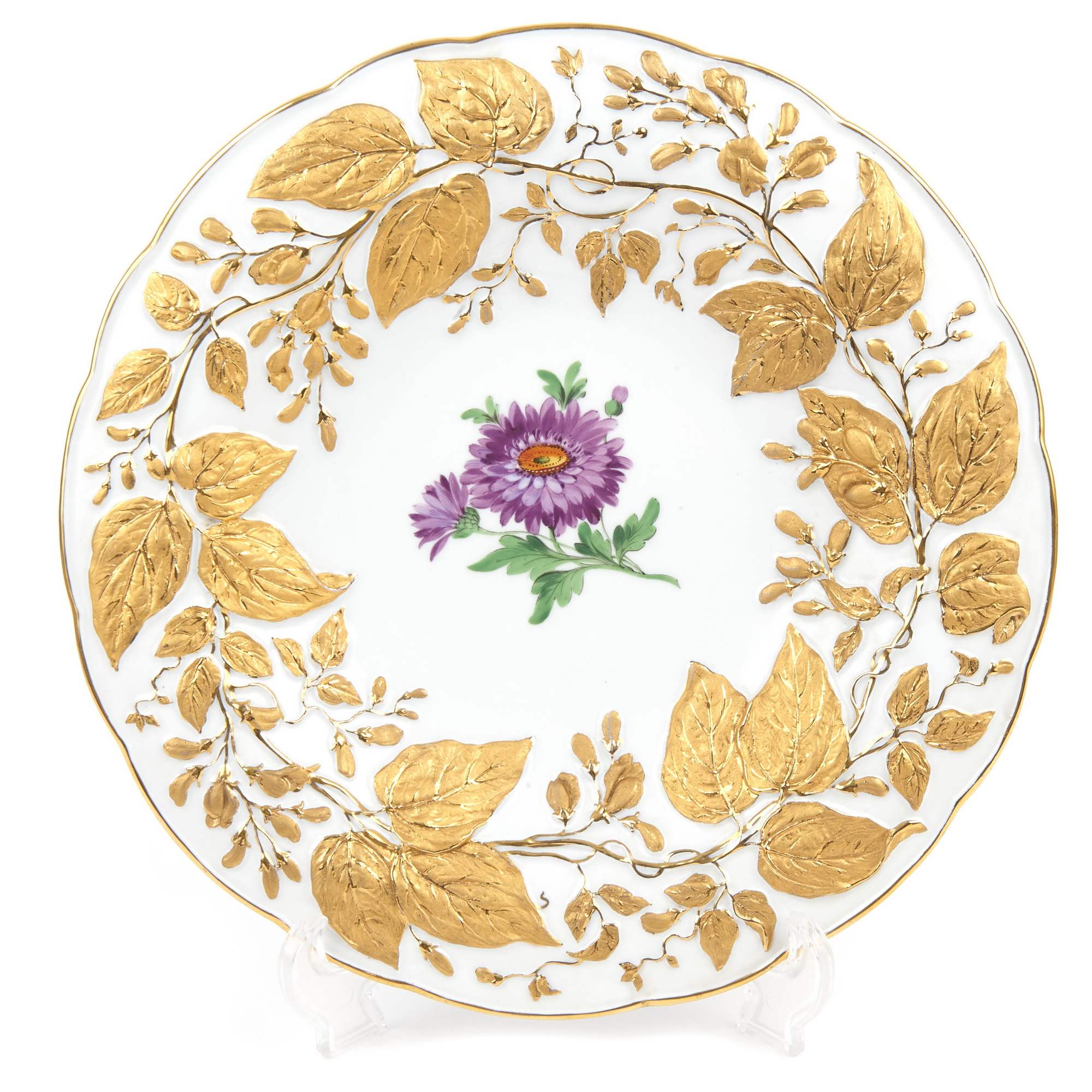 Красивое декоративное блюдо «Астры и золотые цветы», яркий образец творчества мастеров знаменитой мейссенской мануфактуры, колыбели европейского фарфора. Блюдо покрыто красивой росписью золотом по рельефу. Отличная сохранность.