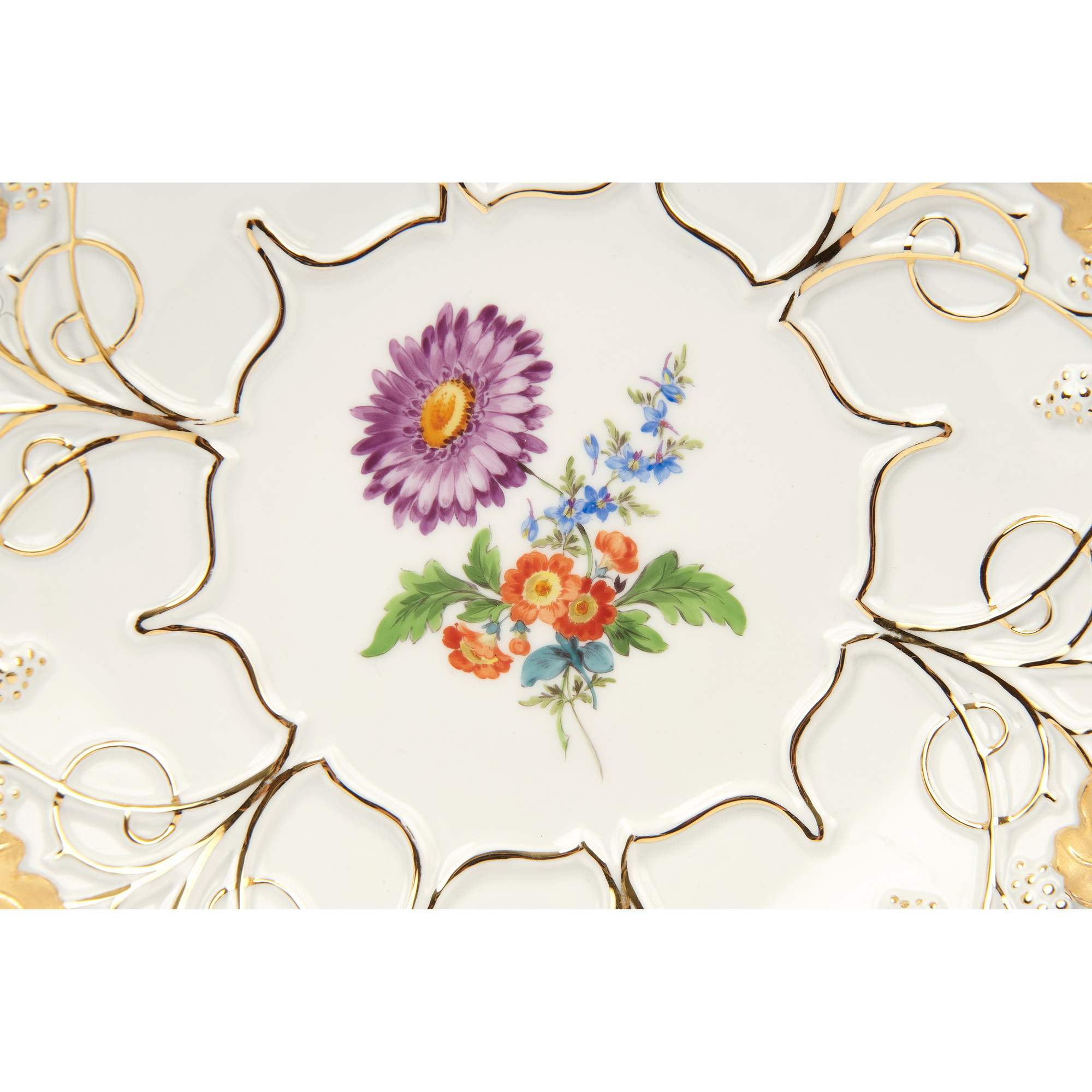 Роскошное большое блюдо «Листья и букет цветов» изготовлено на самой известной европейской фарфоровой мануфактуре MEISSEN. Колыбели европейского фарфора. Сложный рельеф блюда покрыт полихромной, надглазурной росписью , росписью золотом. Хорошая сохранность.