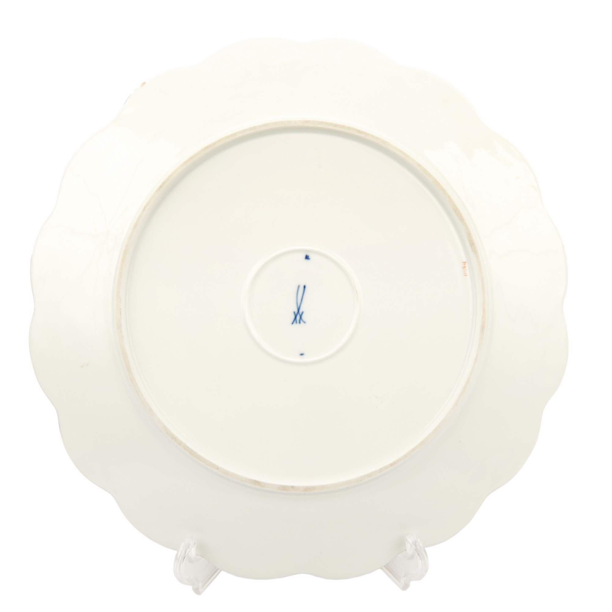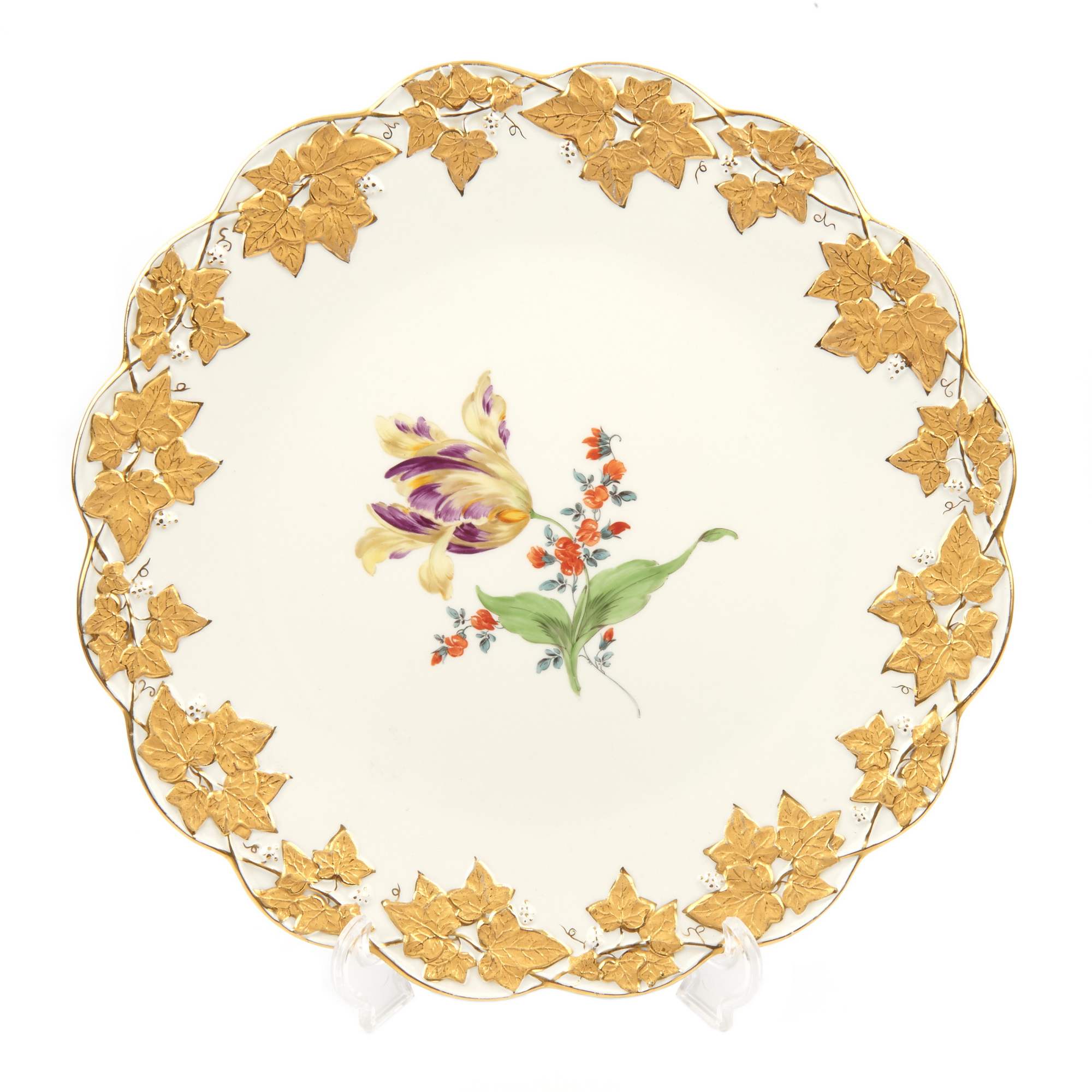 Роскошное большое блюдо «Виноградные листья и цветы». Блюдо изготовлено на самой известной европейской фарфоровой мануфактуре MEISSEN. Колыбели европейского фарфора. Сложный рельеф блюда покрыт полихромной, надглазурной росписью , росписью золотом. Отличная сохранность.