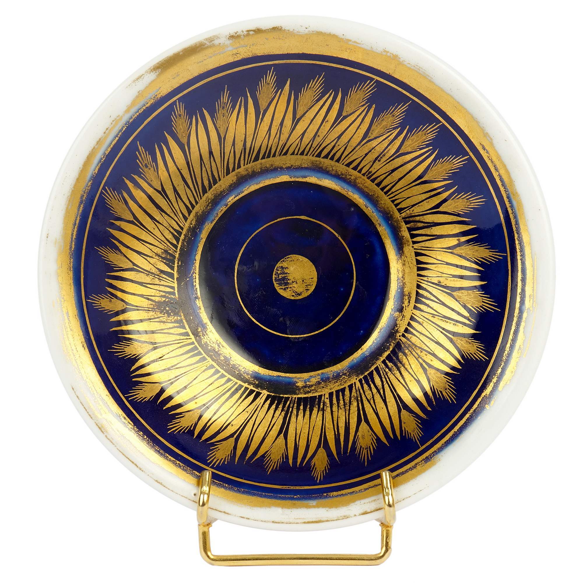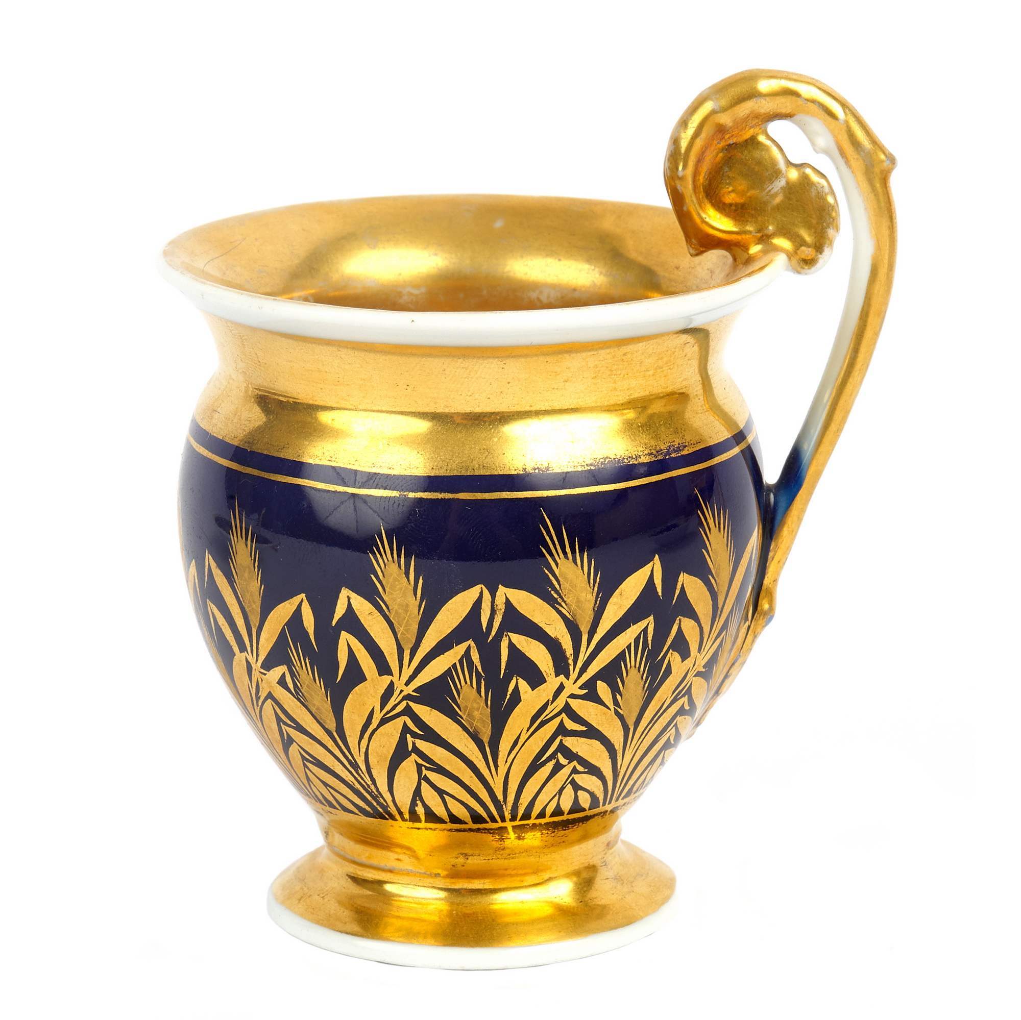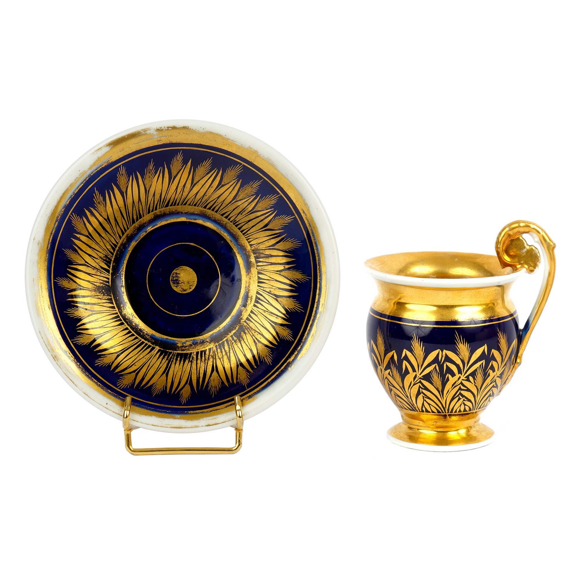 Замечательная чайная пара ( чашка с блюдцем ) с росписью золотом по кобальту в виде колосьев. Данное изделие является редким образцом раннего коллекционного русского фарфора произведенного на известном заводе Батенина в Санкт - Петербурге в 1820-е года. На блюдце присутствует марка , выдавленная в массе