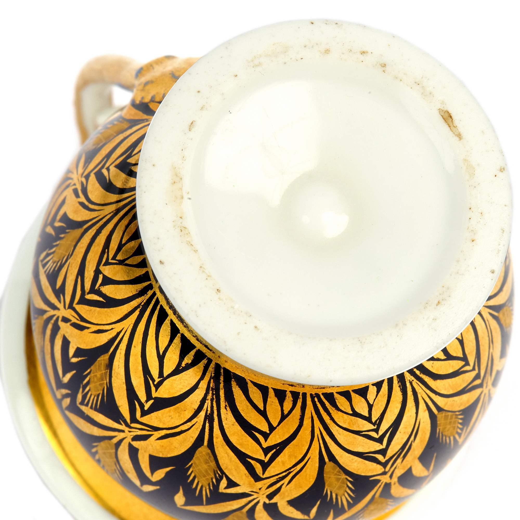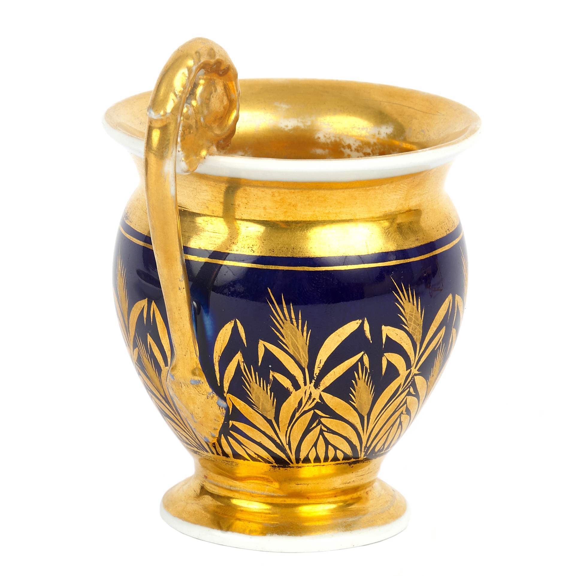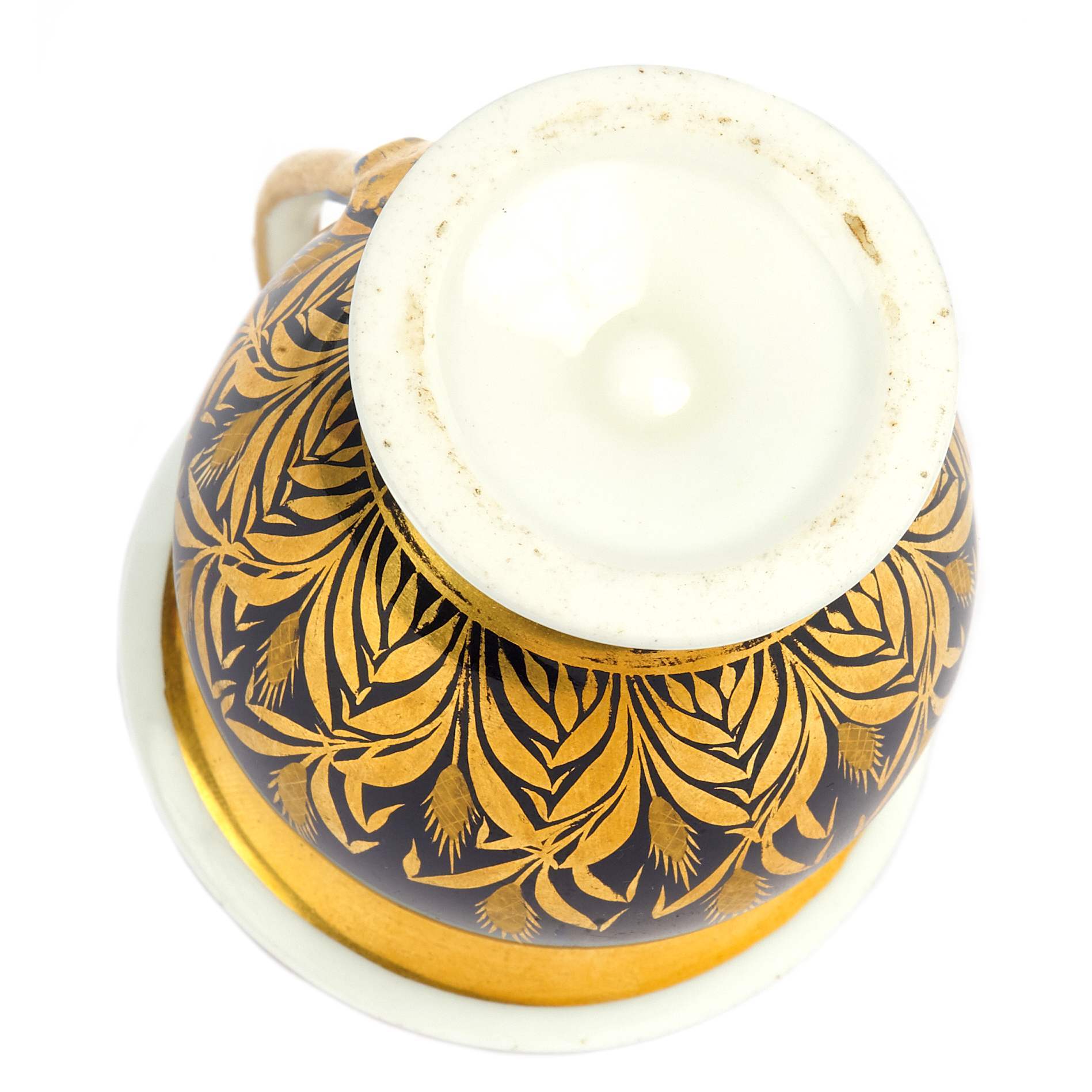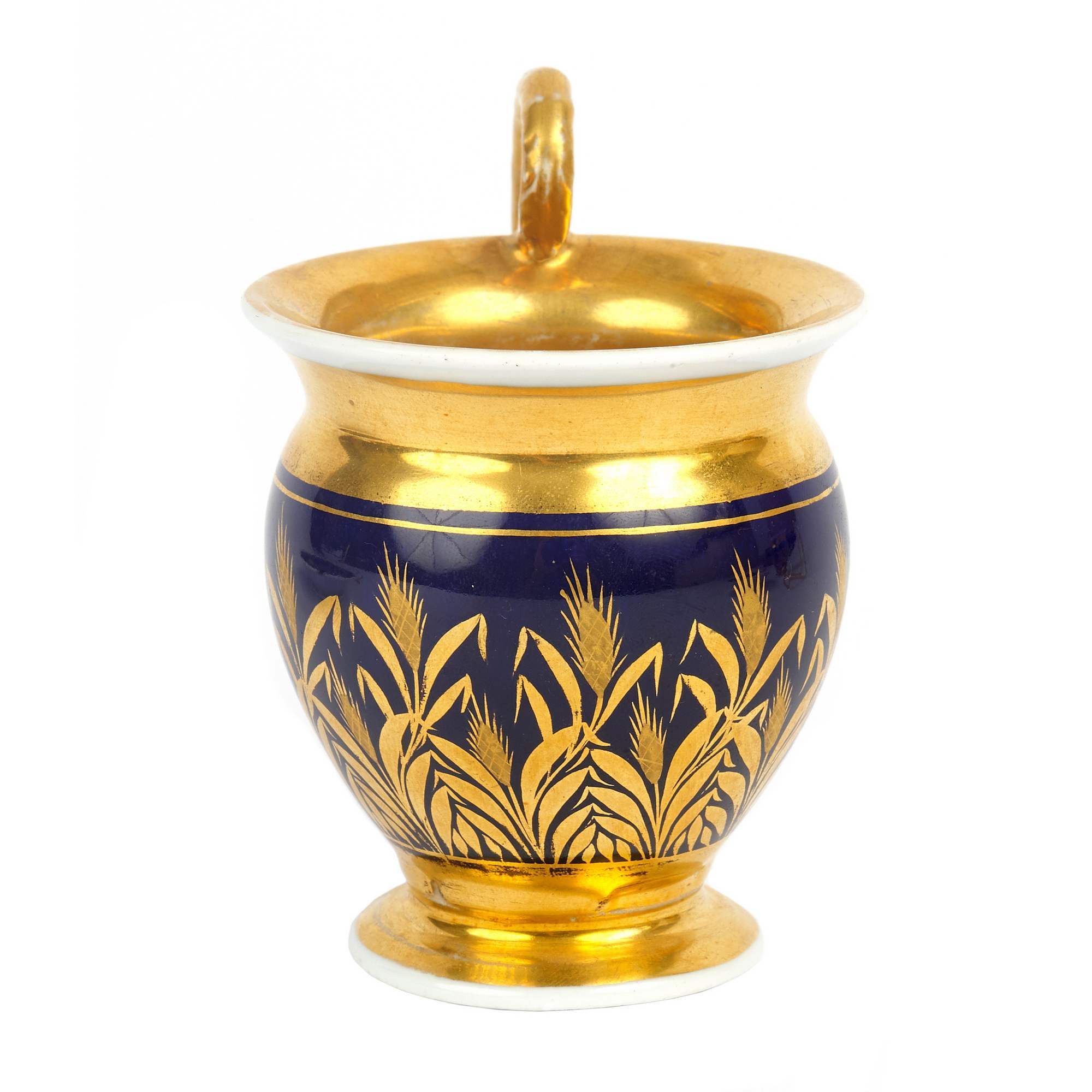 Замечательная чайная пара ( чашка с блюдцем ) с росписью золотом по кобальту в виде колосьев. Данное изделие является редким образцом раннего коллекционного русского фарфора произведенного на известном заводе Батенина в Санкт - Петербурге в 1820-е года. На блюдце присутствует марка , выдавленная в массе