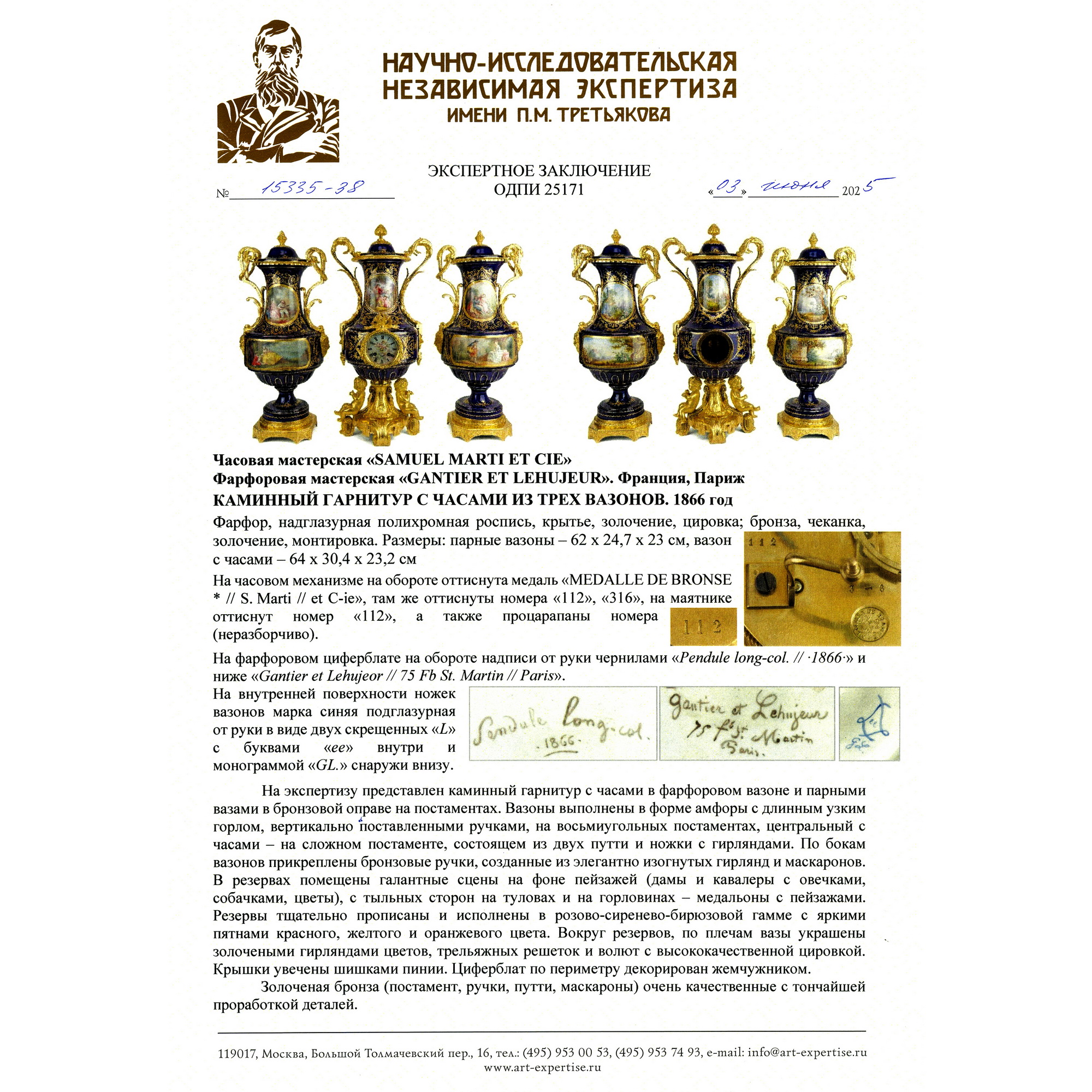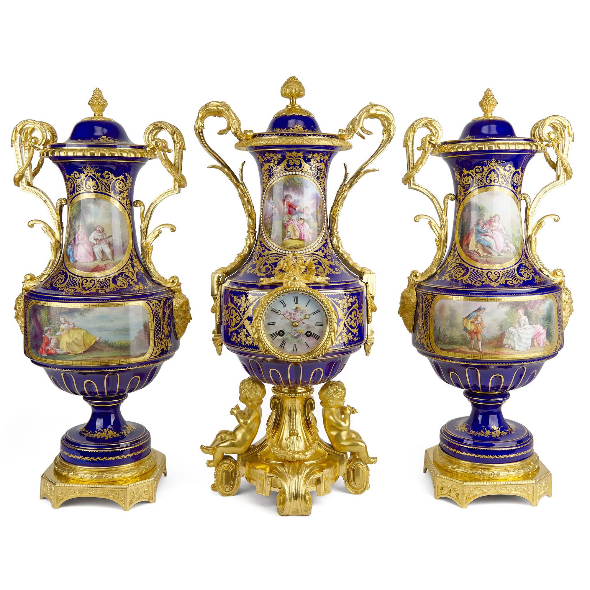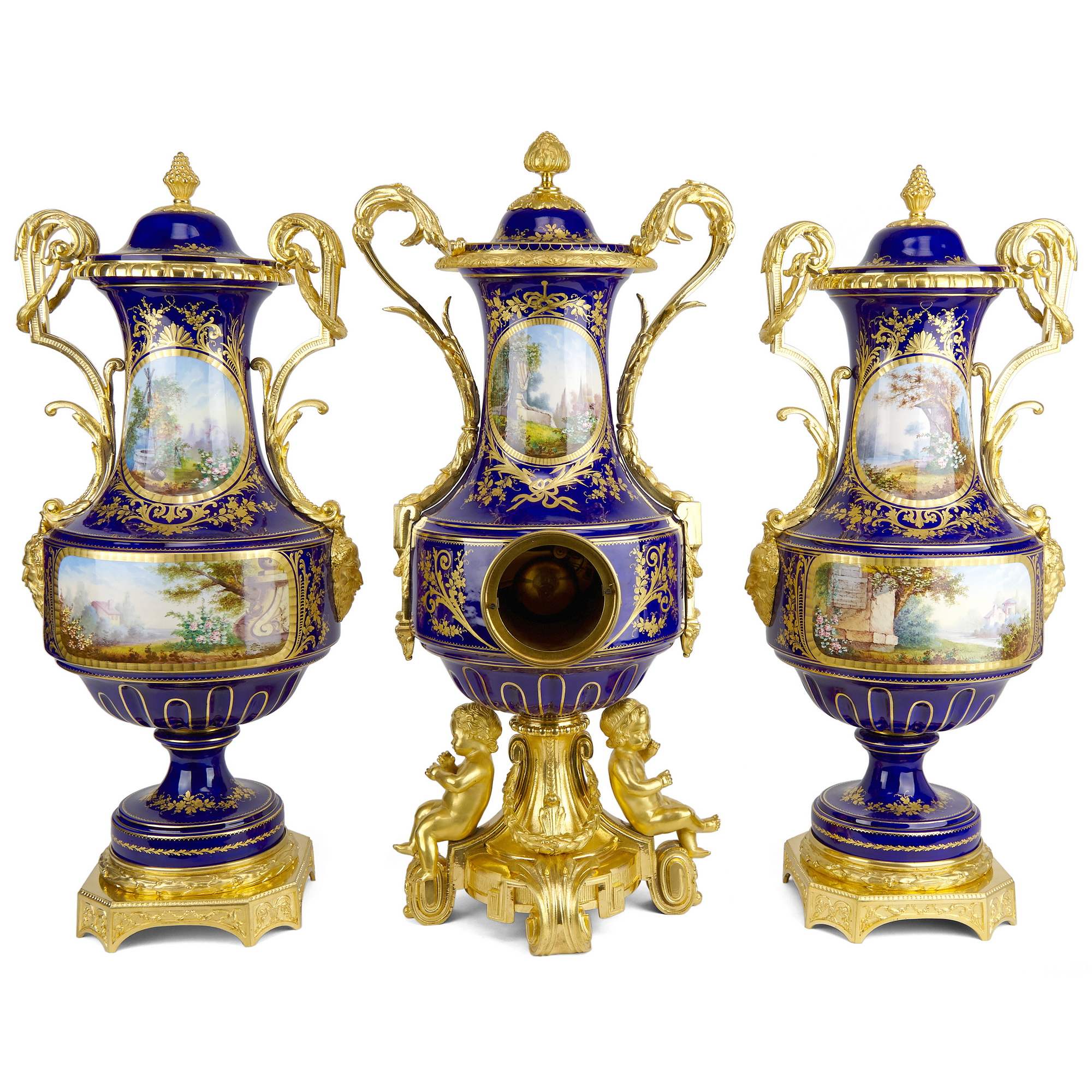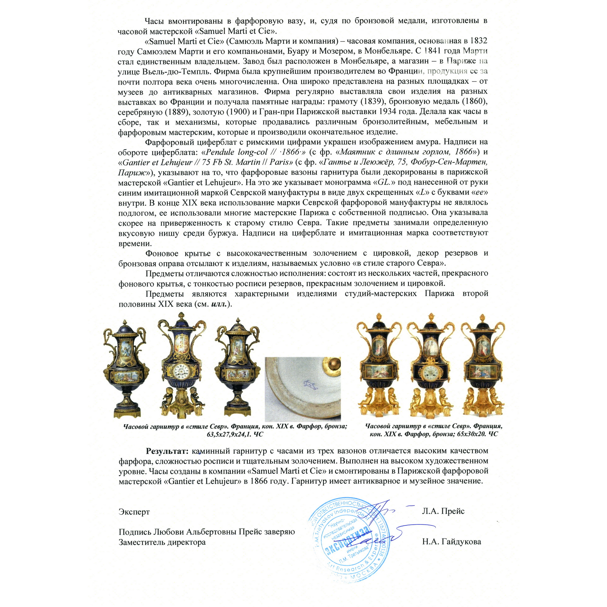 Великолепный каминный гарнитур с часами, состоящий из трех изумительных вазонов. Вазоны выполнены в форме амфоры на восьмиугольных золоченых постаментах. Постамент же центрального вазона изготовлен в виде ножки с гирляндами, по сторонам которой сидят путти. По бокам каждого вазона прикреплены бронзовые ручки искусной работы, созданные в виде элегантно изогнутых гирлянд и маскаронов. Крышки увенчаны шишками пении. Сложность исполнения вазонов кроется не только в великолепии бронзовой оправы, но и в красивейших росписях. В резервах помещены тщательно прописанные галантные сцены на фоне пейзажей. Вокруг сцен помещены изящные цированные орнаменты, еще более облагораживающие их яркий колорит. Часы, вмонтированные в фарфоровую вазу, изготовлены в часовой мастерской «Самюэль Марти и компания». Фирма была крупнейшим производителем в Франции. Ее продукция получала награды на выставках, в частности, Гран-при Парижской выставки 1934 года. Сегодня ее изделия стали достоянием крупных музеев мира. Фарфоровые вазоны были декорированы в известной парижской мастерской «Гантье и Леюжёр», отдавшими предпочтение «стилю старого Севра» (Севрской фарфоровой мануфактуры). Каминный гарнитур с часами из трех вазонов отличается высоким качеством фарфора, сложностью росписи и тщательным золочением, выполнен на высоком художественном уровне. Гарнитур имеет антикварное и музейное значение. Антиквариат. Прекрасная сохранность.