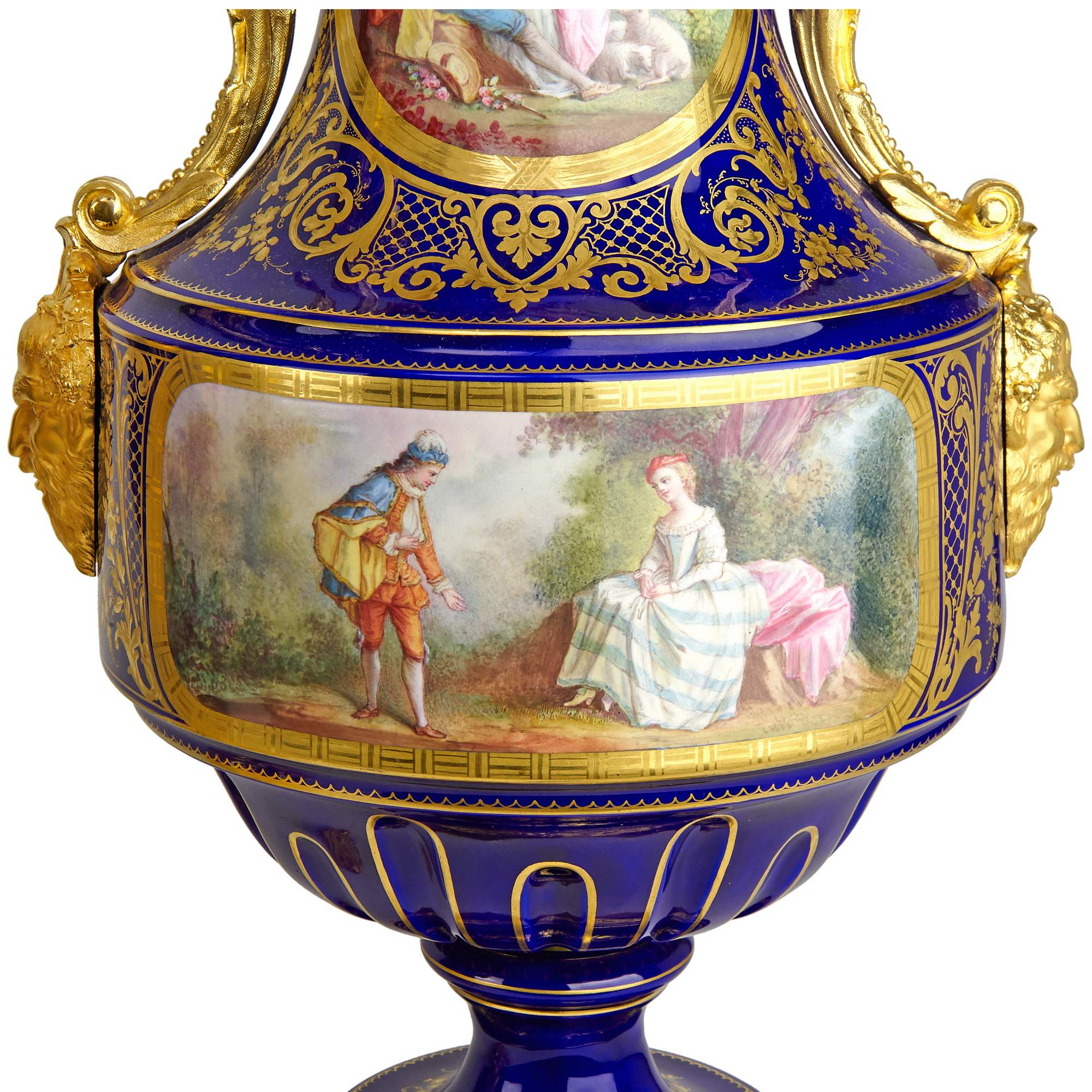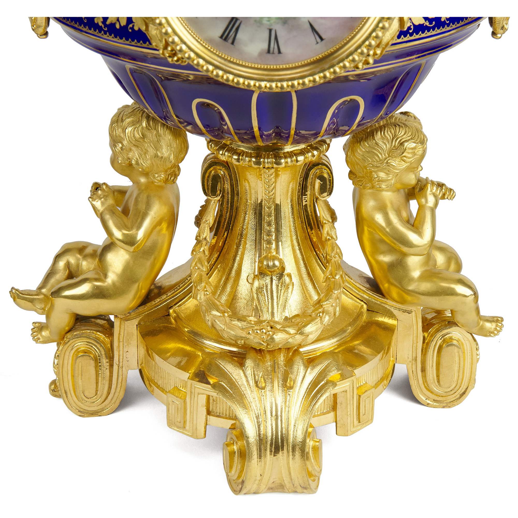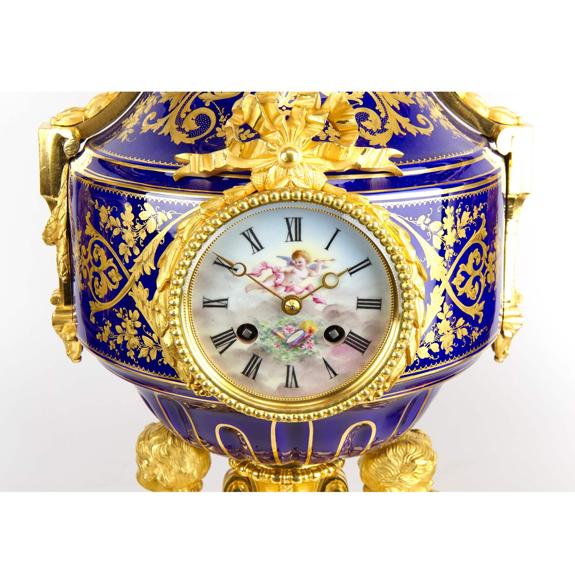 Великолепный каминный гарнитур с часами, состоящий из трех изумительных вазонов. Вазоны выполнены в форме амфоры на восьмиугольных золоченых постаментах. Постамент же центрального вазона изготовлен в виде ножки с гирляндами, по сторонам которой сидят путти. По бокам каждого вазона прикреплены бронзовые ручки искусной работы, созданные в виде элегантно изогнутых гирлянд и маскаронов. Крышки увенчаны шишками пении. Сложность исполнения вазонов кроется не только в великолепии бронзовой оправы, но и в красивейших росписях. В резервах помещены тщательно прописанные галантные сцены на фоне пейзажей. Вокруг сцен помещены изящные цированные орнаменты, еще более облагораживающие их яркий колорит. Часы, вмонтированные в фарфоровую вазу, изготовлены в часовой мастерской «Самюэль Марти и компания». Фирма была крупнейшим производителем в Франции. Ее продукция получала награды на выставках, в частности, Гран-при Парижской выставки 1934 года. Сегодня ее изделия стали достоянием крупных музеев мира. Фарфоровые вазоны были декорированы в известной парижской мастерской «Гантье и Леюжёр», отдавшими предпочтение «стилю старого Севра» (Севрской фарфоровой мануфактуры). Каминный гарнитур с часами из трех вазонов отличается высоким качеством фарфора, сложностью росписи и тщательным золочением, выполнен на высоком художественном уровне. Гарнитур имеет антикварное и музейное значение. Антиквариат. Прекрасная сохранность.