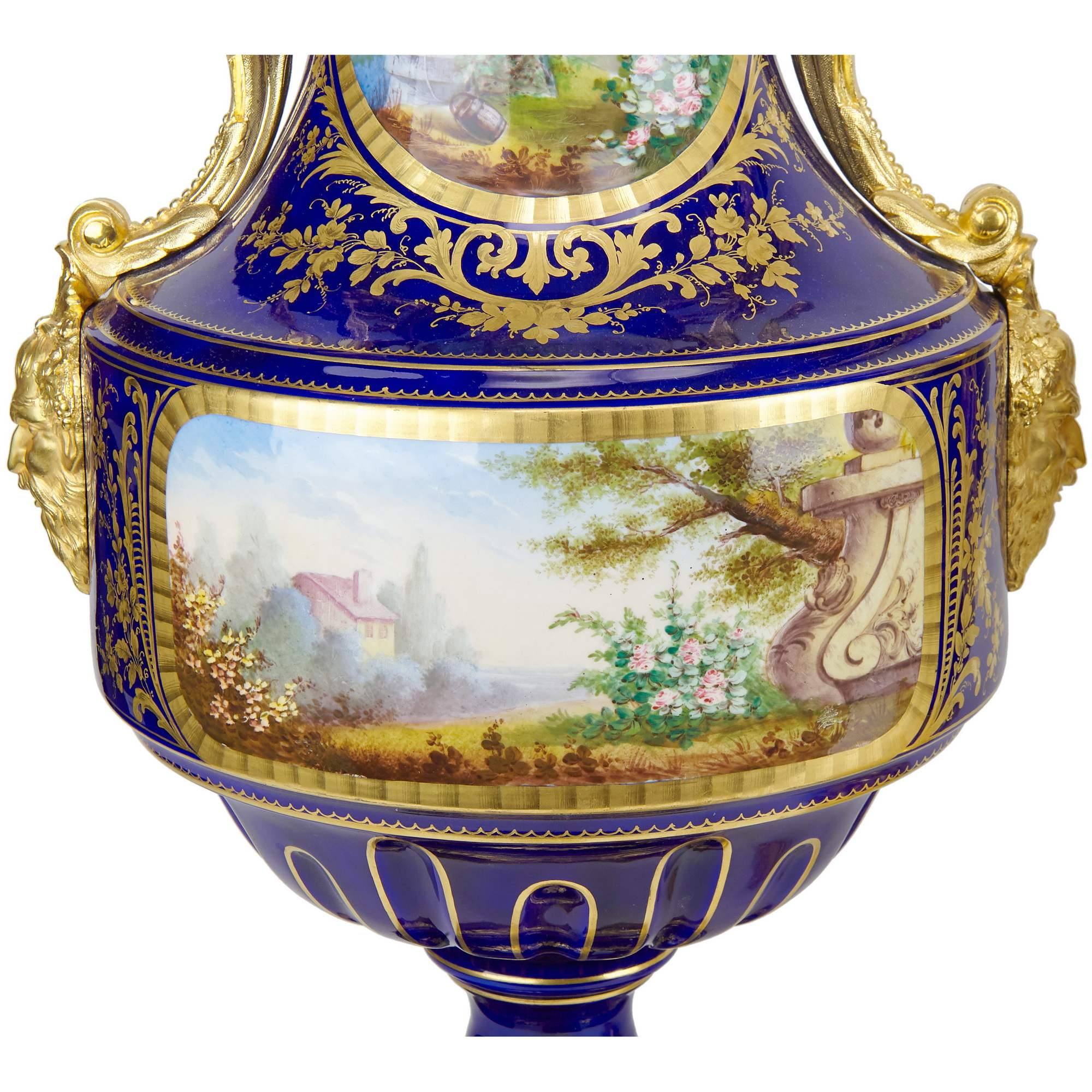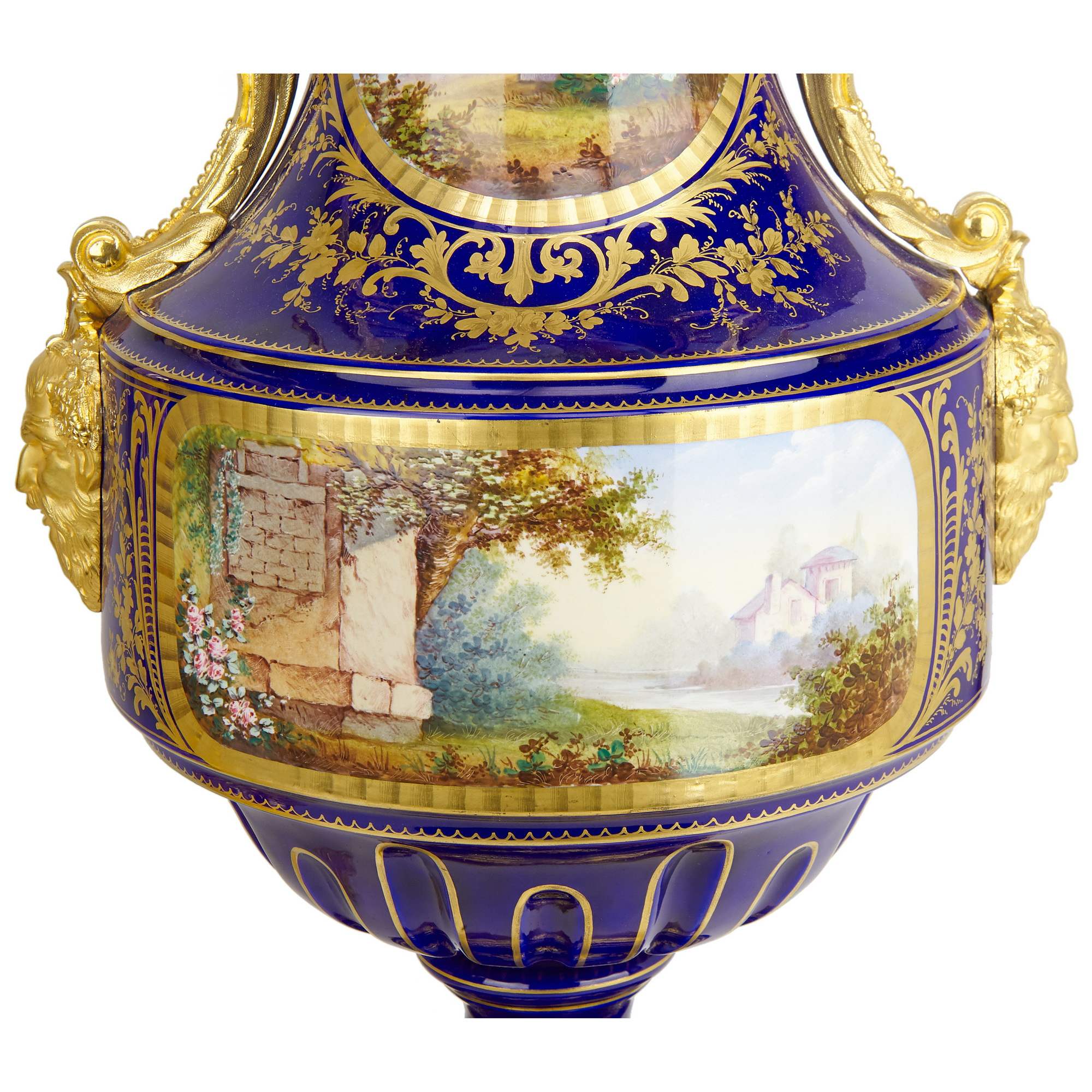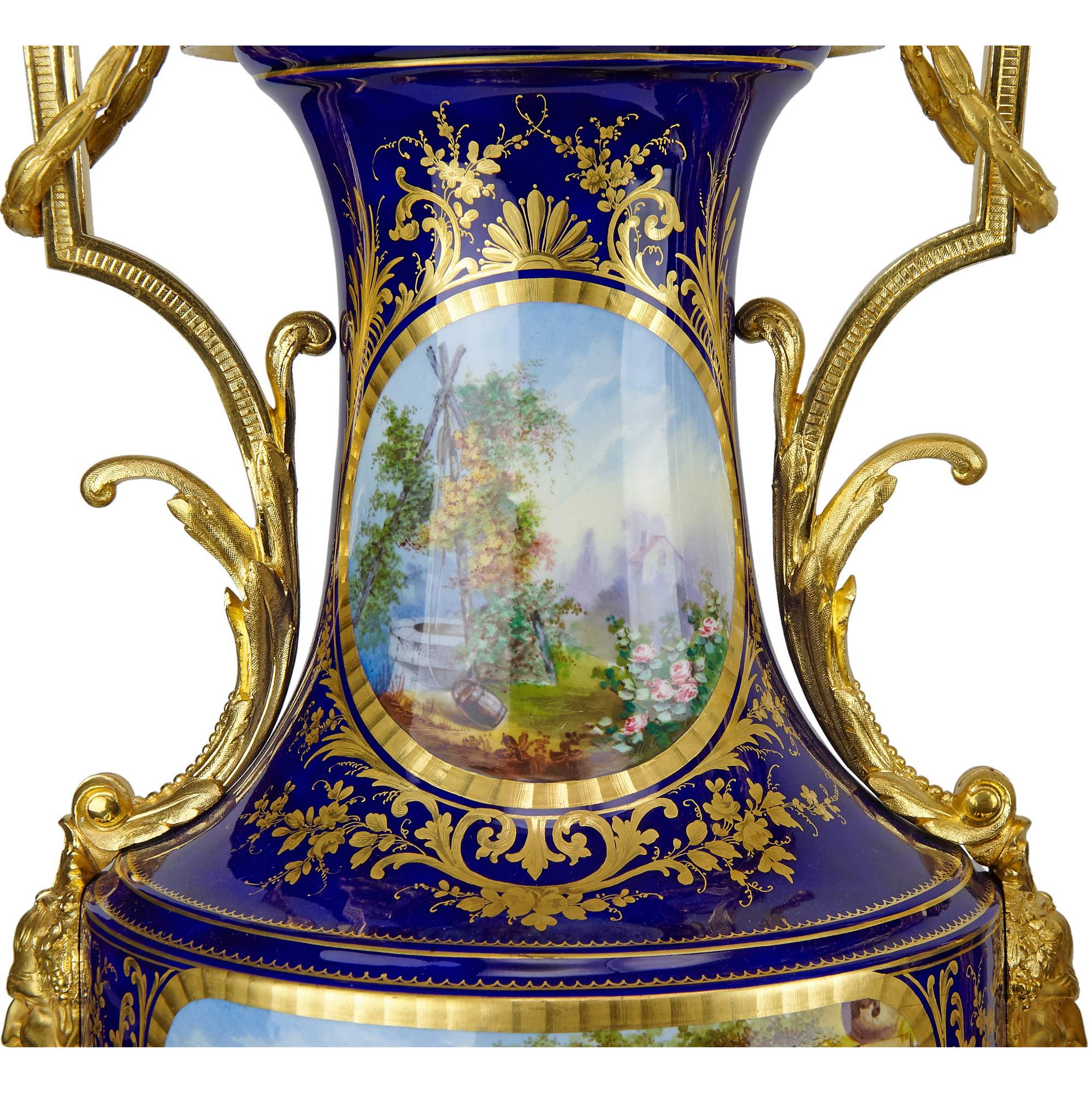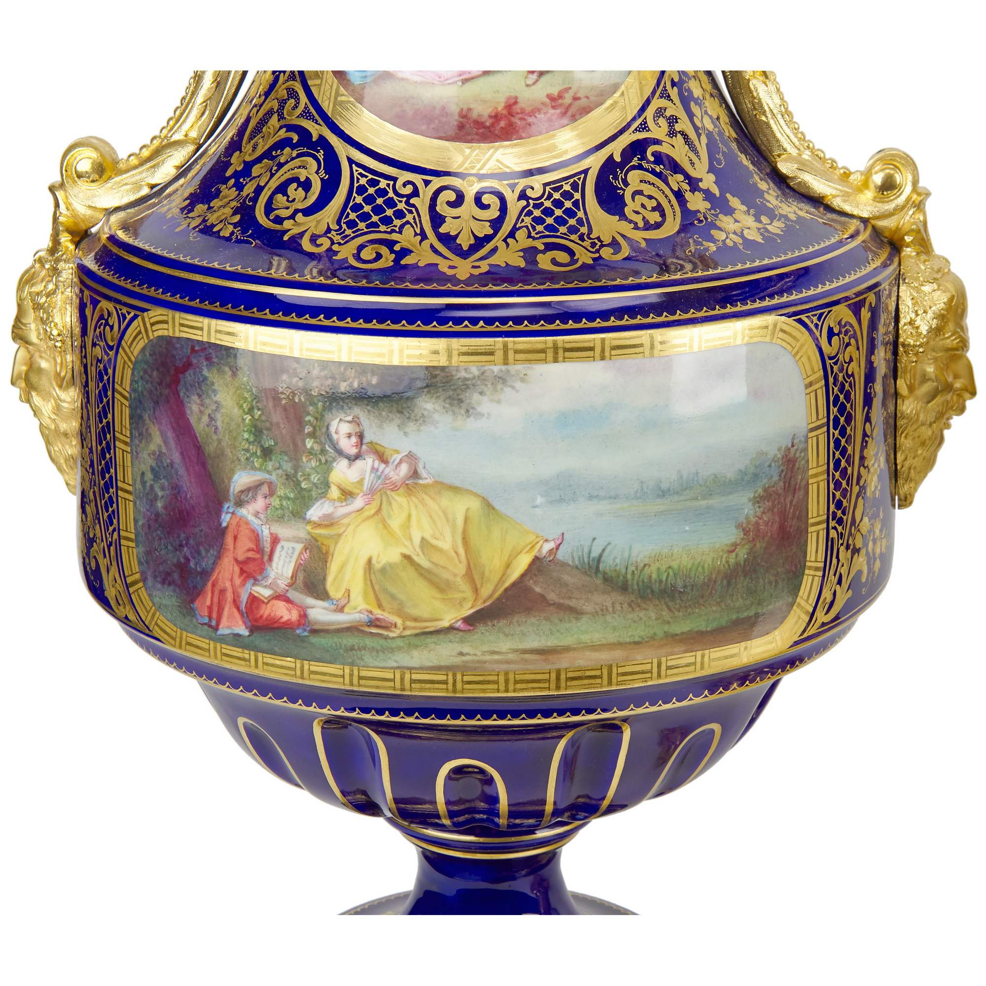 Великолепный каминный гарнитур с часами, состоящий из трех изумительных вазонов. Вазоны выполнены в форме амфоры на восьмиугольных золоченых постаментах. Постамент же центрального вазона изготовлен в виде ножки с гирляндами, по сторонам которой сидят путти. По бокам каждого вазона прикреплены бронзовые ручки искусной работы, созданные в виде элегантно изогнутых гирлянд и маскаронов. Крышки увенчаны шишками пении. Сложность исполнения вазонов кроется не только в великолепии бронзовой оправы, но и в красивейших росписях. В резервах помещены тщательно прописанные галантные сцены на фоне пейзажей. Вокруг сцен помещены изящные цированные орнаменты, еще более облагораживающие их яркий колорит. Часы, вмонтированные в фарфоровую вазу, изготовлены в часовой мастерской «Самюэль Марти и компания». Фирма была крупнейшим производителем в Франции. Ее продукция получала награды на выставках, в частности, Гран-при Парижской выставки 1934 года. Сегодня ее изделия стали достоянием крупных музеев мира. Фарфоровые вазоны были декорированы в известной парижской мастерской «Гантье и Леюжёр», отдавшими предпочтение «стилю старого Севра» (Севрской фарфоровой мануфактуры). Каминный гарнитур с часами из трех вазонов отличается высоким качеством фарфора, сложностью росписи и тщательным золочением, выполнен на высоком художественном уровне. Гарнитур имеет антикварное и музейное значение. Антиквариат. Прекрасная сохранность.