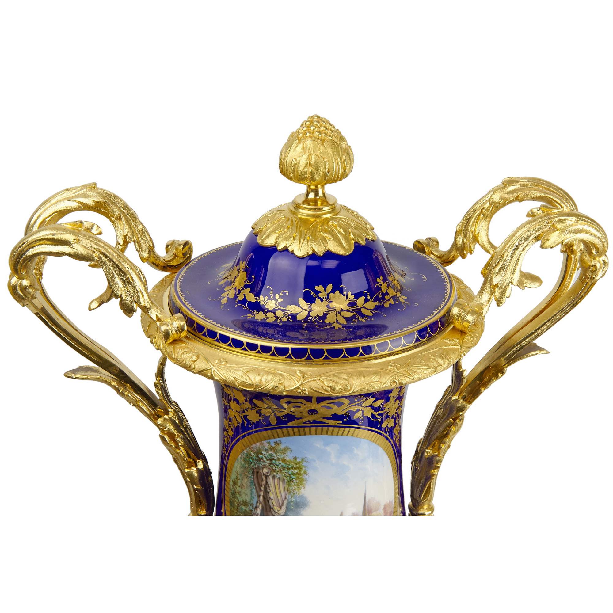 Фарфор, надглазурная полихромная роспись, крытье, золочение, цировка; бронза, чеканка, золочение, монтировка.