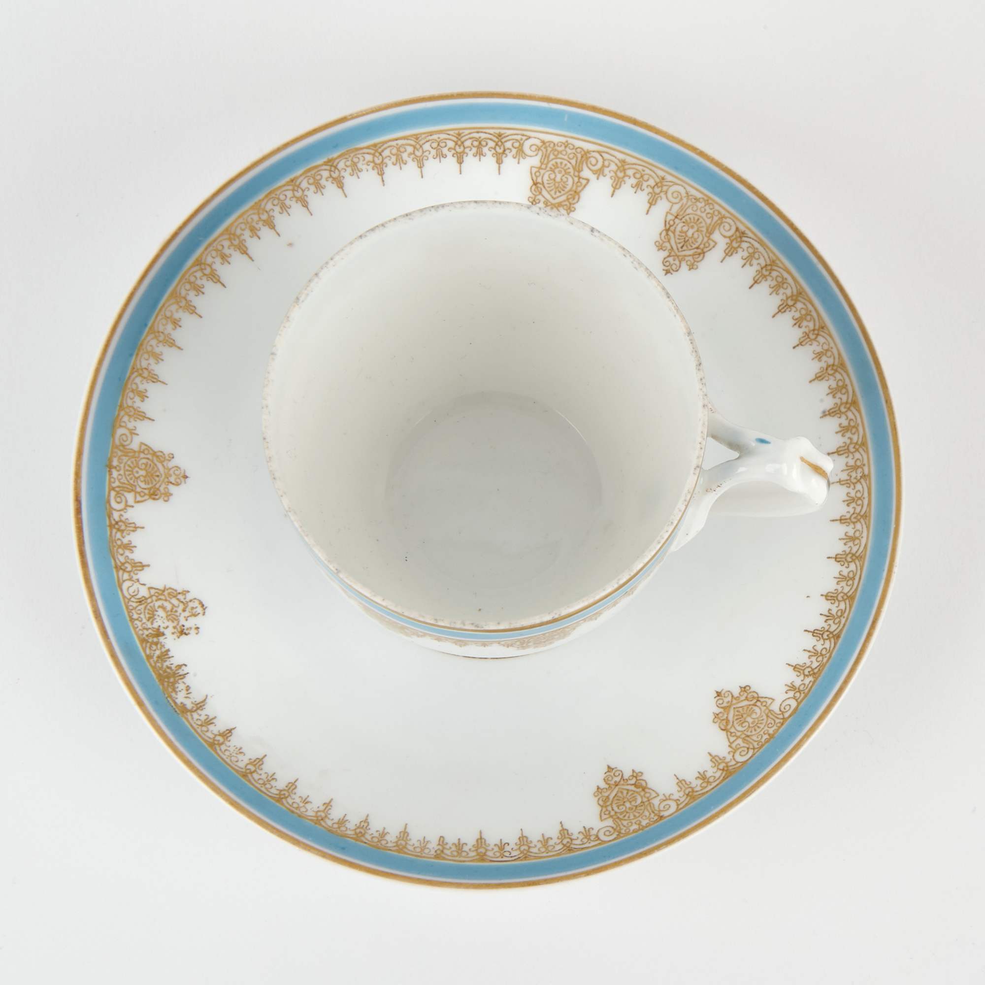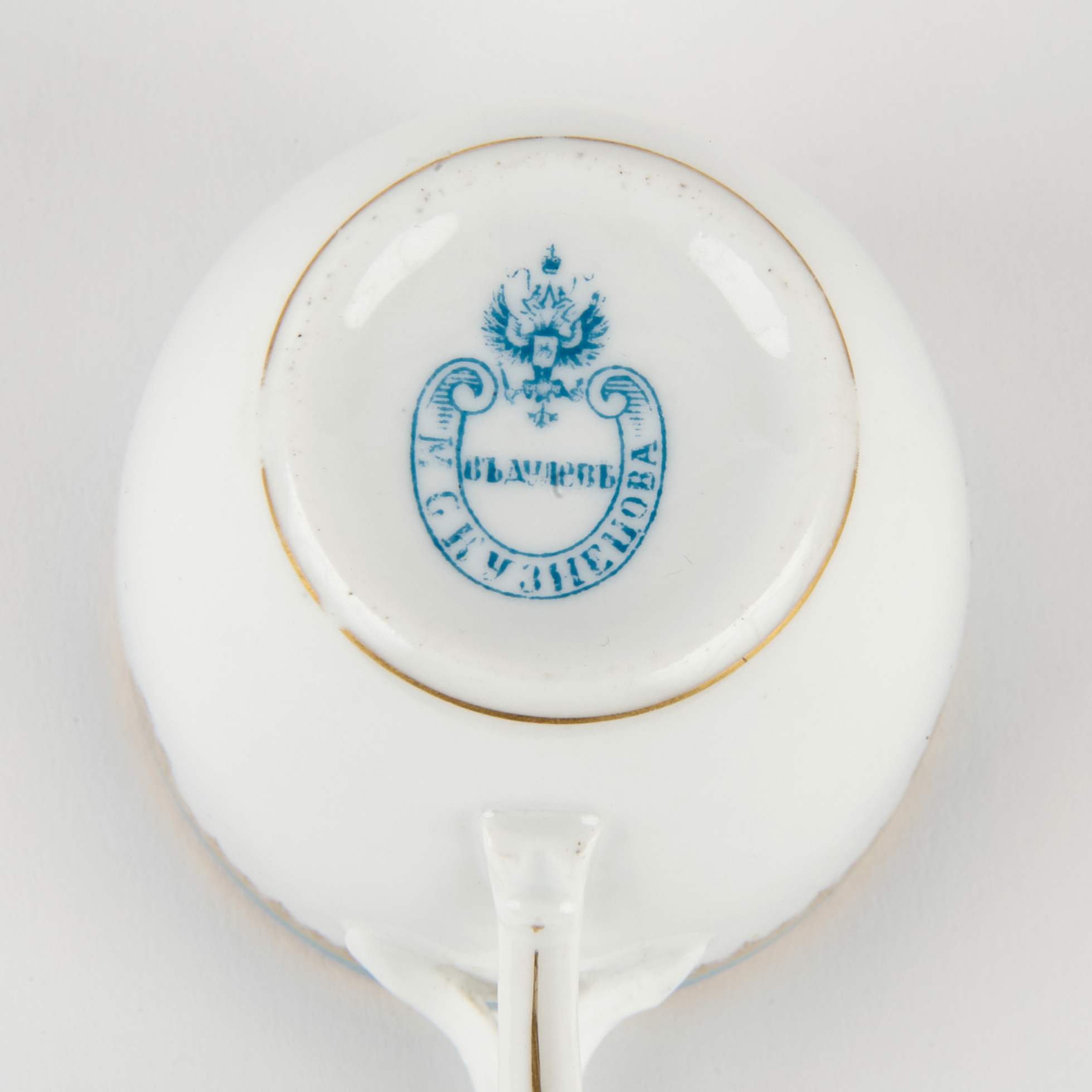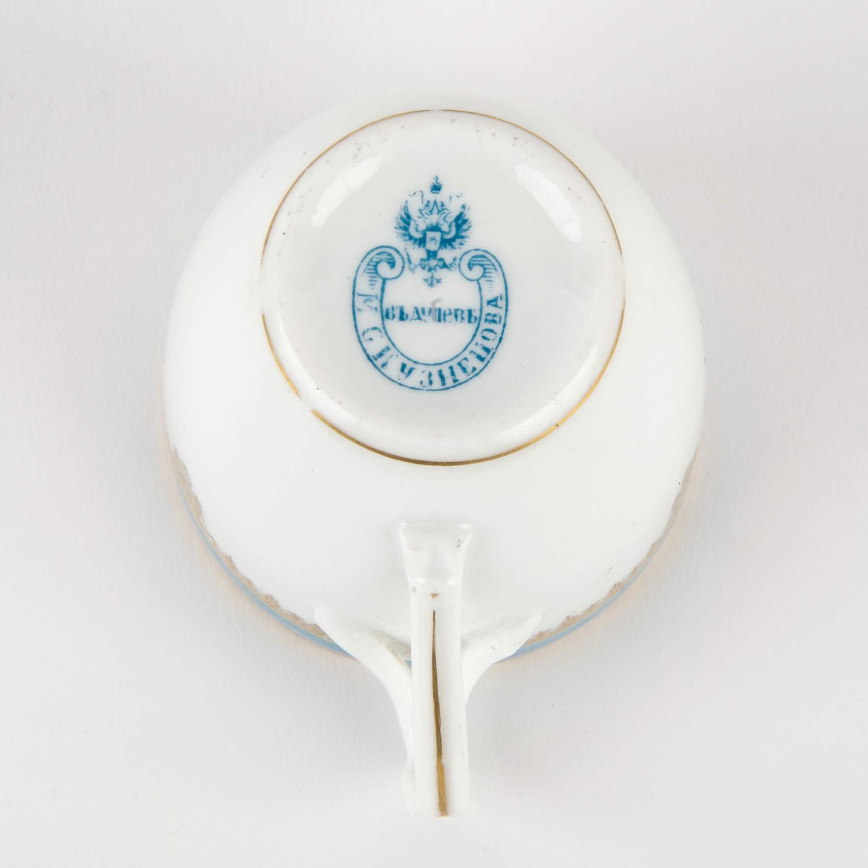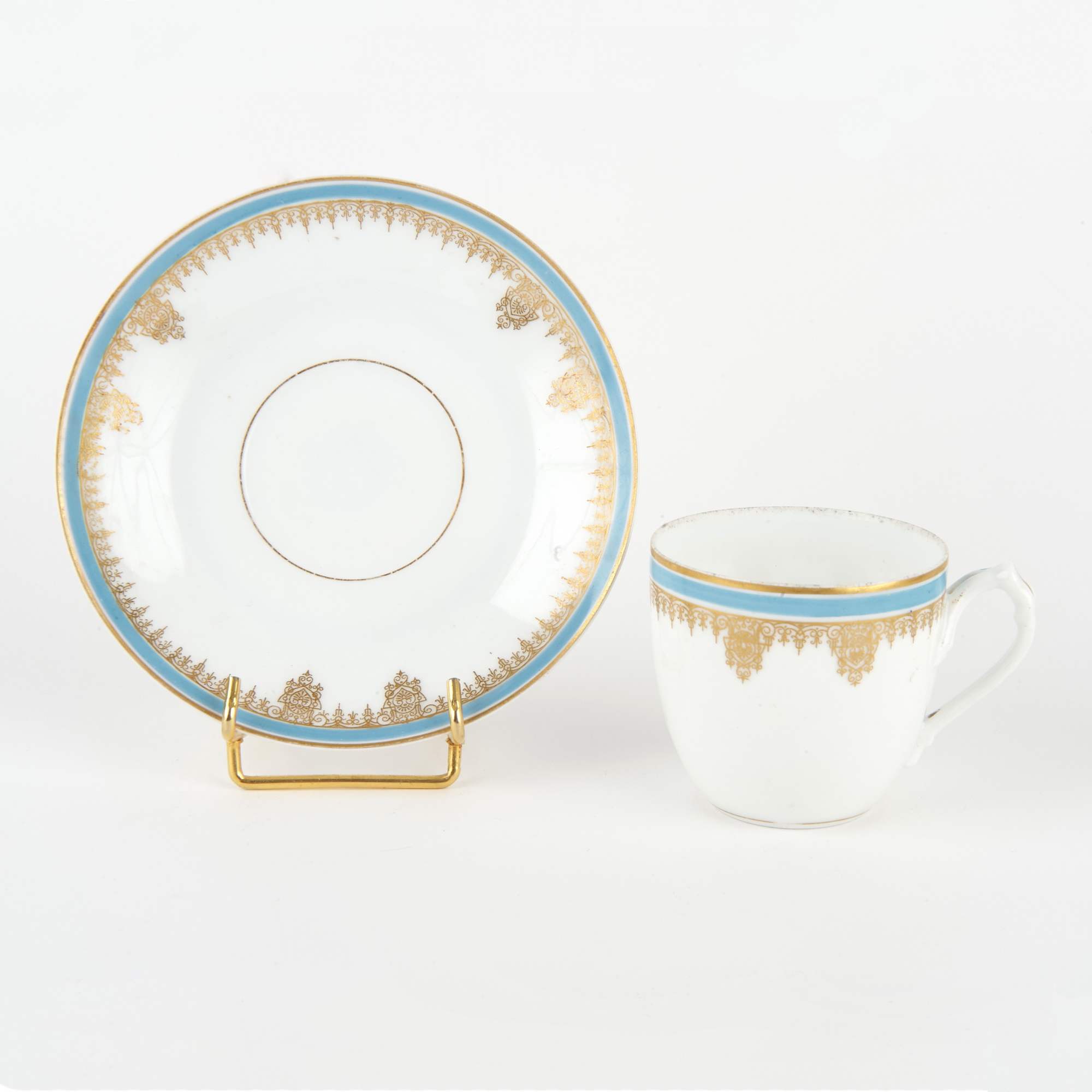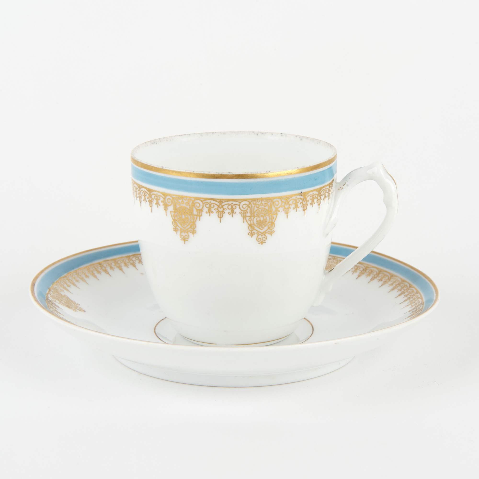 Россия. Дулёво. Завод Кузнецова. Фарфор, золочение. Чашка: Высота - 5,9 см, Диаметр - 6,2 см. Блюдце - Диаметр - 12,7 см.