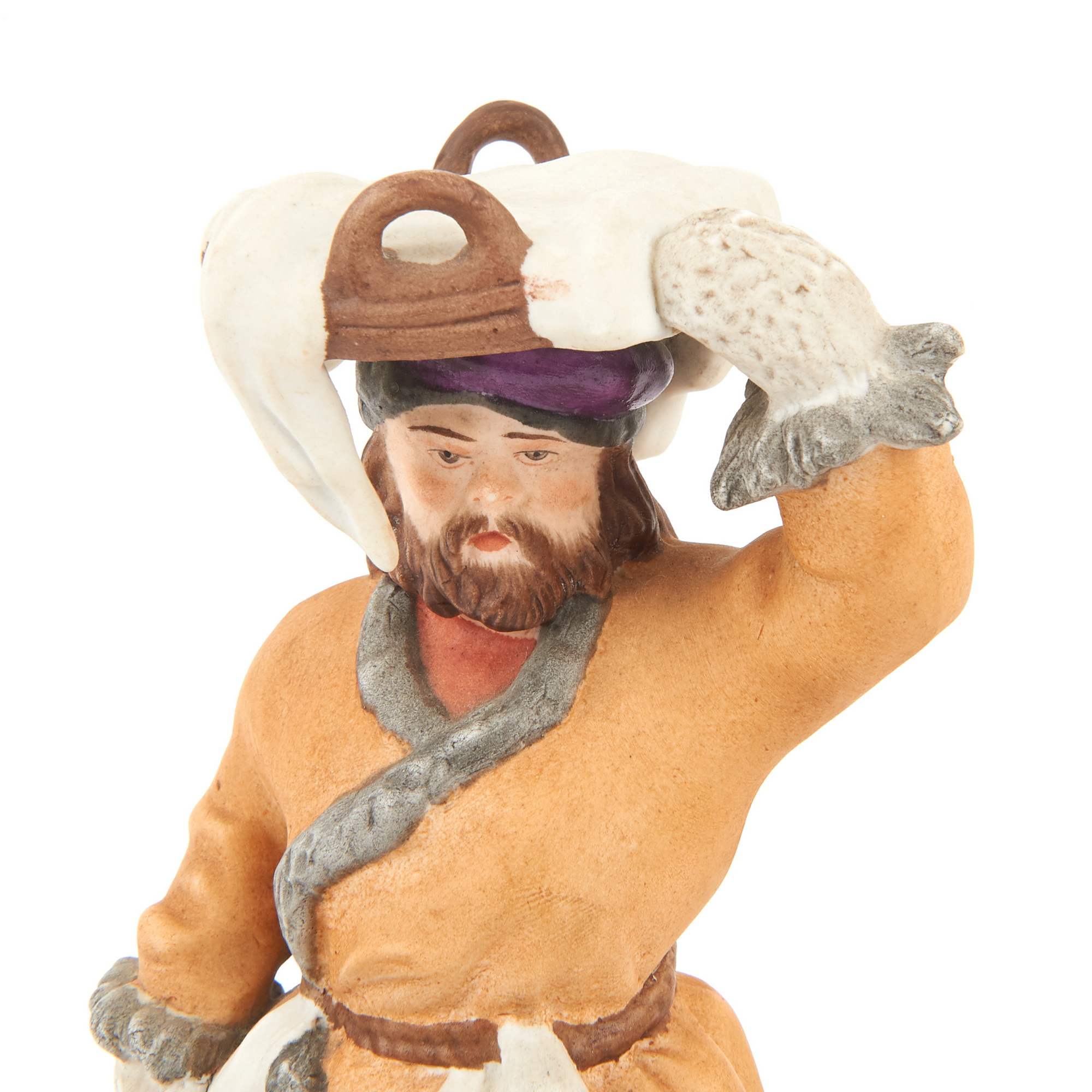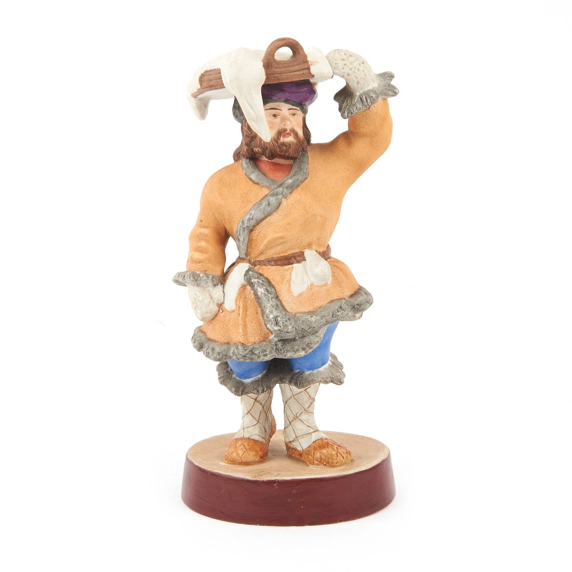 Замечательная старинная коллекционная фигура «Мужик разносчик в тулупе». Прекрасный образец продукции знаменитой фабрики Гарднерь, основанной в XVIII веке, первой частной российской фарфоровой мануфактуры. Антиквариат. Хорошая сохранность ( на лапте левой ноги имеется «родная трещинка).
