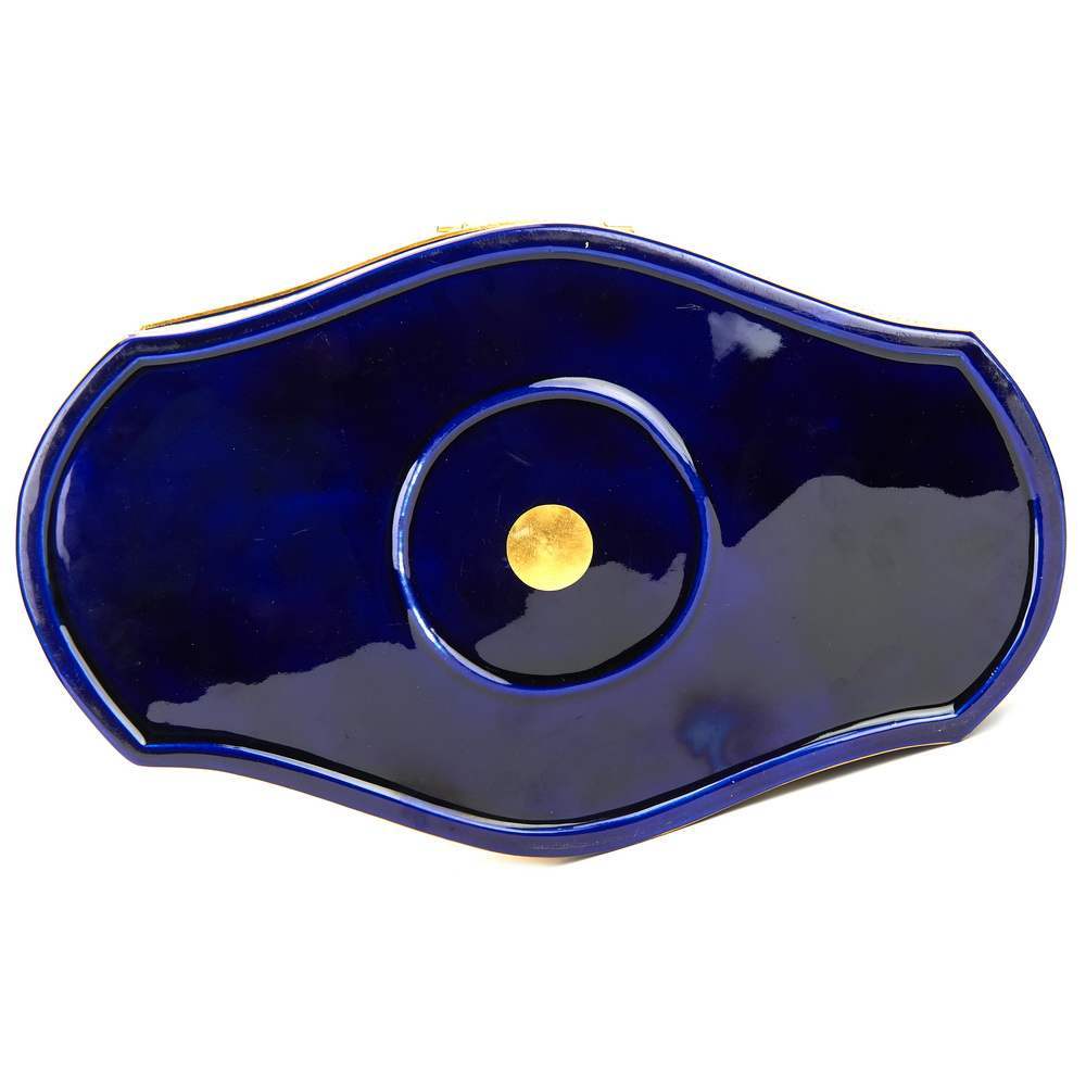 Мягкий фарфор, бронза, подглазурное крытье кобальтом, надглазурная полихромная роспись, золочение, литье, чеканка, монтировка.