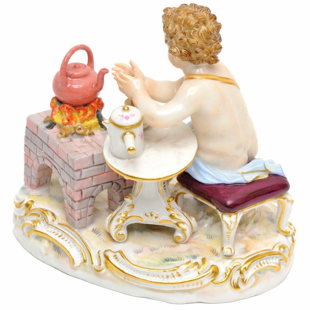 Очаровательная статуэтка «Путто готовящий горячий шоколад». Великолепный образец продукции знаменитой мейссенской мануфактуры, колыбели европейского фарфора. Поражает качество с которой исполнена модель; лепка, роспись, каждый волосик выписан, тщательная детализация, тончайшая роспись золотом.