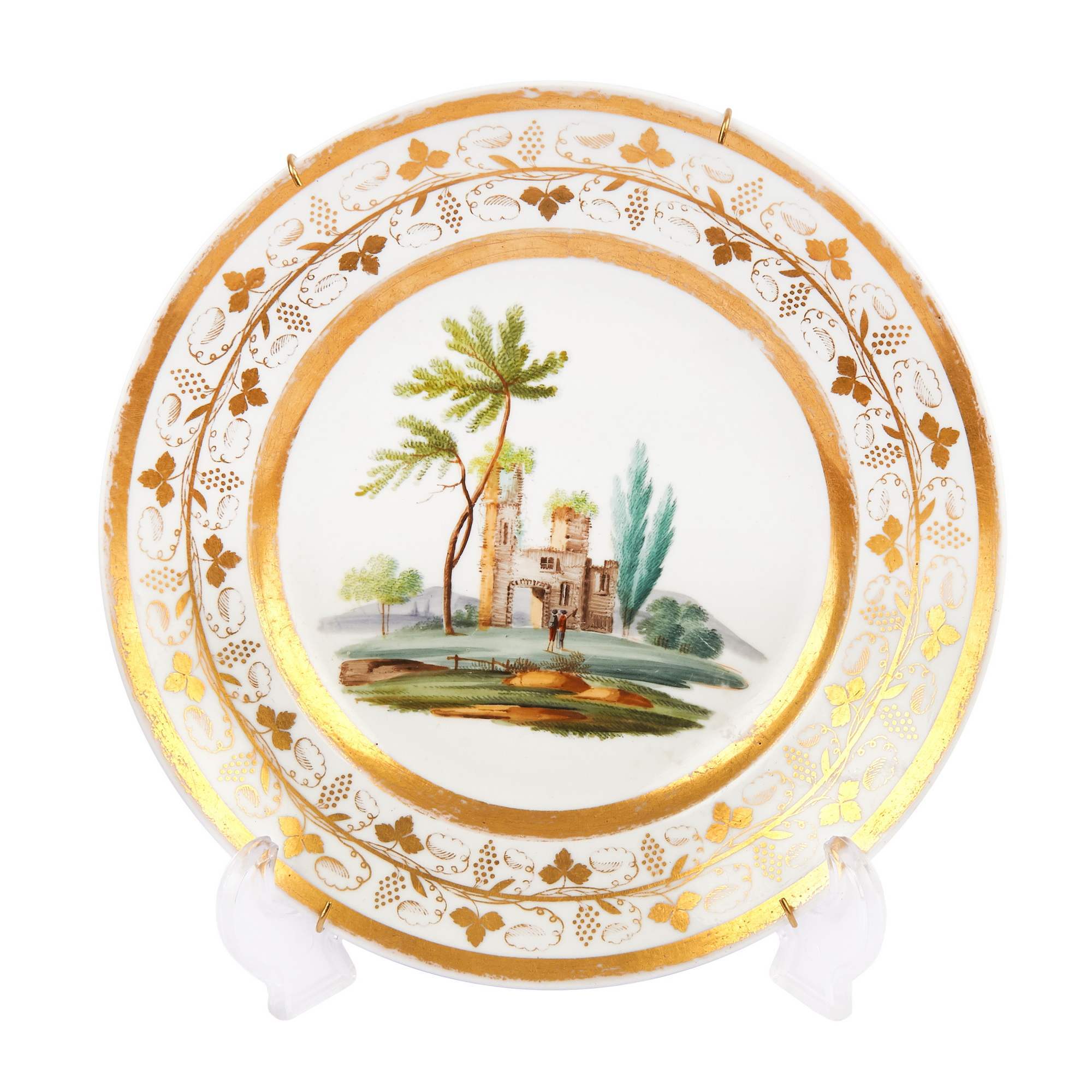 Старинная тарелка с архитектурным пейзажем и росписью золотом. Данная тарелка яркий образец продукции одной из лучших частных фабрик царской России купца Попова, находившейся в селе Горбуново Дмитровского уезда. Изготовлена в 1840-50-е года. Изделие покрыто сложной полихромной росписью, росписью золотом. Изделия завода украшают многие собрания и музеи страны. Изделия фабрики являются объектами пристального собирательства и коллекционирования. Антиквариат. Хорошая сохранность. Тарелка с такой росписью , середины 19-го века, является интересной находкой для коллекционеров. Незначительные потертости.