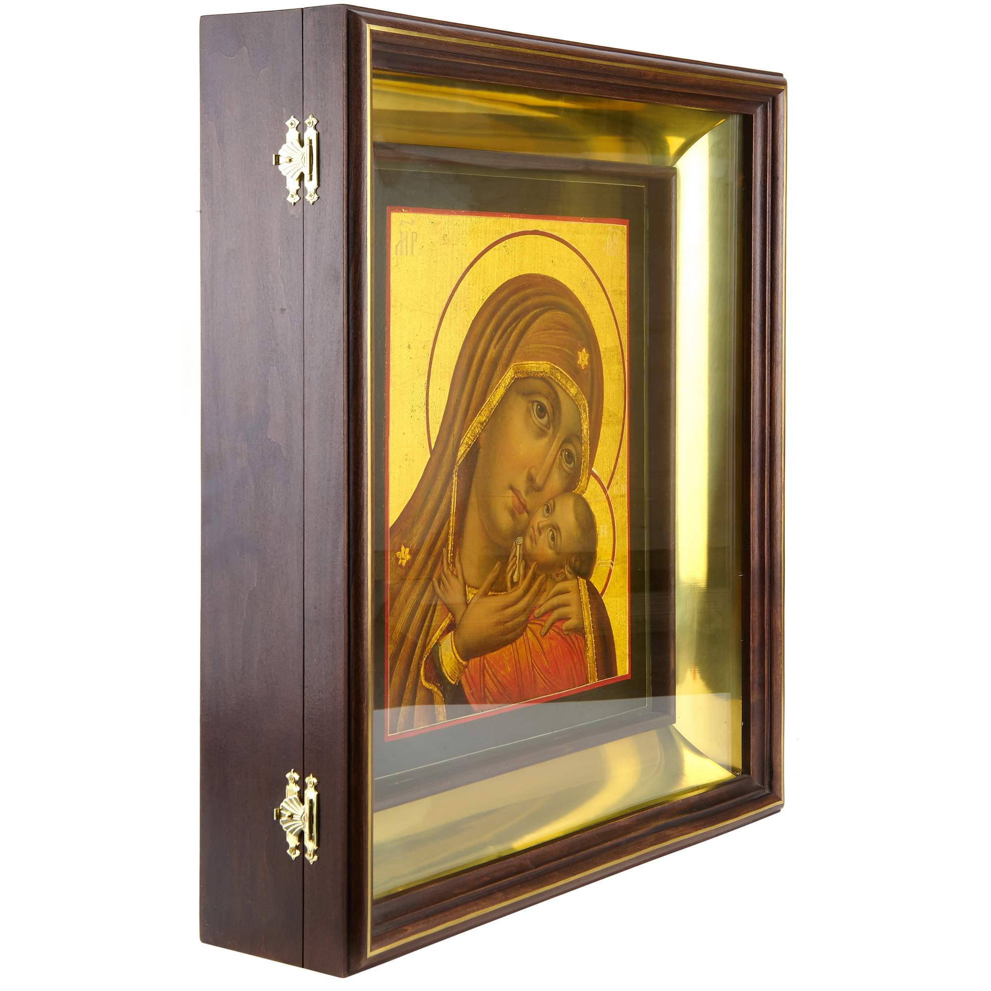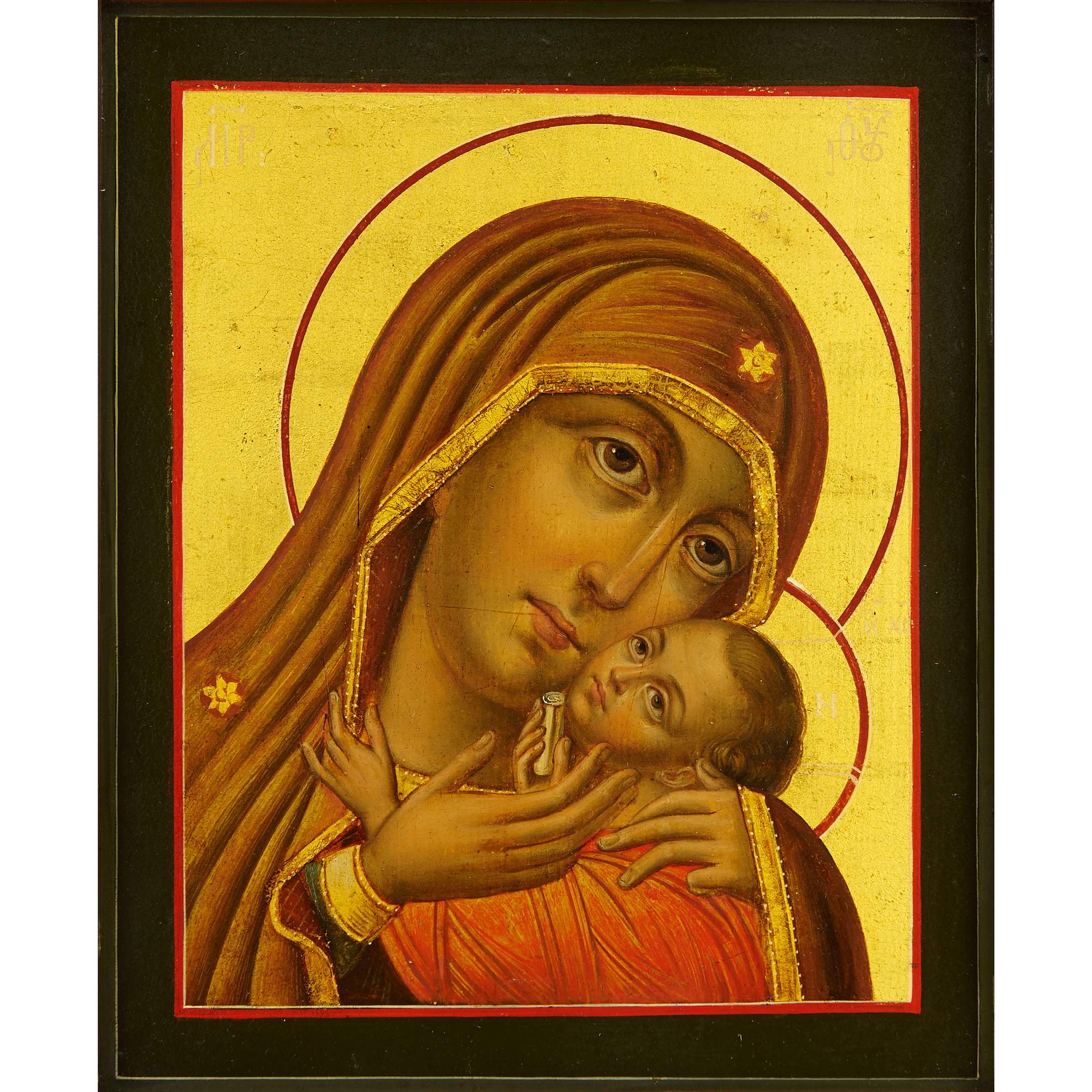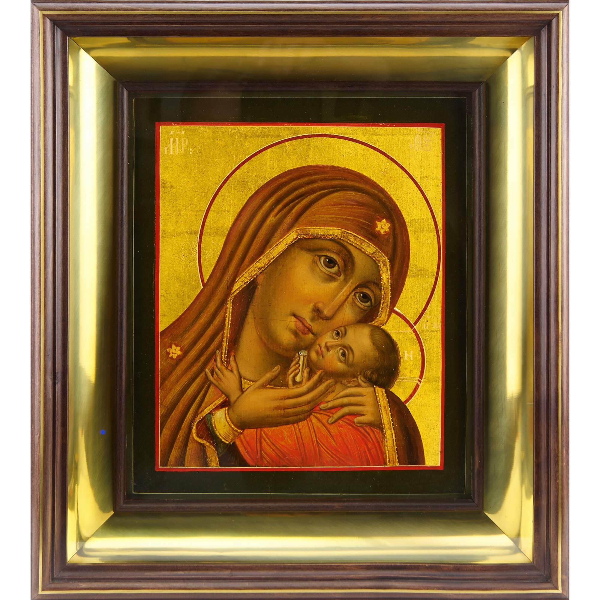 Изумительная старинная икона Богоматери Корсунской, созданная в последней четверти XVIII века. Качественное письмо в грецизирующей манере исполнено профессиональным иконописцем, ориентирующимся на творчество мастеров Оружейной палаты. Личное выполнено с использованием традиций живоподобия - особой возвышенной иконописной манеры, особенно востребованной с XVII века в России. Гармоничные пропорции, аккуратная графичность, превосходно переданные черты ликов с легкой подрумянкой - все это свидетельствует о незаурядном таланте мастера-иконописца. Прописанные пряди волос Младенца, золотопробельные разделки одежд, золотой фон и эффектное обрамление полей ясно показывают, что автор иконы не только в полной мере владел художественными приемами, но и умел грамотно применить их для создания великолепного образа. Немаловажным будет отметить его особо хорошую сохранность, что встречается крайне редко, учитывая время создания.