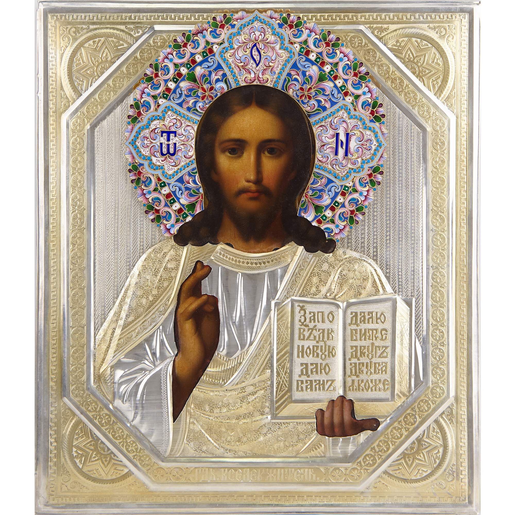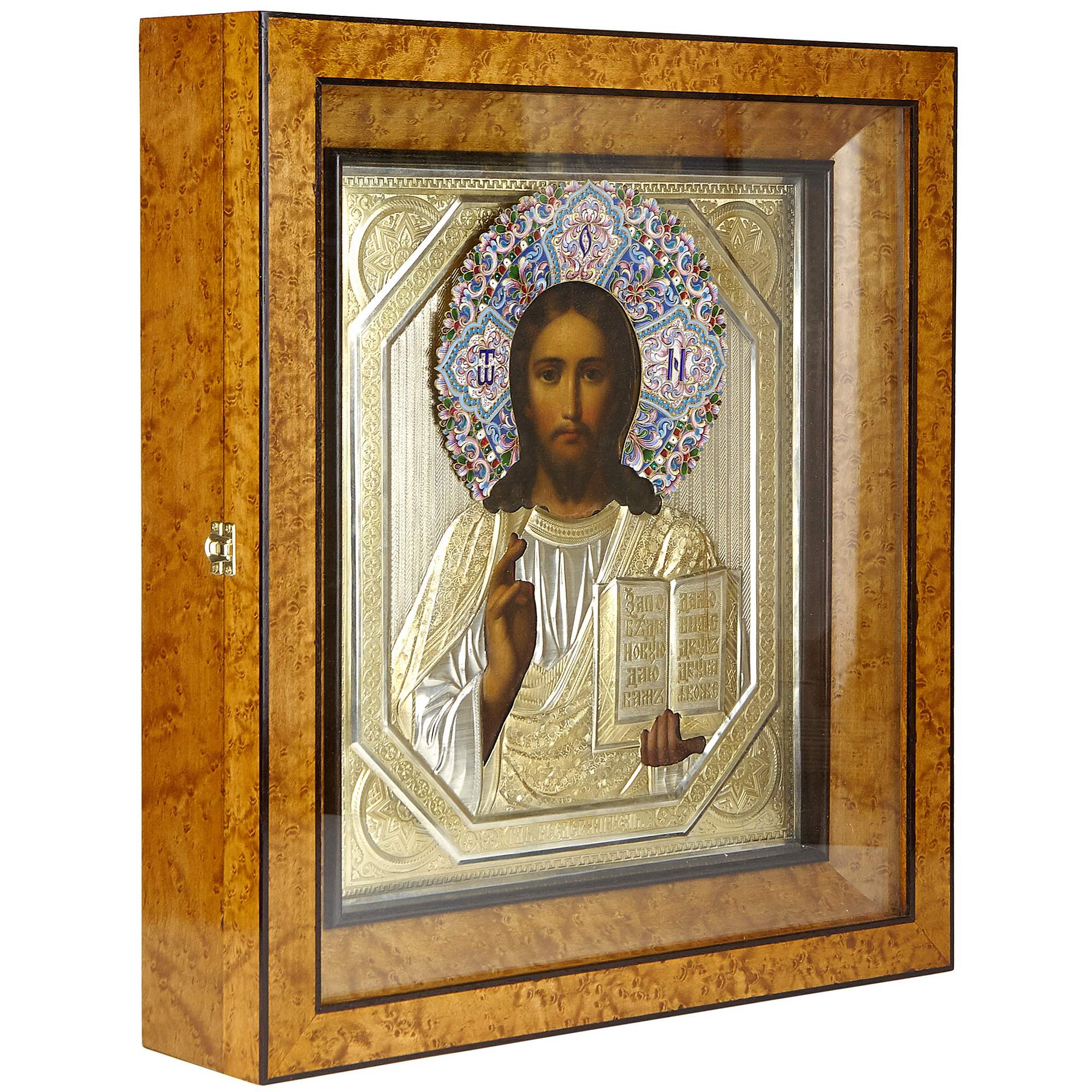 Красивая старинная икона Господь Вседержитель. Мягкая высокопрофессиональная академическая живопись гармонично сочетается с безупречно исполненным декором оклада. Отчетливо передана в серебре фактура одежд Спасителя, а большую часть серебряной поверхности покрывает изящный орнамент. Золоченые и серебряные элементы создают плавный контраст, подчеркивая прекрасно написанное личное. Особого внимания заслуживает изумительной работы венец. Выполненный в технике эмали по скани, он изобилует до мельчайших деталей проработанными орнаментами, чья нежная и, в то же время богатая палитра добавляет художественному ансамблю великолепия. Икона написана профессиональным московским иконописцем, хорошо владеющим приемами академического письма, способным создать невероятно выразительный образ. Уровень исполнения оклада выдает руку безусловно талантливого и опытного художника-ювелира, который работал на известной московской фирме «Захарова И. В., сыновья», чьи изделия славились отменным качеством. Образ Господа Вседержителя известен в православном мире еще со времен появления Византийской Империи, являясь одной из самых древних иконографий Спасителя. Изображение Иисуса Христа, согласно уставу церкви обязательно является центральным в храмовом иконостасе, непременно входит в состав домашнего ряда икон, а также всегда становится частью состава венчальной пары. Красивый образ Господа Вседержителя в серебряном окладе имеет коллекционное, историко-культурное и музейное значение.