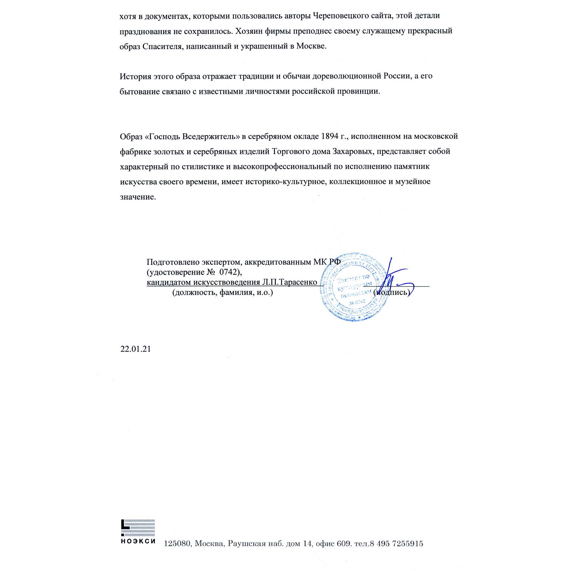 Экспертное заключение зав. отделом древнерусской живописи ГИМ кандидатом искусствоведения Л. П. Тарасенко. Экспертиза МК.