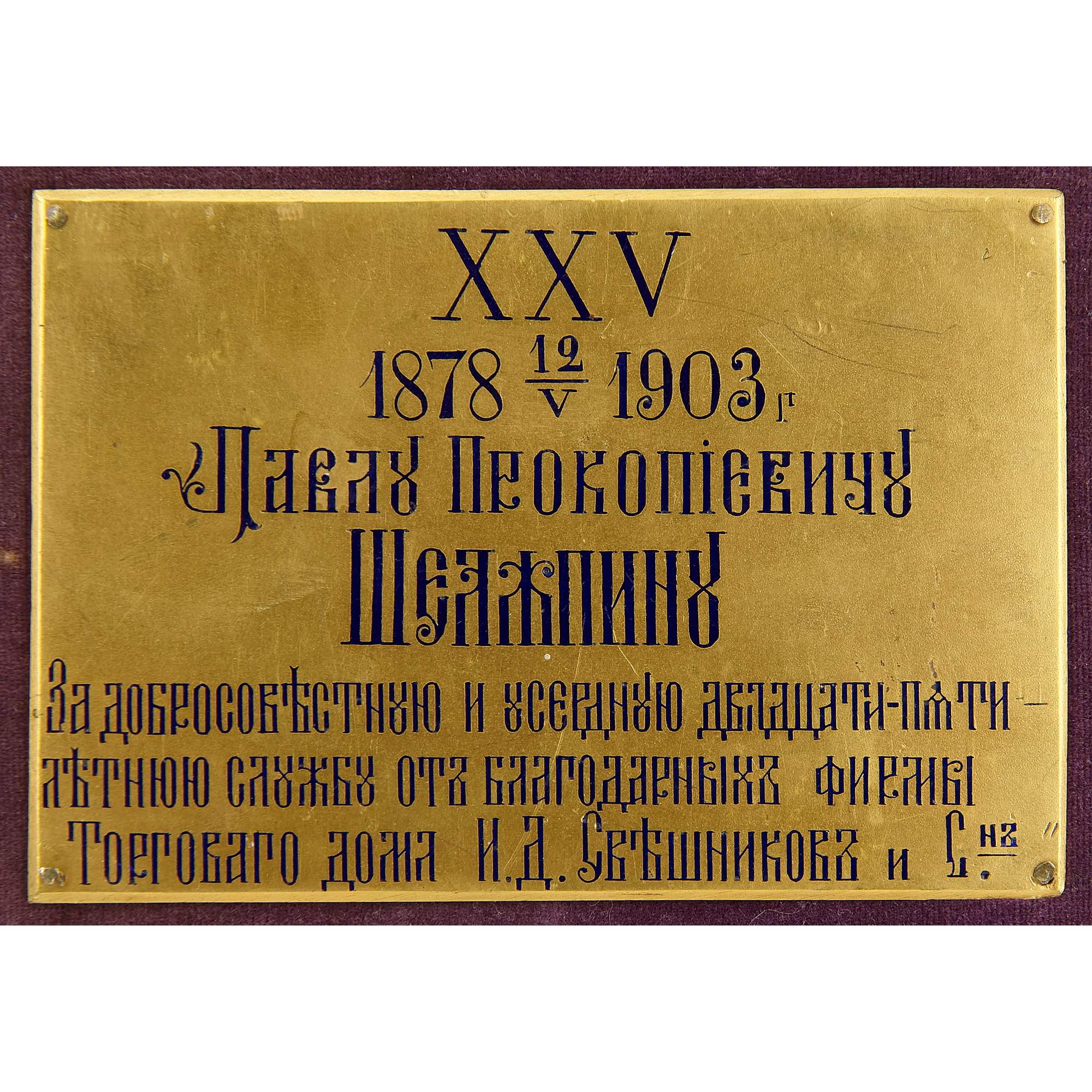 Как свидетельствует табличка на обороте, представленный образ в окладе был подарен фирмой «Свешниковъ и Съ» управляющему их магазином в Череповце Шелепину Павлу Прокофьевичу, прослужившему в нем более 25 лет, память об этом торговом доме и роде Шелепиных бережно хранится земляками, отражена в тематических музеях и собраниях города Череповца.